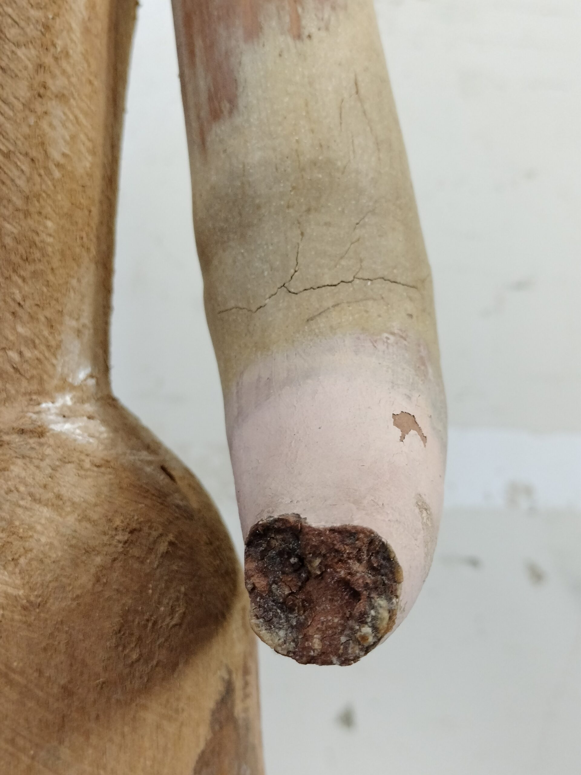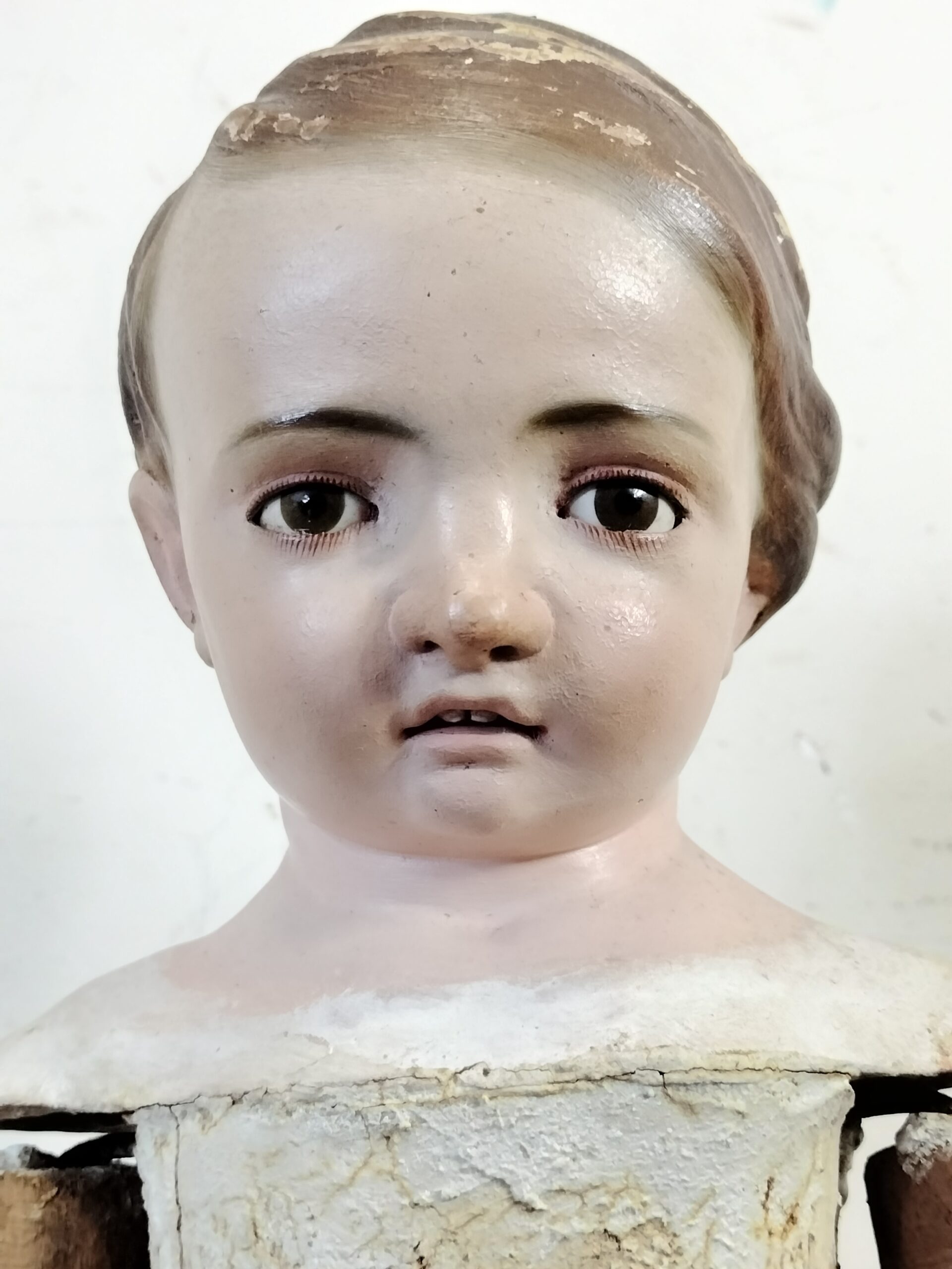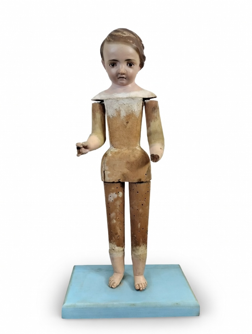 VER IMÁGENES PARA COMPROBAR EL ESTADO REAL. LAS IMÁGENES FORMAN PARTE DE LA DESCRIPCIÓN. FIGURA INFANTIL O NIÑO JESÚS. TALLA CAP I POTA. MADERA POLICROMADA. SIN FIRMA NI MARCA DE AUTOR. BASE EN MADERA POLICROMADA EN AZUL. DOS AGUJEROS EN LA NUCA, SEGURAMENTE PARA COLOCAR LA CORONA O LA AUREOLA. ROSTRO Y PIES BIEN CONSERVADOS. CUERPO CON NOTABLES RESTOS DE CARCOMA. LE FALTA UNA MANO Y DOS DEDOS DE LA OTRA. MEDIDAS: 54,5 CM ALTO. BASE: 27 X 14,5 CM.