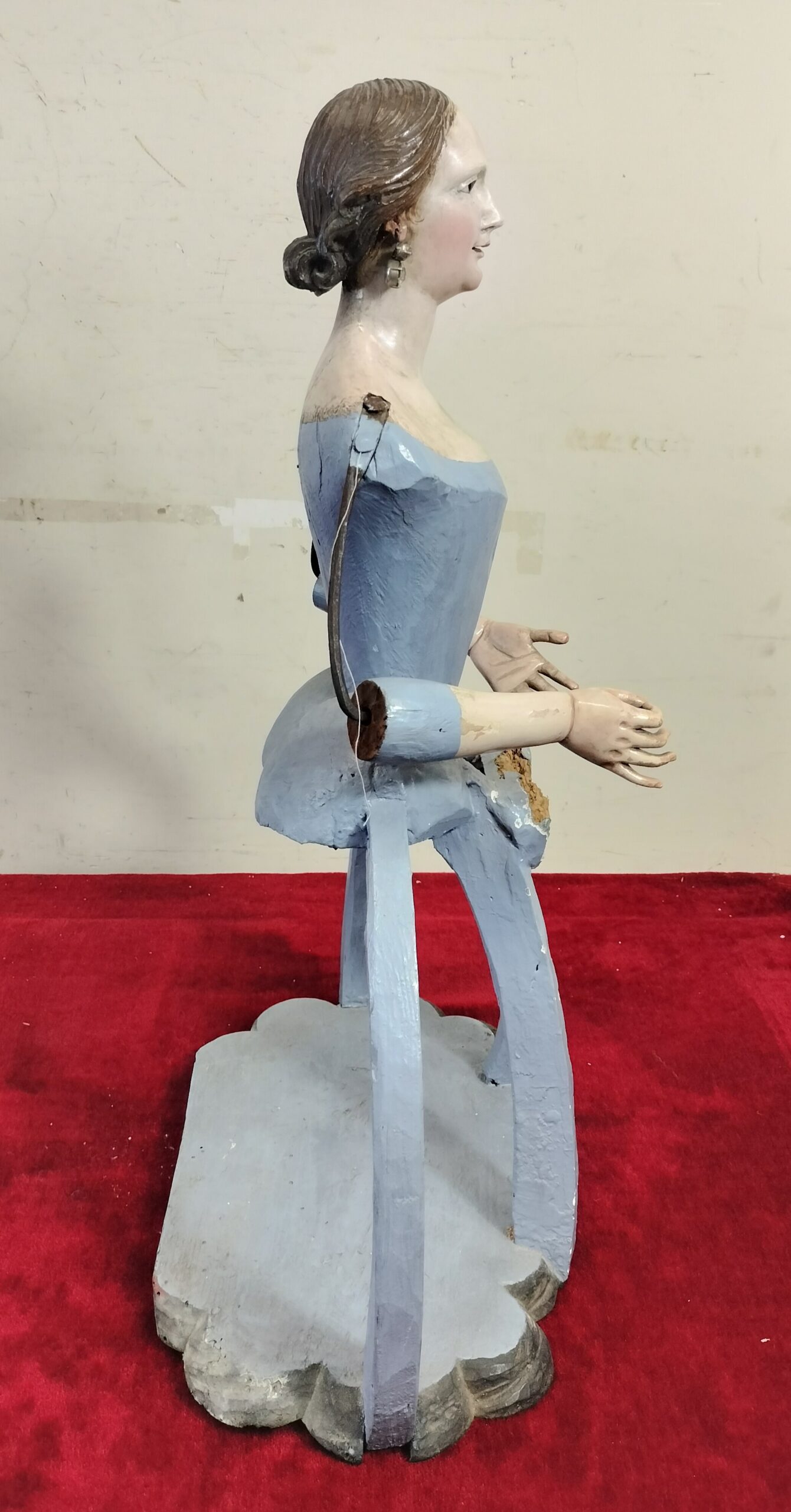 VER IMÁGENES PARA COMPROBAR EL ESTADO REAL.  LAS IMÁGENES FORMAN PARTE DE LA DESCRIPCIÓN.  LOS PRECIOS DE EXPEDICIÓN SON ORIENTATIVOS.  CONTACTE CON NOSOTROS PARA CALCULARLOS SEGÚN SU CASO.  MAGNÍFICA DAMA BARROCA O VIRGEN VESTIDERA. MADERA POLICROMADA. CIRCA 1750. BARROCO NAPOLITANO O VALENCIANO. CON ACCESORIOS: PENDIENTES Y ROSARIO.  SE INCLUYEN ATUENDOS Y COMPLEMENTOS CON ENCAJES BRODADOS, HILOS METÁLICOS Y INCRUSTACIONES AZULES.  LAS MEDIDAS SE ENCUENTRAN EN LAS IMÁGENES. NOTABLES DESGASTES EN LOS TEJIDOS, CON VARIAS ROTURAS Y MANCHAS DE SUCIEDAD. ESTRUCTURA DE METAL, CON RESTOS DE ÓXIDO.  PRESENTA NOTABLES RESTOS DE SUCIEDAD, FRACTURAS Y DESPORTILLAMIENTOS, ESPECIALMENTE EN LA PARTE DELANTERA. SE RECOMIENDA UNA LIMPIEZA PROFESIONAL.  MEDIDAS APROXIMADAS:  BASE: 36 X 20,5 CM.  ALTURA TOTAL: 56,5 CM