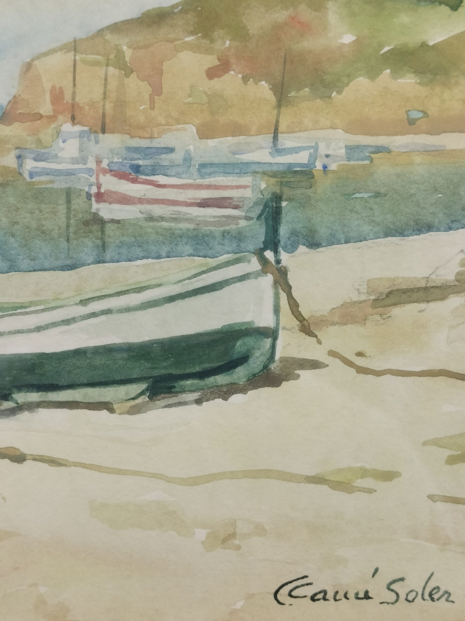 CONCEPCIÓN CAMÍ SOLER. MARINA, EMBARCACIONES EN LA PLAYA. ACUARELA SOBRE PAPEL. ESPAÑA. SIGLO XX