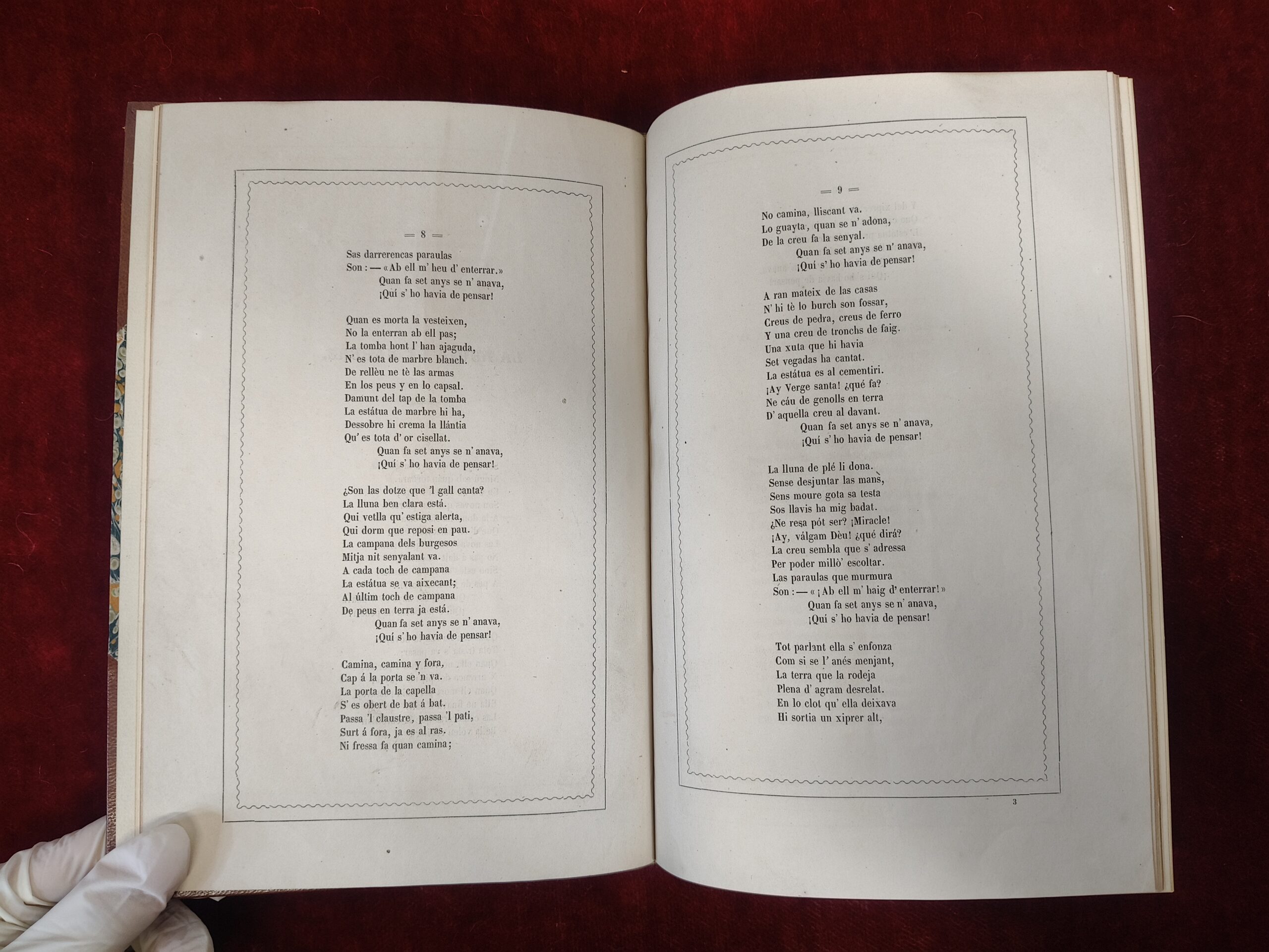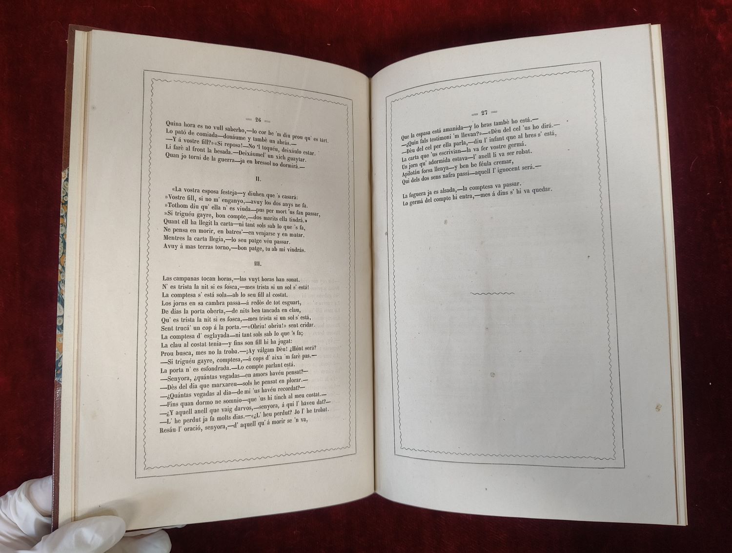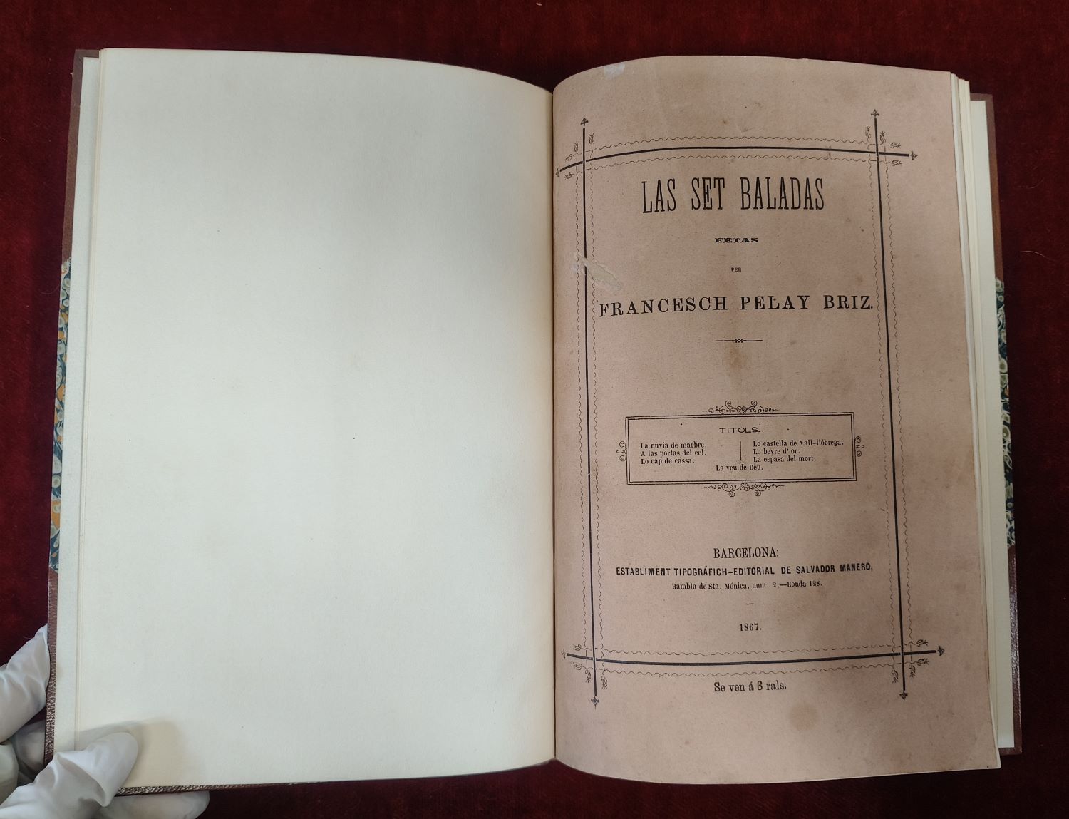 VER IMÁGENES PARA COMPROBAR EL ESTADO REAL. LAS IMÁGENES FORMAN PARTE DE LA DESCRIPCIÓN. LAS SET BALADAS FETAS. UNA OBRA DEL ESCRITOR Y FOLCLORISTA CATALÁN FRANCESC PELAGI BRIZ. EL LIBRO ES UNA RECOPILACIÓN DE BALADAS, UN GÉNERO POÉTICO DE CARÁCTER NARRATIVO Y LÍRICO QUE BRIZ CULTIVÓ CON ÉXITO PARA REVITALIZAR LA LENGUA CATALANA. DEBIDO A SU ANTIGÜEDAD, ESTE LIBRO SE ENCUENTRA PRINCIPALMENTE EN EL MERCADO DE COLECCIONISMO Y LIBRERÍAS DE VIEJO. SE CONOCEN EDICIONES ANTIGUAS, COMO LA DE 1878 Y VERSIONES ANTERIORES PUBLICADAS POR ESTABLECIMIENTOS TIPOGRÁFICOS COMO EL DE SALVADOR MANERO EN BARCELONA. EJEMPLAR EN IDIOMA CATALÁN. ENCUADERNACIÓN EN TAPA DURA. EN BUEN ESTADO GENERAL. CON ALGUNA MANCHA DE ÓXIDO EN ALGUNA PÁGINA.