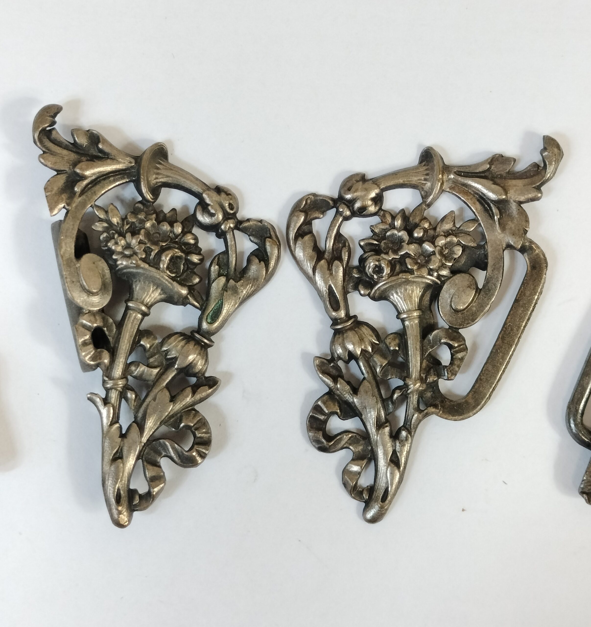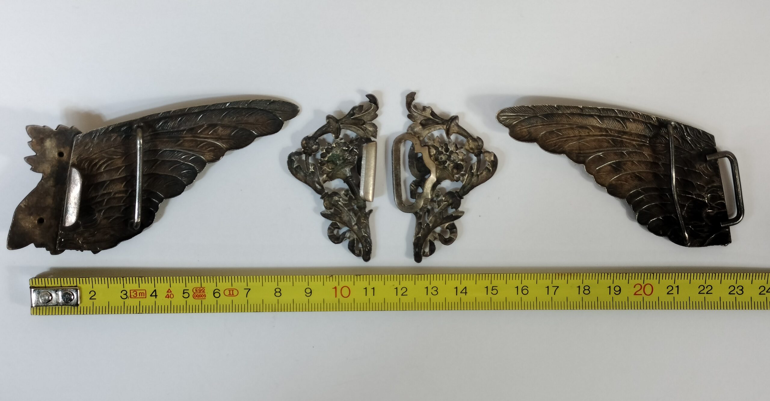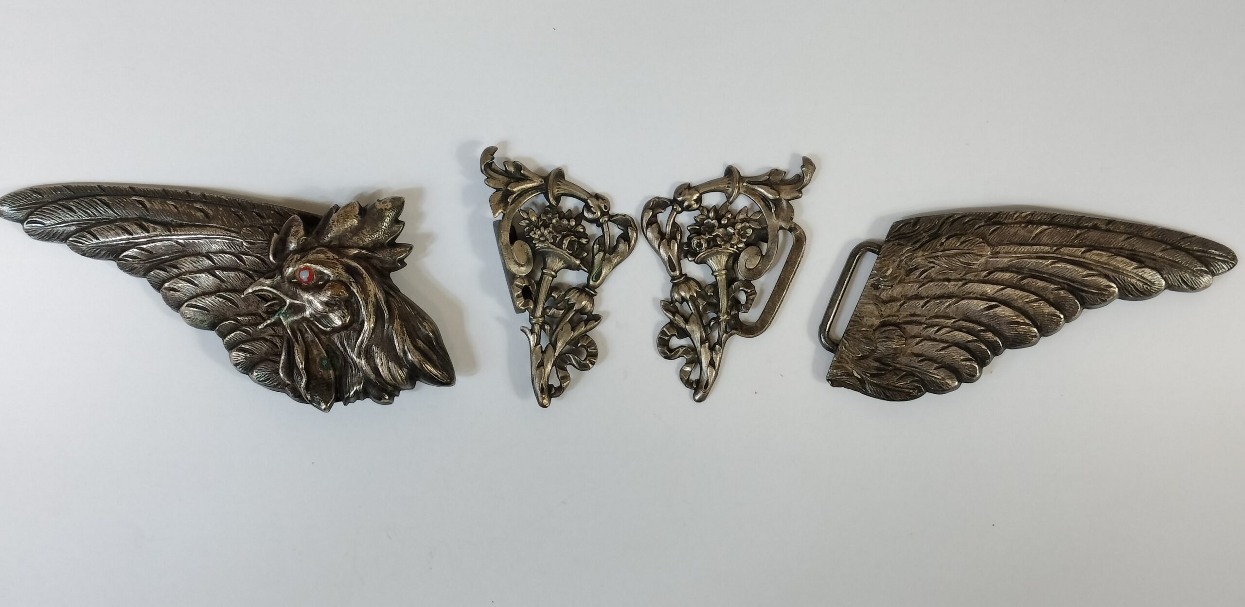 VER IMÁGENES PARA COMPROBAR EL ESTADO REAL. LAS IMÁGENES FORMAN PARTE DE LA DESCRIPCIÓN. DOS PAREJAS DE HEBILLAS. DOS EN FORMA DE ALAS DE GALLO, Y DOS EN FORMA DE CORNUCOPIA CON MOTIVOS VEGETALES. METAL PLATEADO, CON LIGEROS RESTOS DE ÓXIDO. OJOS DEL GALLO PINTADOS. MEDIDAS EN LAS IMÁGENES.