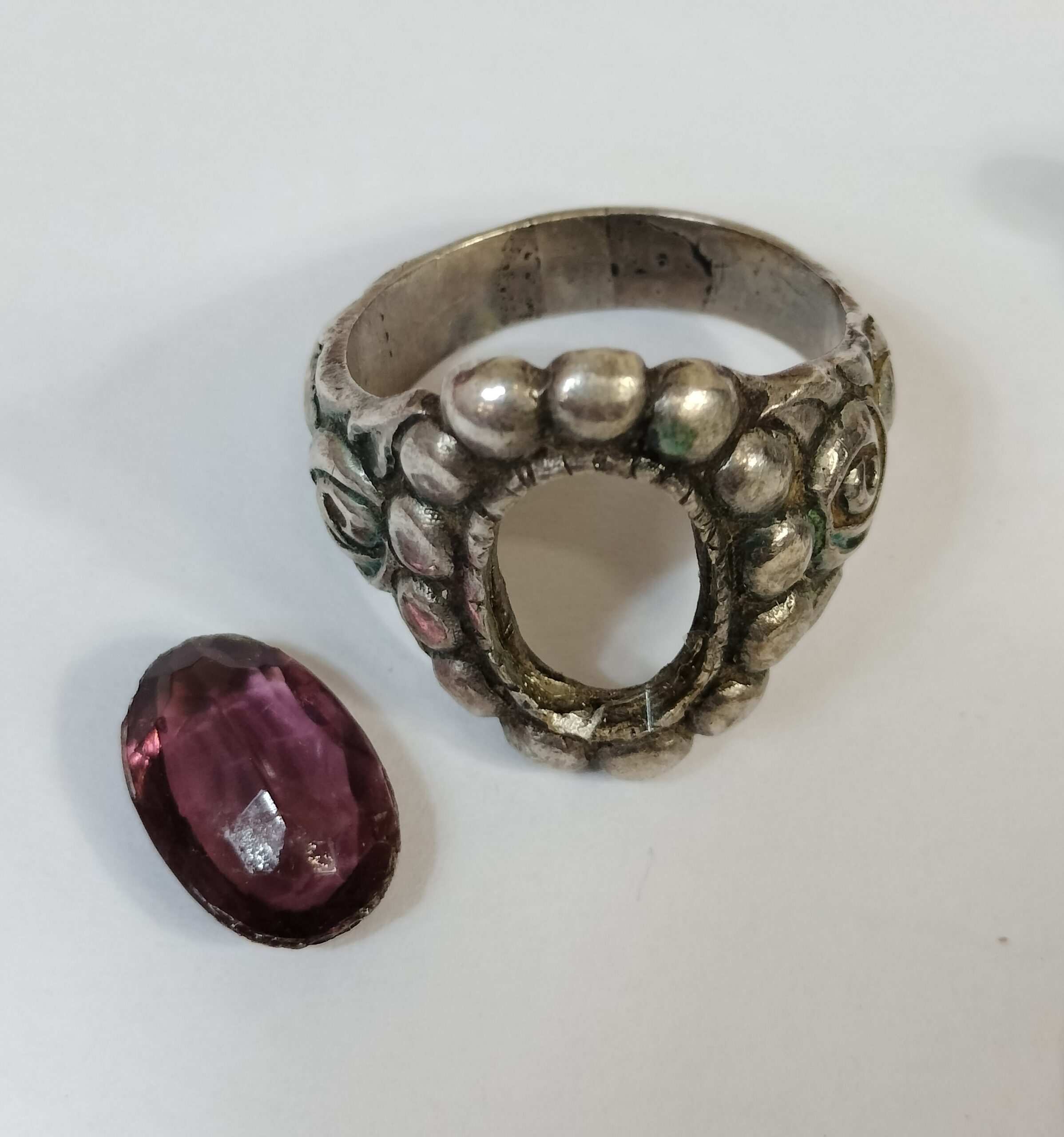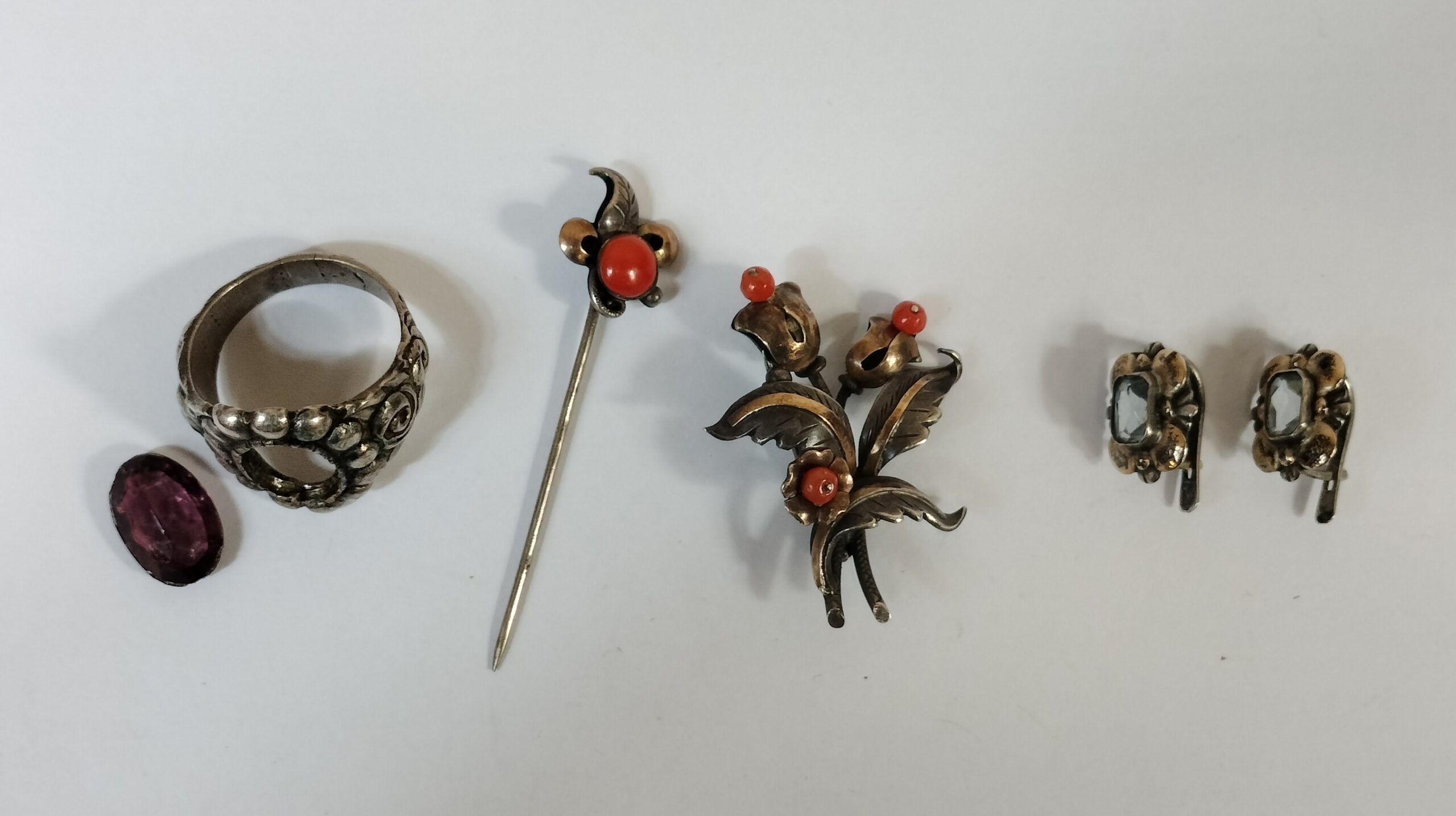 VER IMÁGENES PARA COMPROBAR EL ESTADO REAL. LAS IMÁGENES FORMAN PARTE DE LA DESCRIPCIÓN. LOTE DE JOYAS DE ESTILO NOVECENTISTA. PLATA, SIN PUNZÓN APARENTE, Y PIEDRAS. EL LOTE INCLUYE: – ANILLO CON PIEDRA GRANATE. MEDIDAS: 2 X 2 CM (INTERIOR). 2,7 X 2,2 (EXTERIOR, HUECO DE LA PIEDRA). – ALFILER CON BOTÓN ROJO. 5,4 CM (LARGO). – BROCHE DE RAMILLETE DE FLORES CON BOTÓN ROJO: 3,8 X 3 CM – PENDIENTES CON PERFILES ONDULADOS Y PIEDRA CRISTALINA: 1,5 X 1 CM. BUEN ESTADO GENERAL, LIGEROS RESTOS DE ÓXIDO Y SEÑALES DE USO. LA PIEDRA DEL ANILLO SE ENCUENTRA DESENCAJADA.