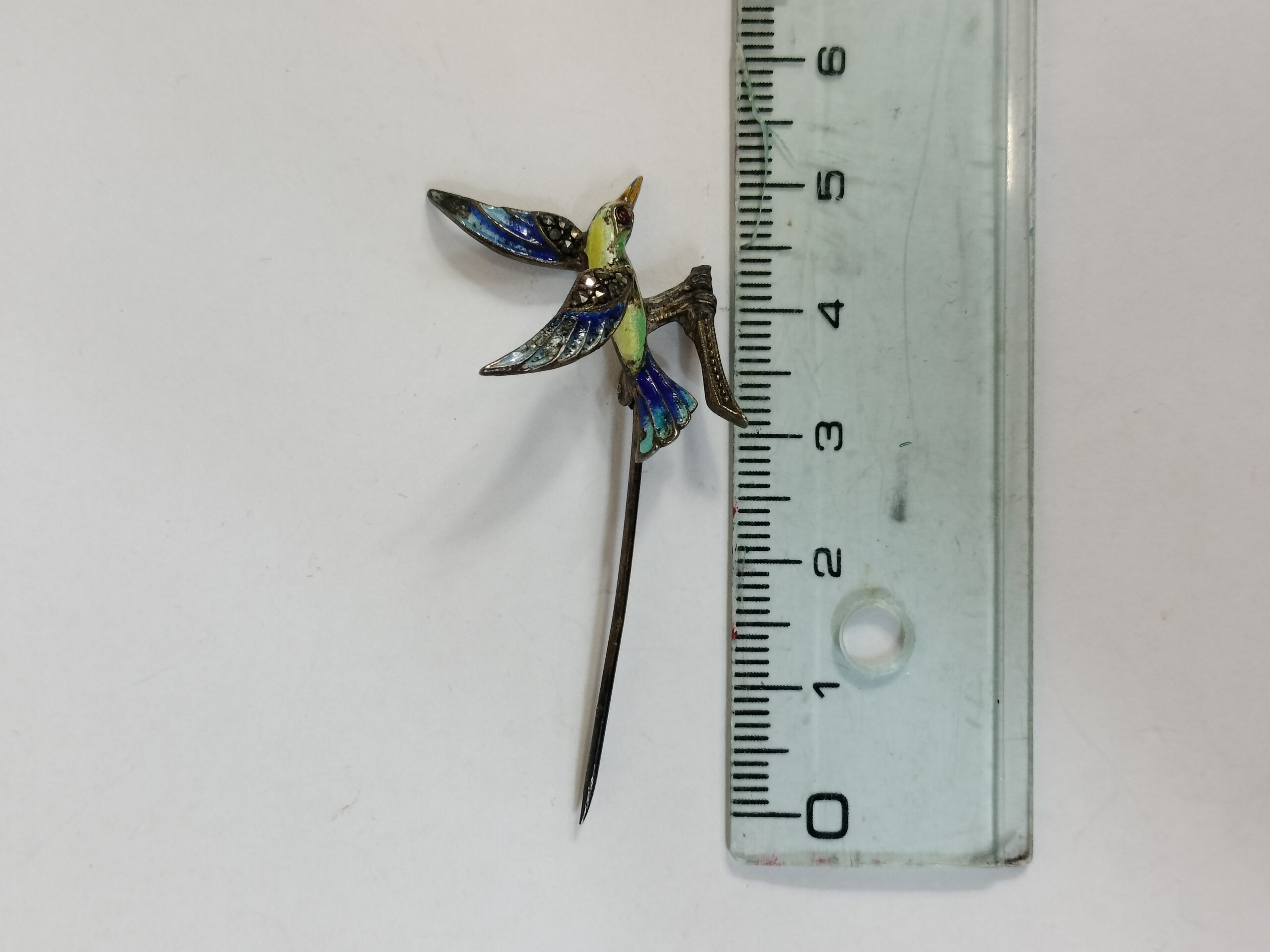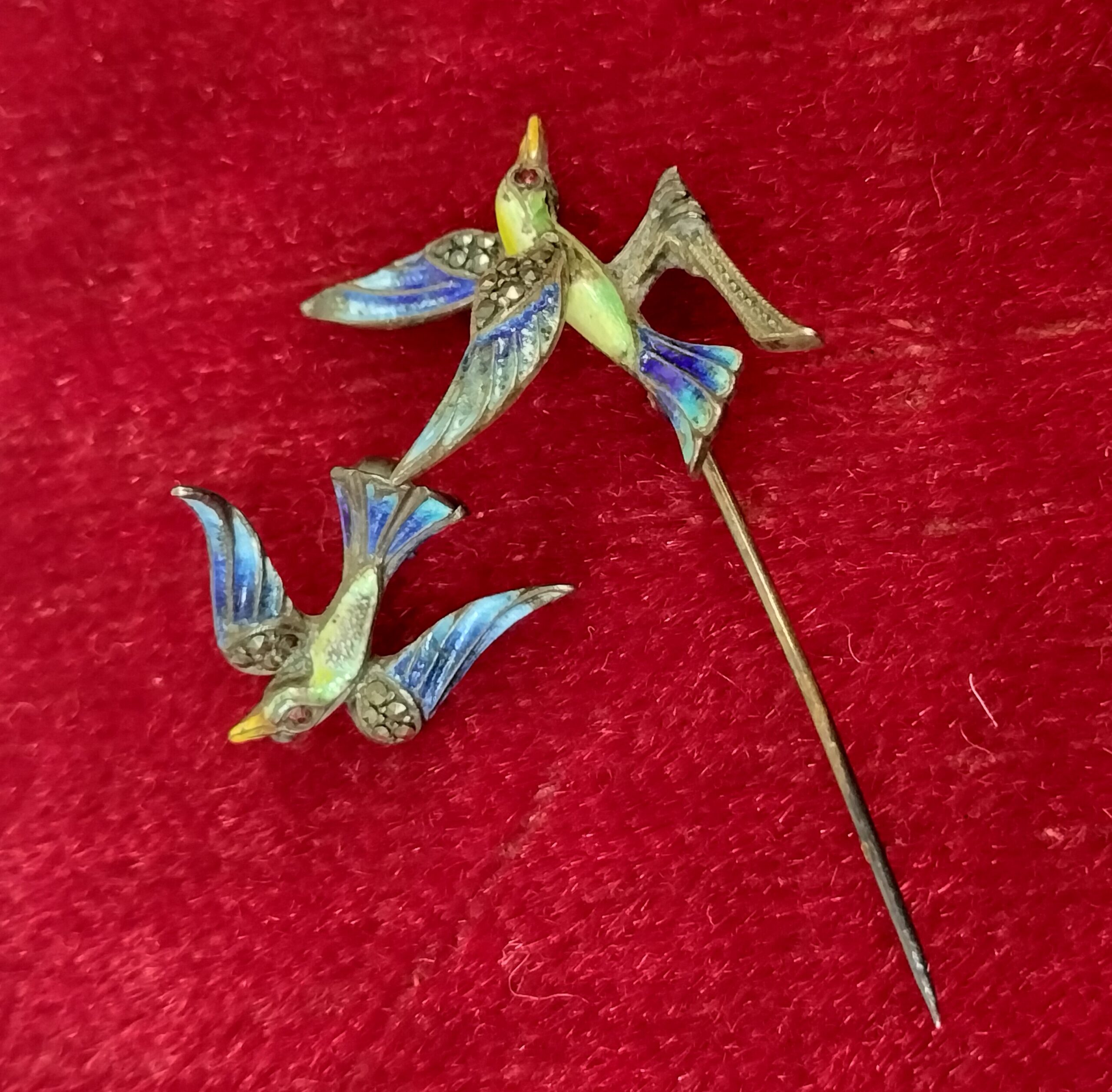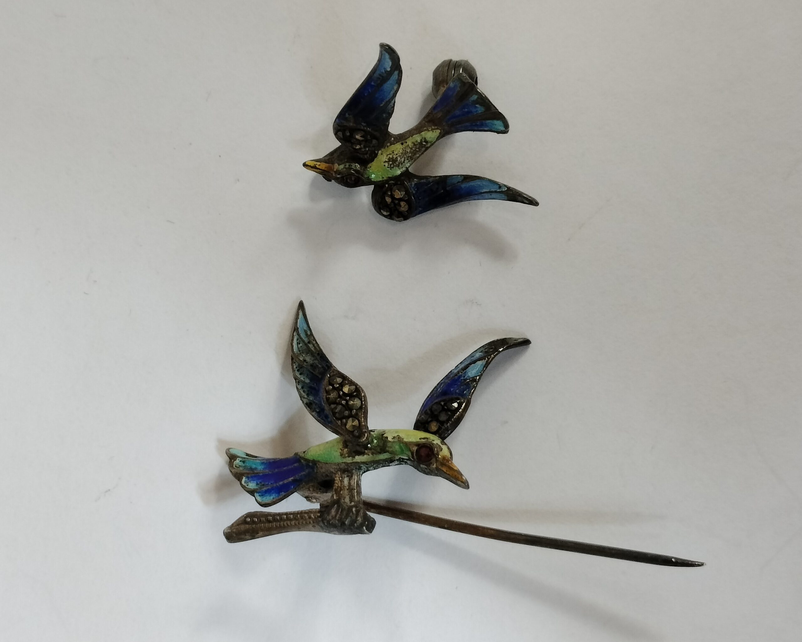 VER IMÁGENES PARA COMPROBAR EL ESTADO REAL.  LAS IMÁGENES FORMAN PARTE DE LA DESCRIPCIÓN.  MAGNÍFICO BROCHE Y ALFILER EN FORMA DE PÁJARO.  ESTILO ART DÉCO.  PLATA ESMALTADA Y INCRUSTACIONES DE PEDRERÍA.  SIN FIRMA NI MARCA DE AUTOR.  LIGEROS DESGASTES Y PÉRDIDA DE PÁTINA, VER IMÁGENES.  MEDIDAS APROXIMADAS:  ALFILER: 5 X 2 CM.  BROCHE: 1,2 X 2 CM