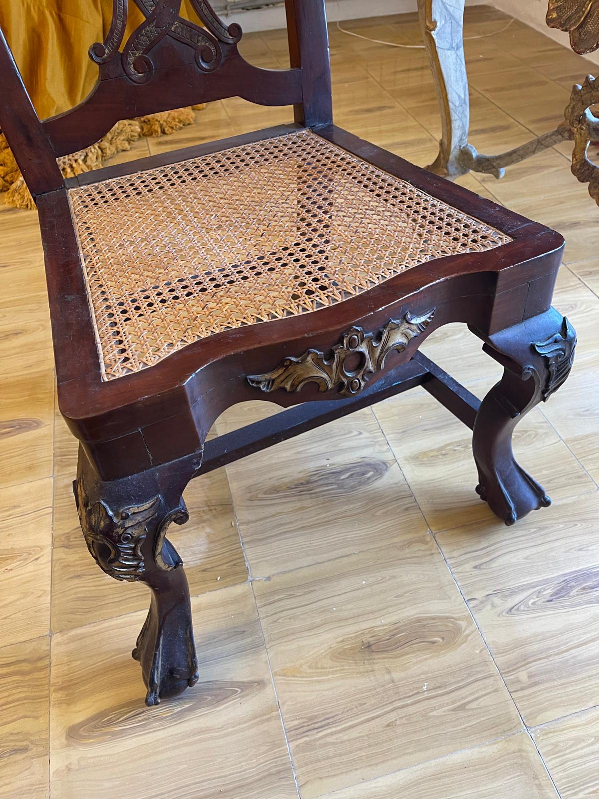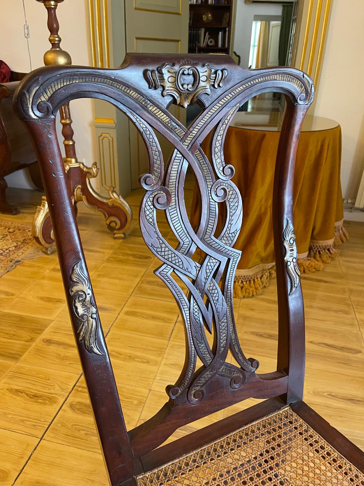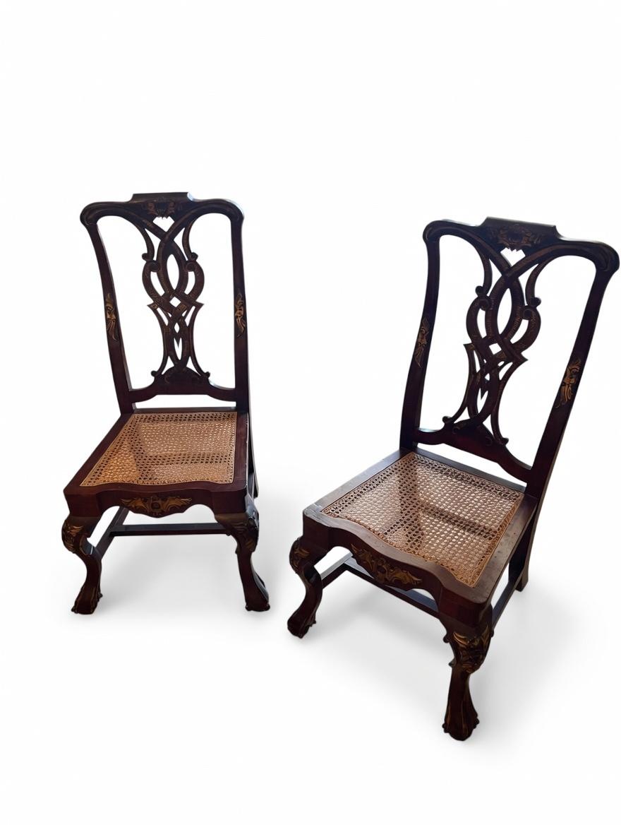 VER IMÁGENES PARA COMPROBAR EL ESTADO REAL. LAS IMÁGENES FORMAN PARTE DE LA DESCRIPCIÓN. LOS PRECIOS DE EXPEDICIÓN SON ORIENTATIVOS. CONTACTE CON NOSOTROS PARA CALCULARLOS SEGÚN SU CASO. ÚNICAMENTE ZONA UE. PAREJA DE MAGNÍFICAS SILLAS CHIPPENDALE. MADERA DE CAOBA. INGLATERRA, SIGLO XVIII. ASIENTO EN REJILLA. DECORACIÓN ROCOCÓ DE ROCALLA, EN TONO DORADO. RESPALDO RICAMENTE TALLADO CON PERFILES DORADOS ESTILIZADOS Y ANGULOSOS, CON REMATES EN FORMA DE VOLUTA. PATAS CABRIOLÉ, TIPO CLAW AND BALL. BUEN ESTADO GENERAL, LIGEROS DESGASTES DEBIDO AL USO.