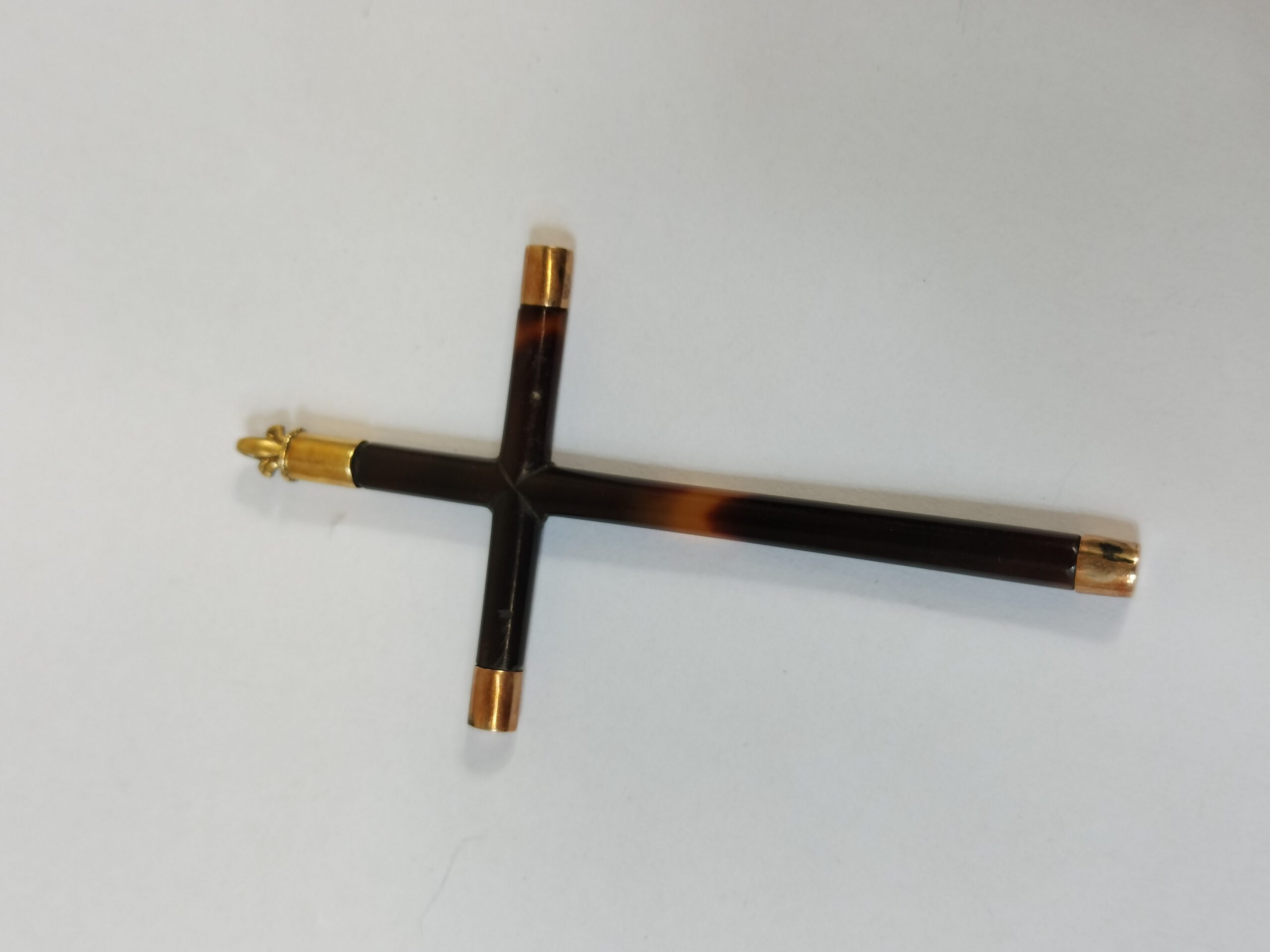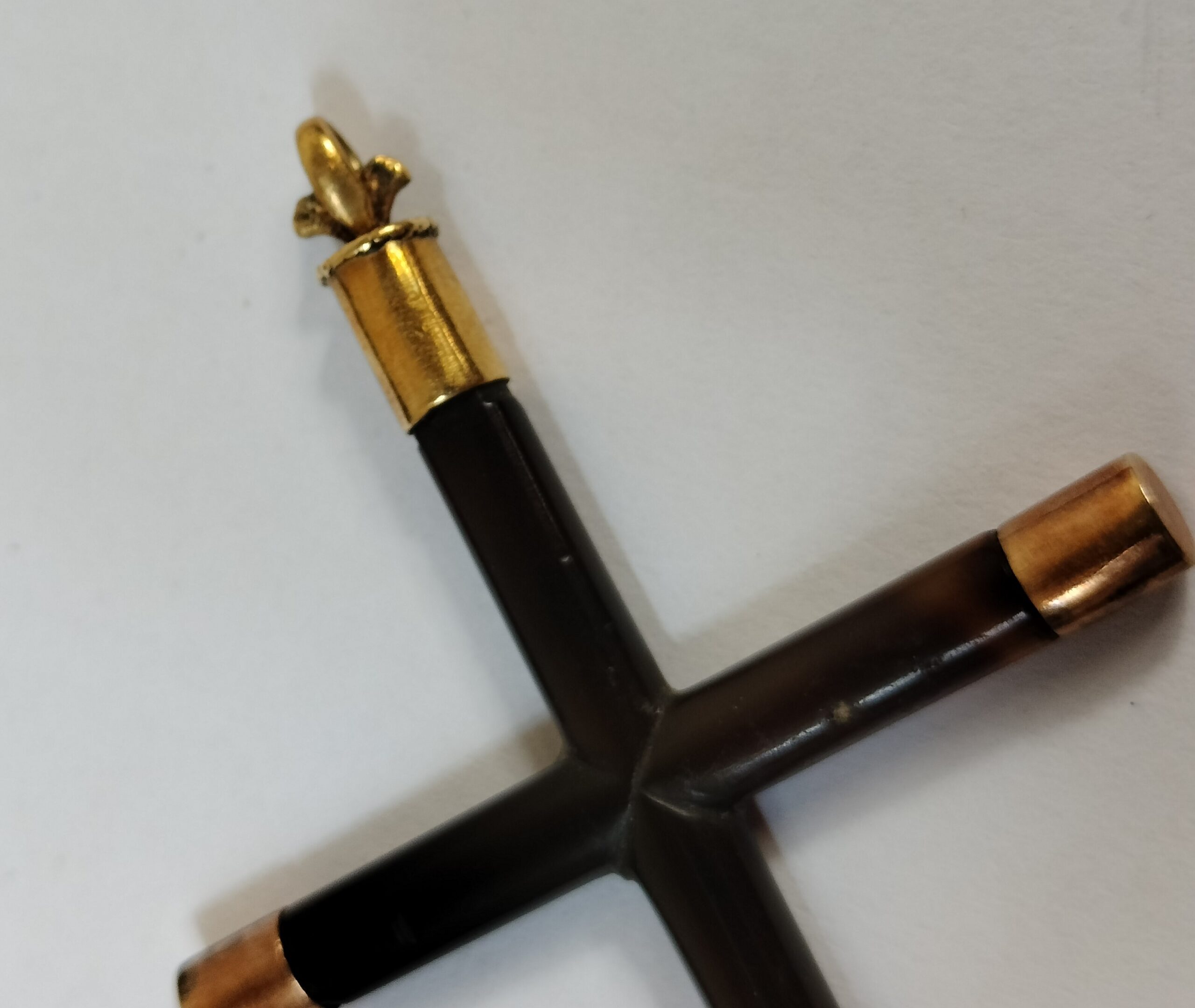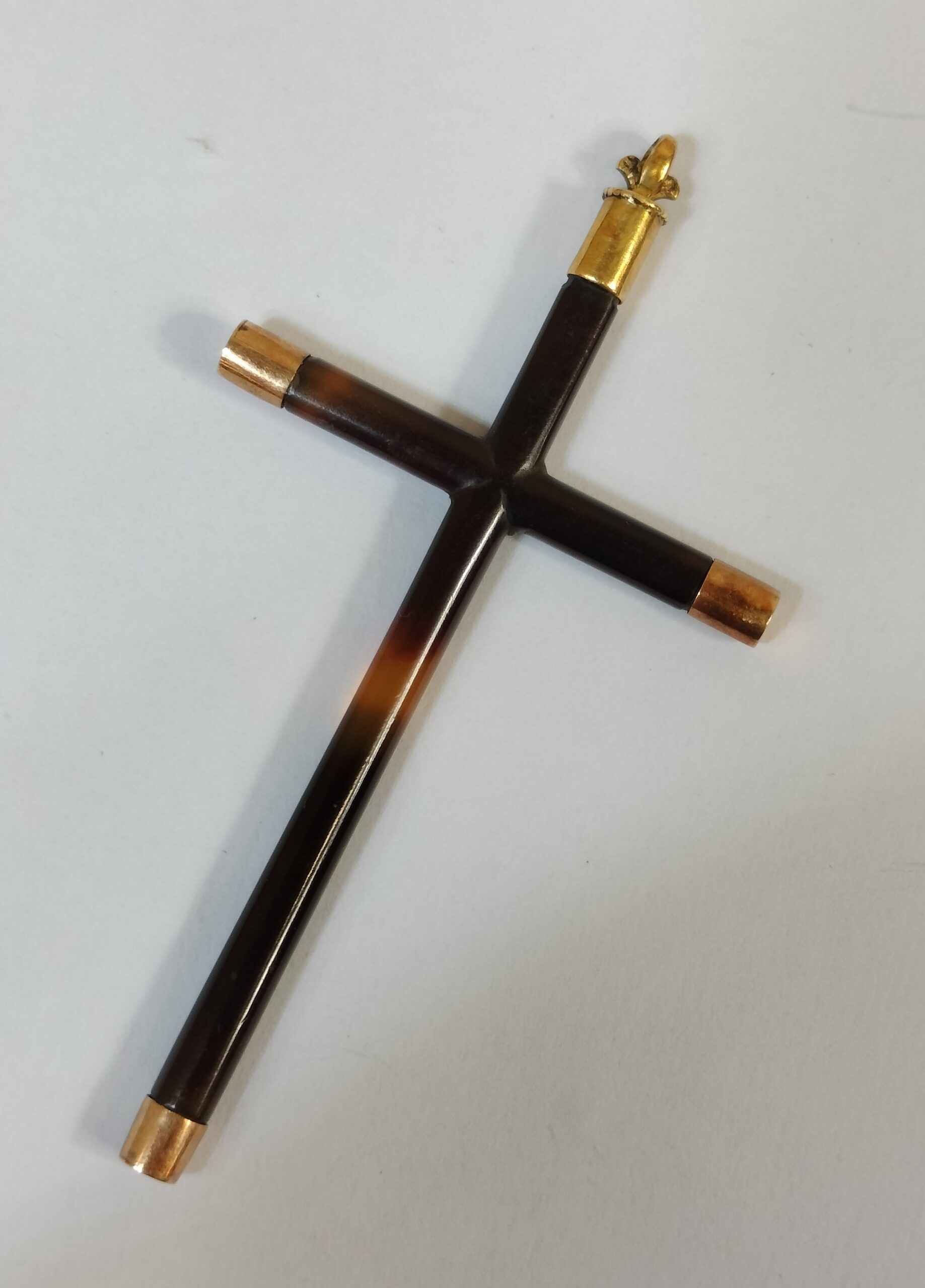 COLGANTE EN FORMA DE CRUZ. ÓNIX (?) Y PUNTAS EN ORO. ESPAÑA. SIGLO XIX.