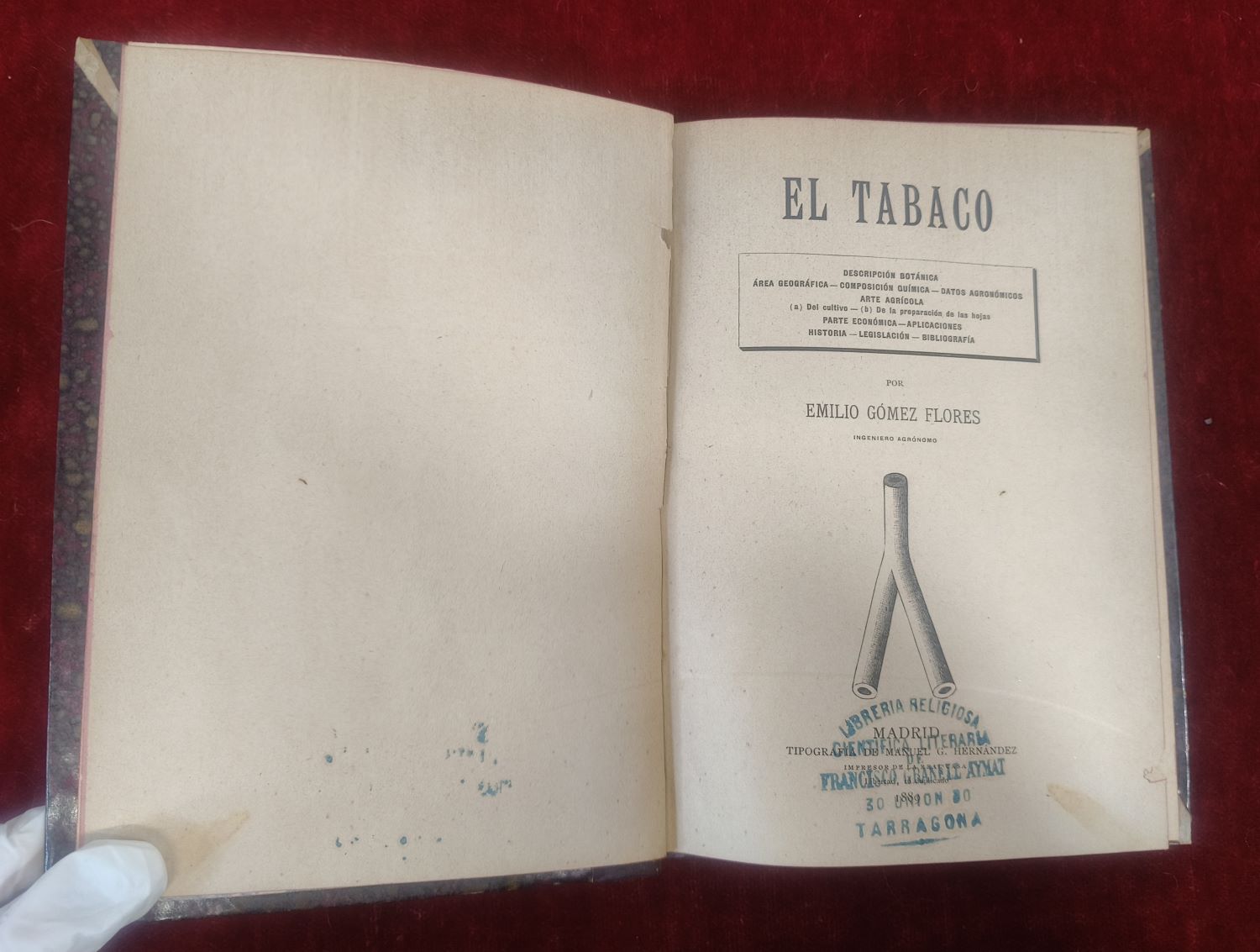 VER IMÁGENES PARA COMPROBAR EL ESTADO REAL.  LAS IMÁGENES FORMAN PARTE DE LA DESCRIPCIÓN. EL TABACO ES UNA OBRA PUBLICADA EN 1889 POR EMILIO GÓMEZ FLORES. TIPOGRAFÍA DE MANUEL G. HERNÁNDEZ, HARVARD. ANALIZA EL TABACO DESDE UNA PERSPECTIVA HISTÓRICA Y COMERCIAL, DETALLANDO LA REGULACIÓN DEL PRODUCTO. REFLEJA LA TRANSICIÓN DEL CONSUMO ARTESANAL AL INDUSTRIALIZADO, ABORDANDO LA PRODUCCIÓN Y FISCALIZACIÓN DEL TABACO EN LA ERA DE LOS MONOPOLIOS Y LA EXPANSIÓN DE GRANDES EMPRESAS TABACALERAS. 135 PÁGINAS. 16X22 ENCUADERNACIÓ EN TAPA DURA LIGERAS MACHAS DE ÓXIDO EN ALGUNAS PÁGINAS (NO AFECTA EN SU LECTURA)