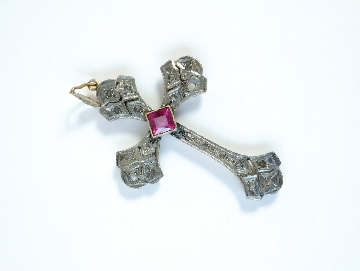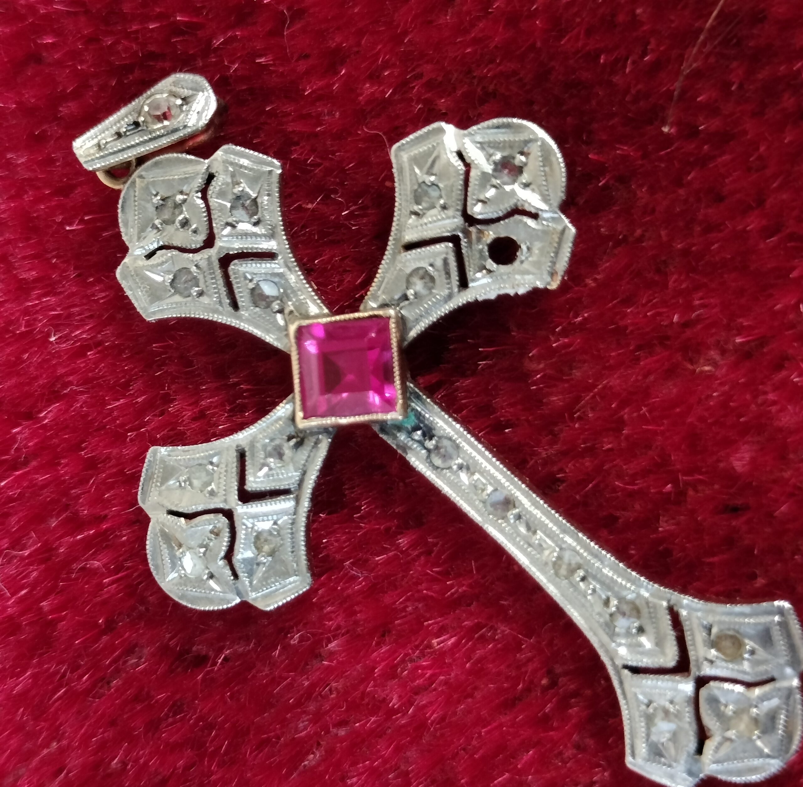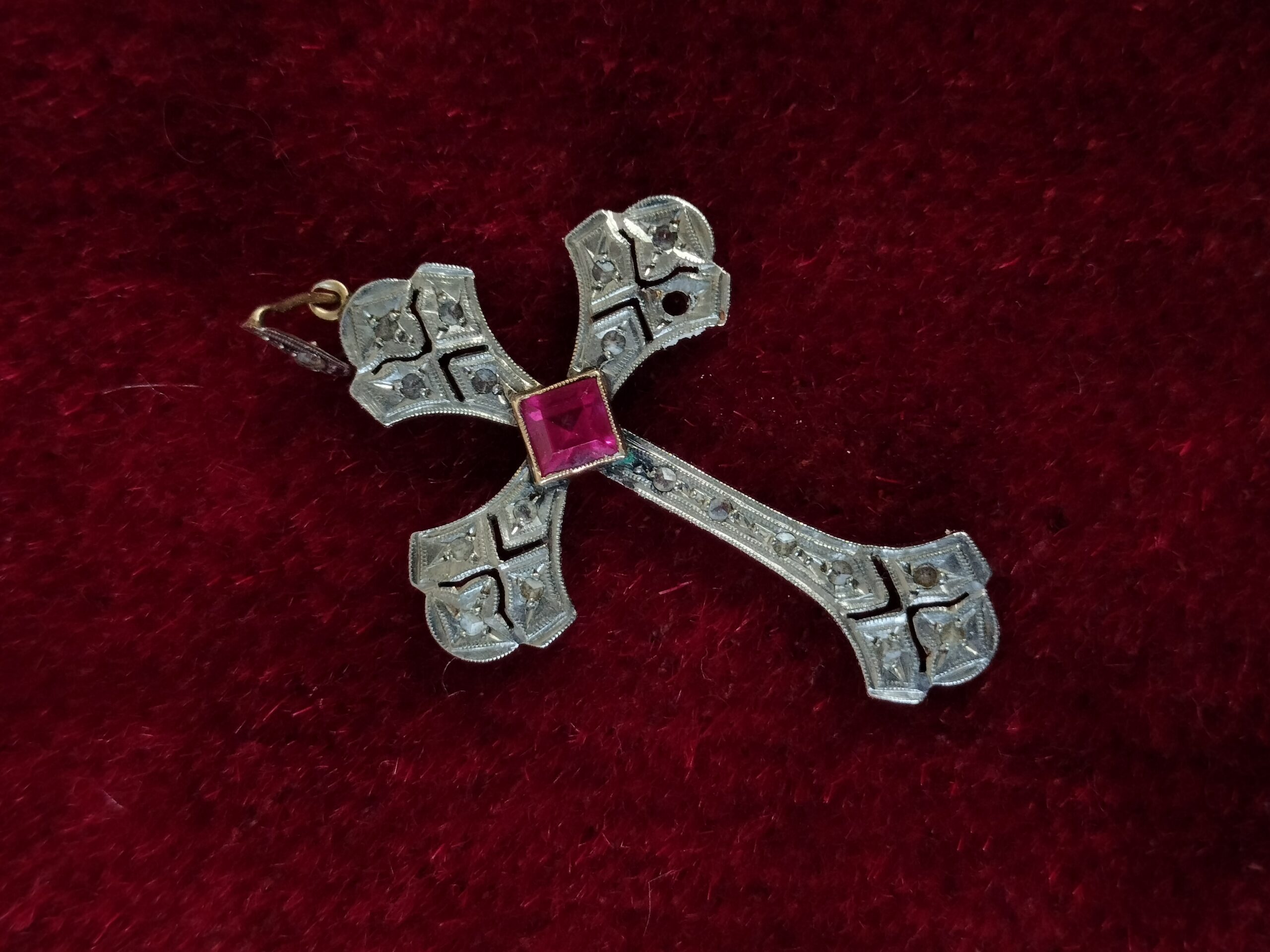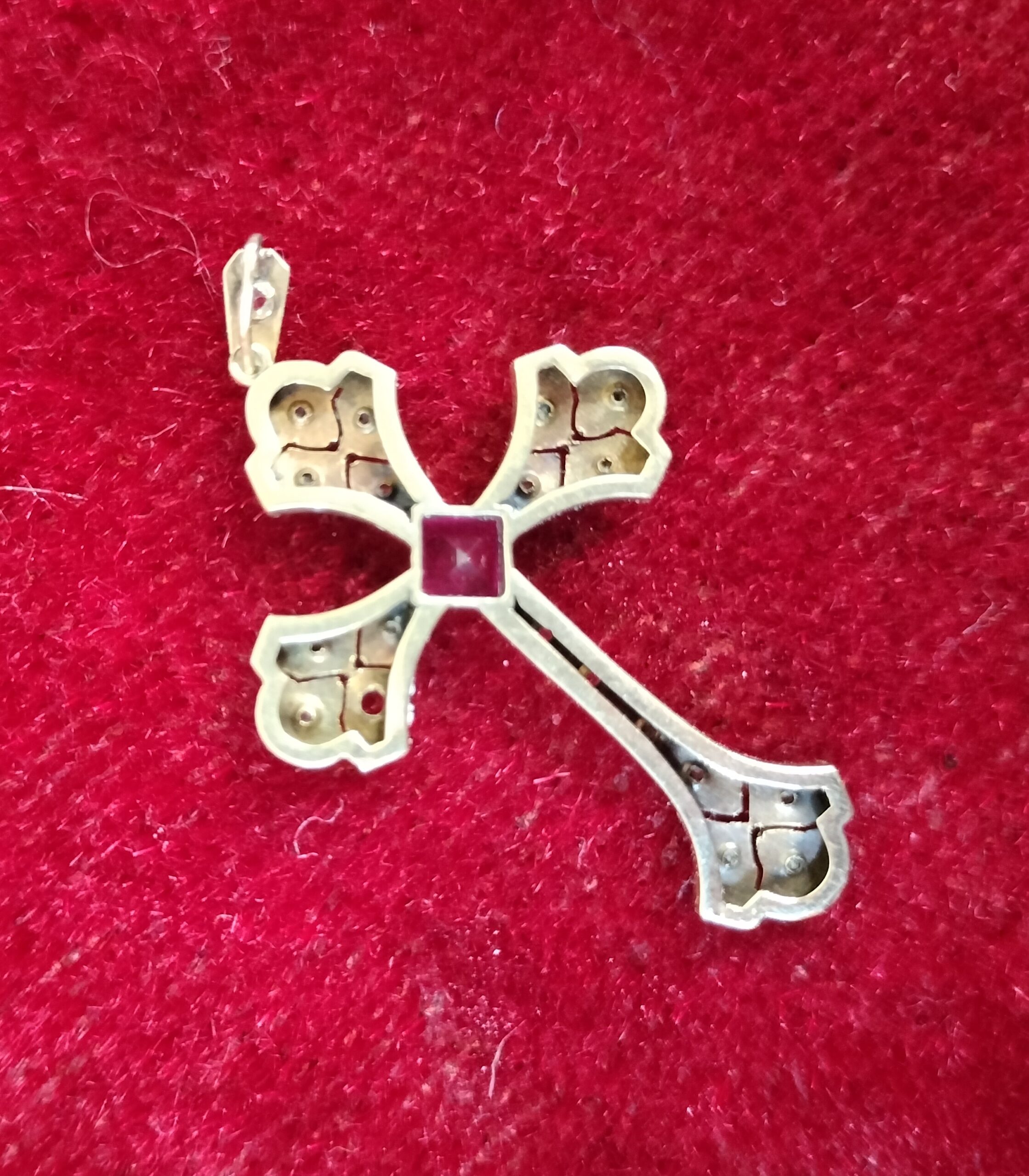VER IMÁGENES PARA COMPROBAR EL ESTADO REAL.  LAS IMÁGENES FORMAN PARTE DE LA DESCRIPCIÓN. CRUZ DE ESTILO ART DÉCO.  ORO Y INCRUSTACIONES.  NO SE TRATA DE BRILLANTES. DESCONOCEMOS LA NAUTURALEZA Y LA AUTENTICIDAD DE LA PIEDRA CENTRAL.  ALGUNAS INCRUSTACIONES FALTANTES.  SIN FIRMA NI MARCA DE AUTOR.  2,13 GRAMOS. 3,7 X 2,5 CM.