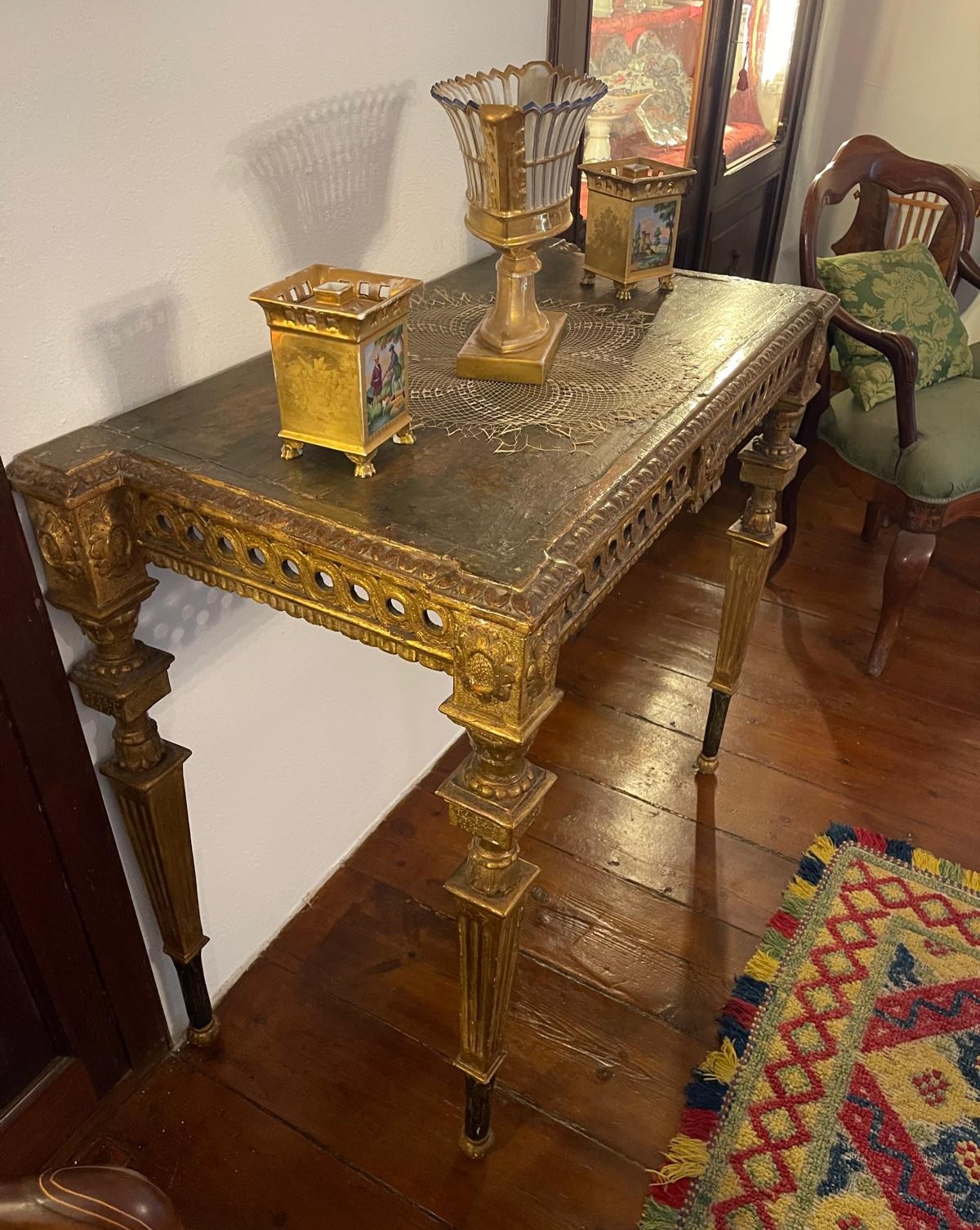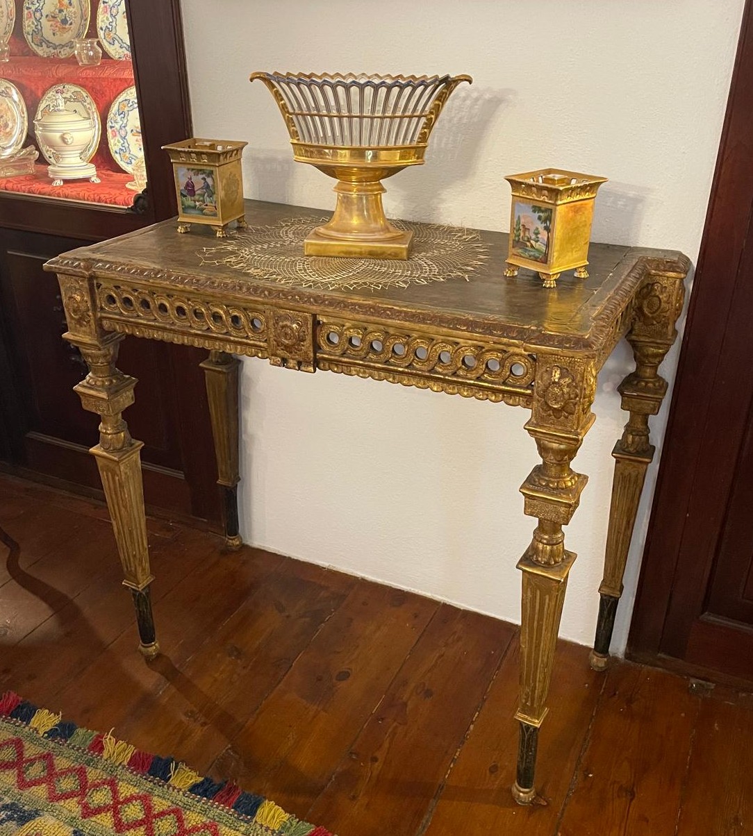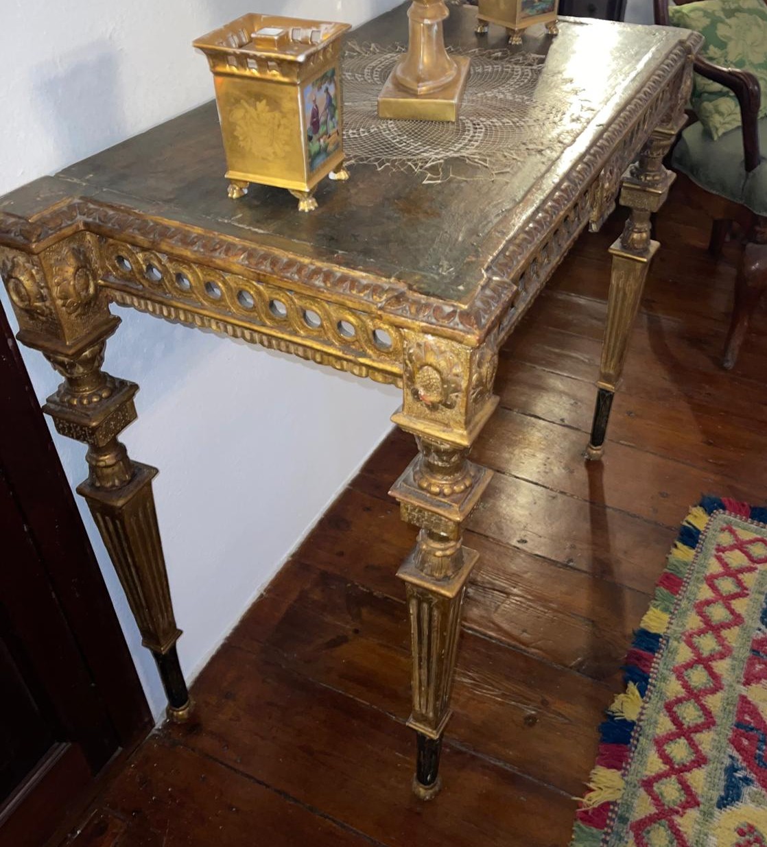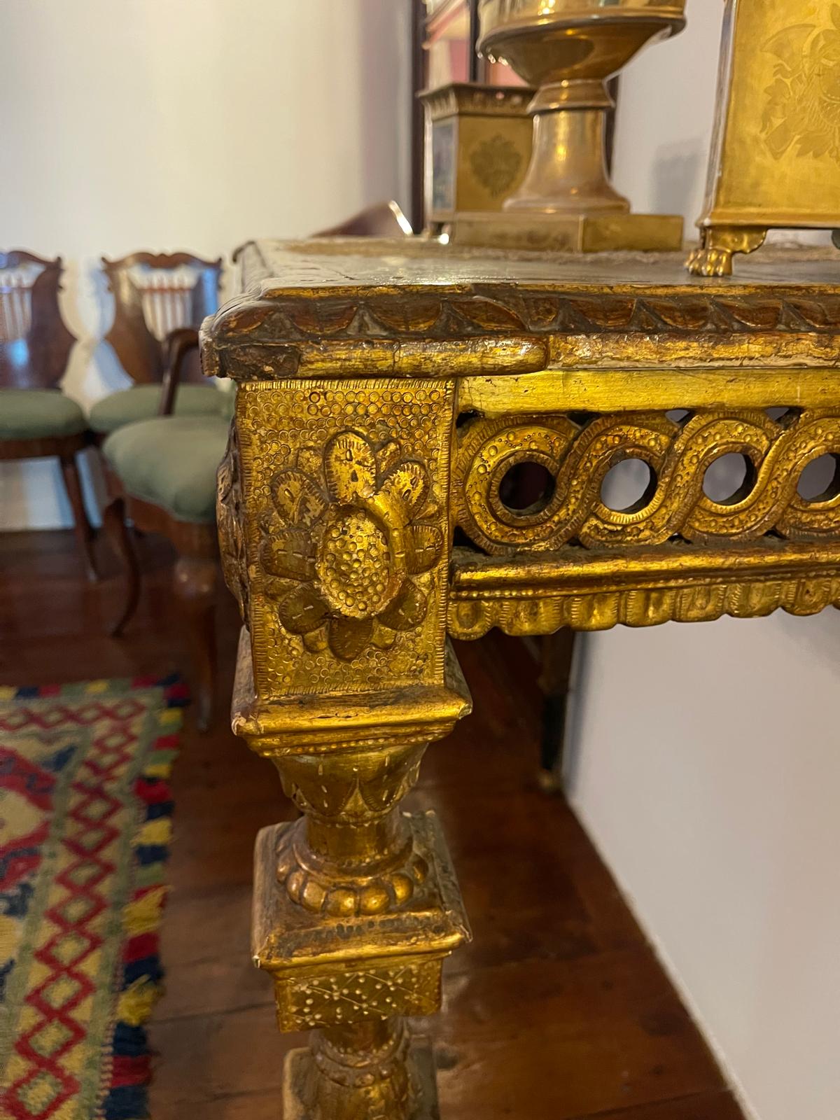 VER IMÁGENES PARA COMPROBAR EL ESTADO REAL. LAS IMÁGENES FORMAN PARTE DE LA DESCRIPCIÓN. LOS PRECIOS DE EXPEDICIÓN SON ORIENTATIVOS. CONTACTE CON NOSOTROS PARA CALCULARLOS SEGÚN SU CASO. ÚNICAMENTE ZONA UE. MAGNÍFICA MESA CONSOLA DE ESTILO CARLOS IV. MADERA TALLADA Y ESTOFADA EN ORO. TABLERO O REPISA EN MADERA CON BORDES MOLDURADOS. FALDA CON FRISO DECORATIVO A BASE DE ANILLOS O ROLEOS ENTRELAZADOS. ESQUINAS TALLADAS CON ROSETAS O FLORONES EN RELIEVE. PATAS ACANALADAS CON PIE PEQUEÑO. SE APRECIAN PÉRDIDAS DE ESTOFADO, DESGASTES Y EROSIONES DEBIDO AL TIEMPO. VER IMÁGENES EN DETALLE.