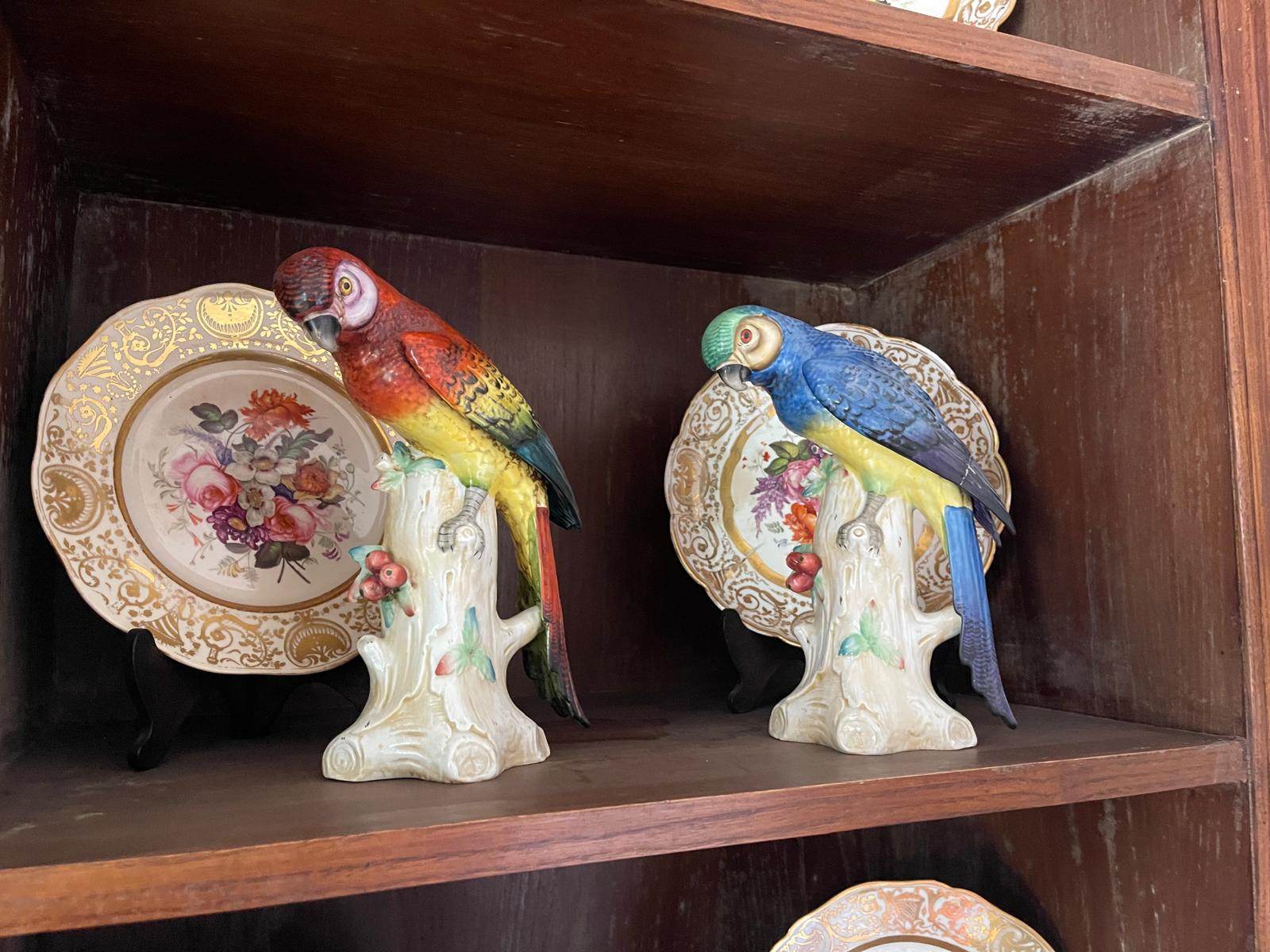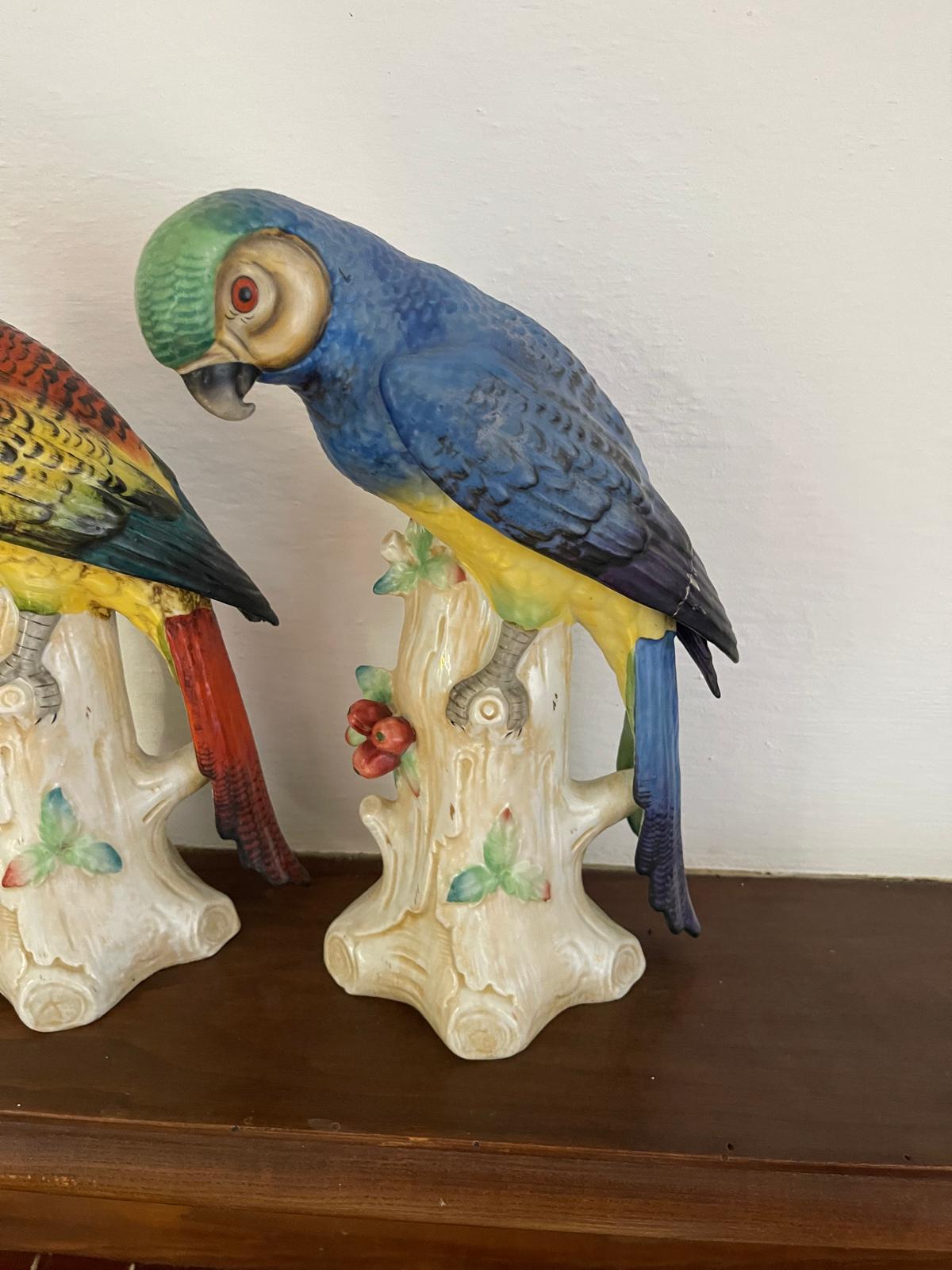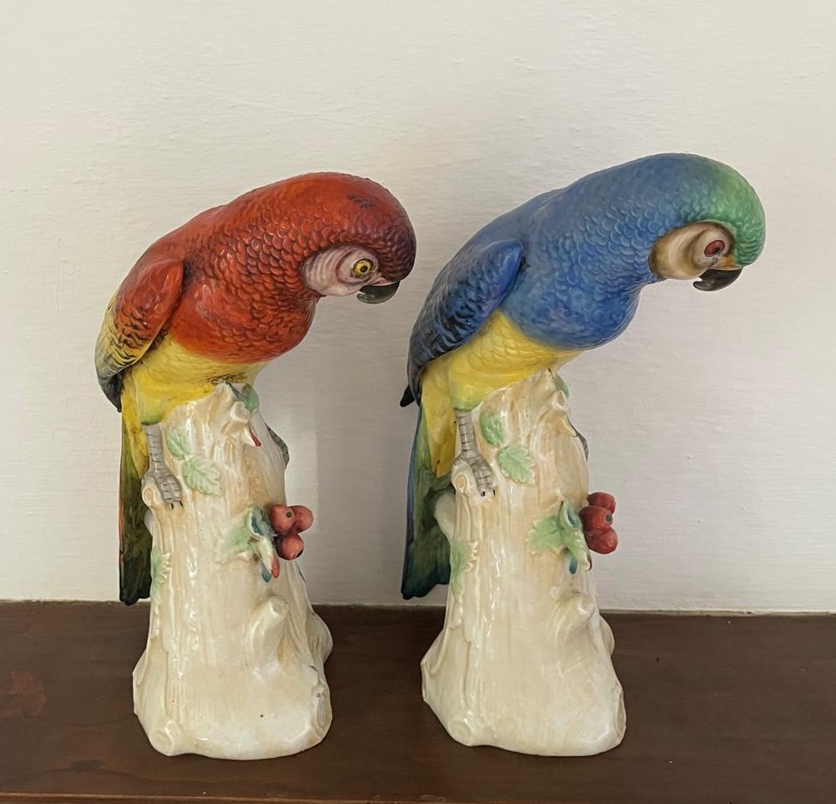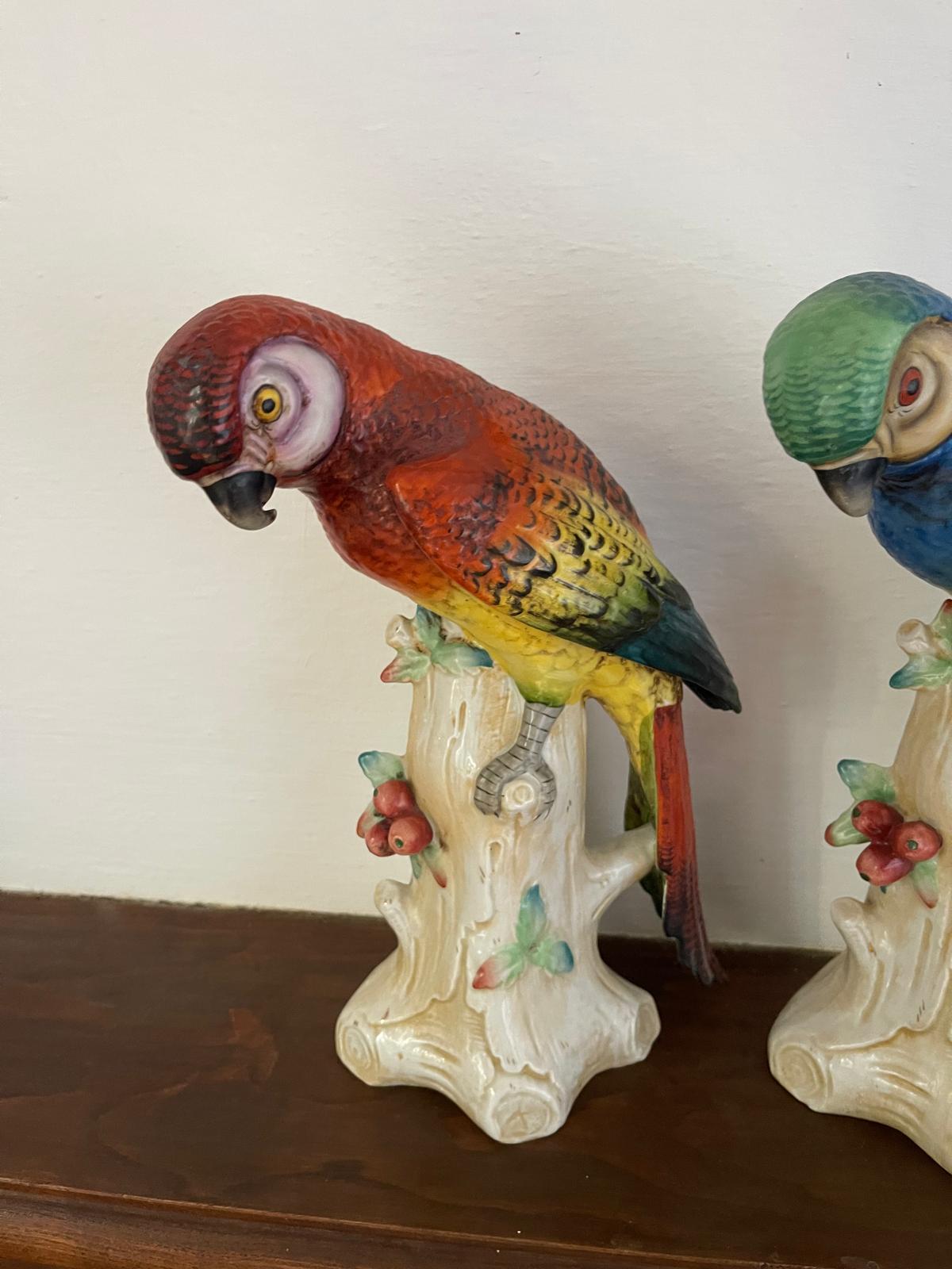 PAREJA DE MAGNÍFICOS LOROS O GUACAMAYOS. PORCELANA POLICROMADA. DRESDEN O MEISSEN. SIGLO XIX.