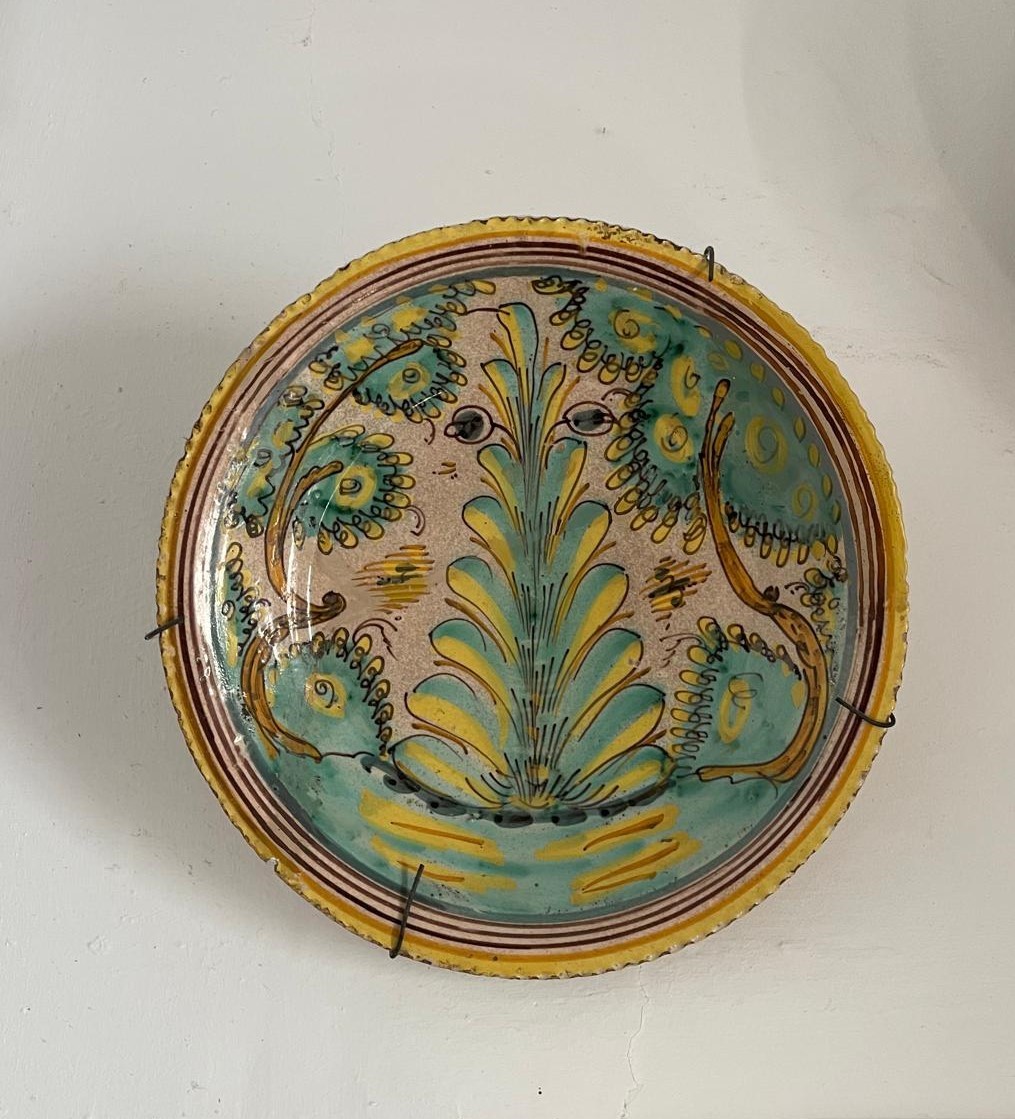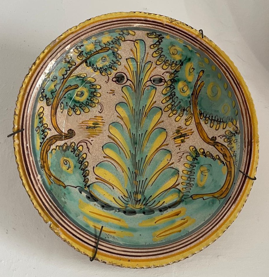 ANTIGUO PLATO DE CERÁMICA ESMALTADA. SERIE DEL PINO. PUENTE DEL ARZOBISPO O TALAVERA. XVIII-XIX.