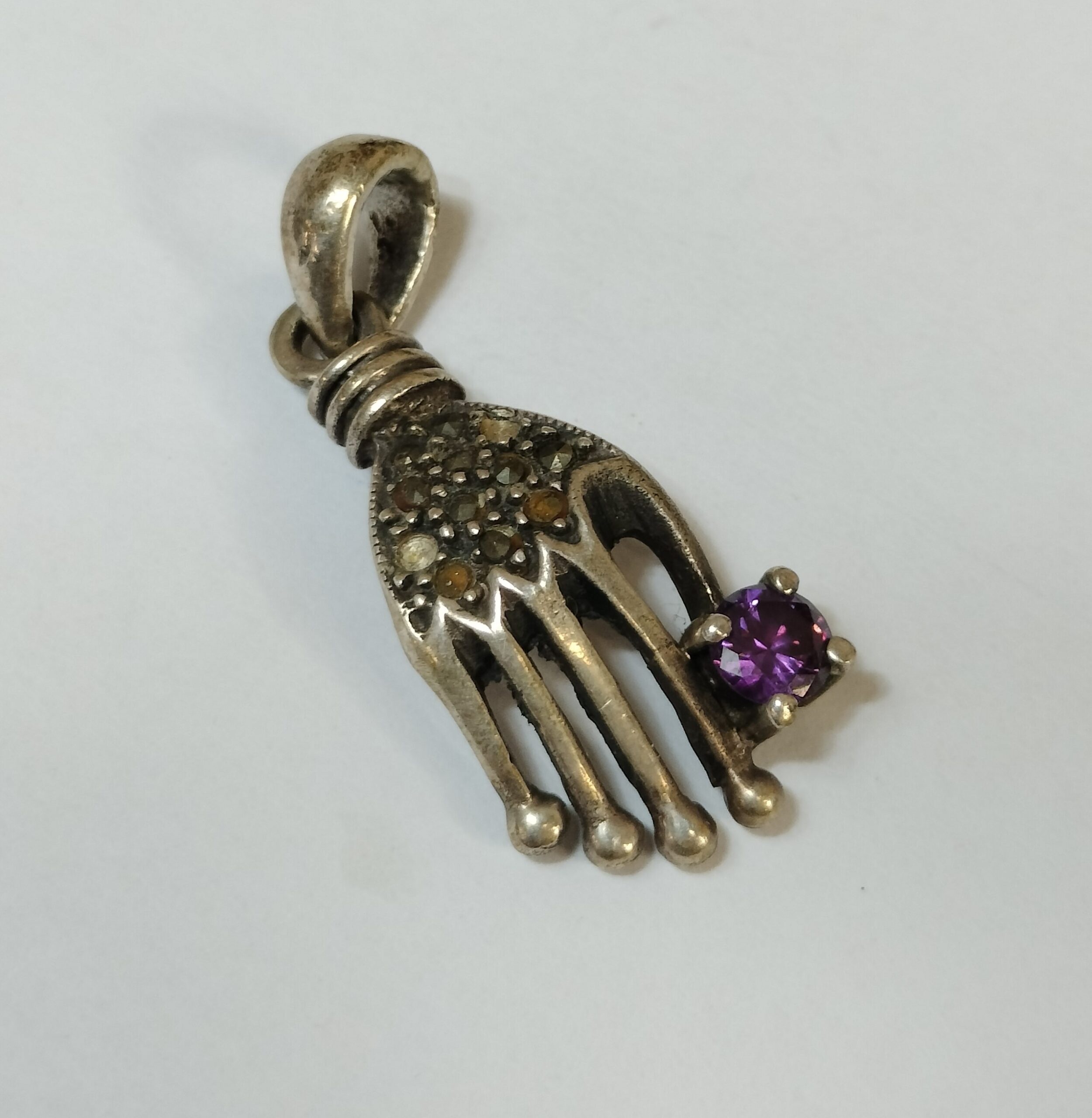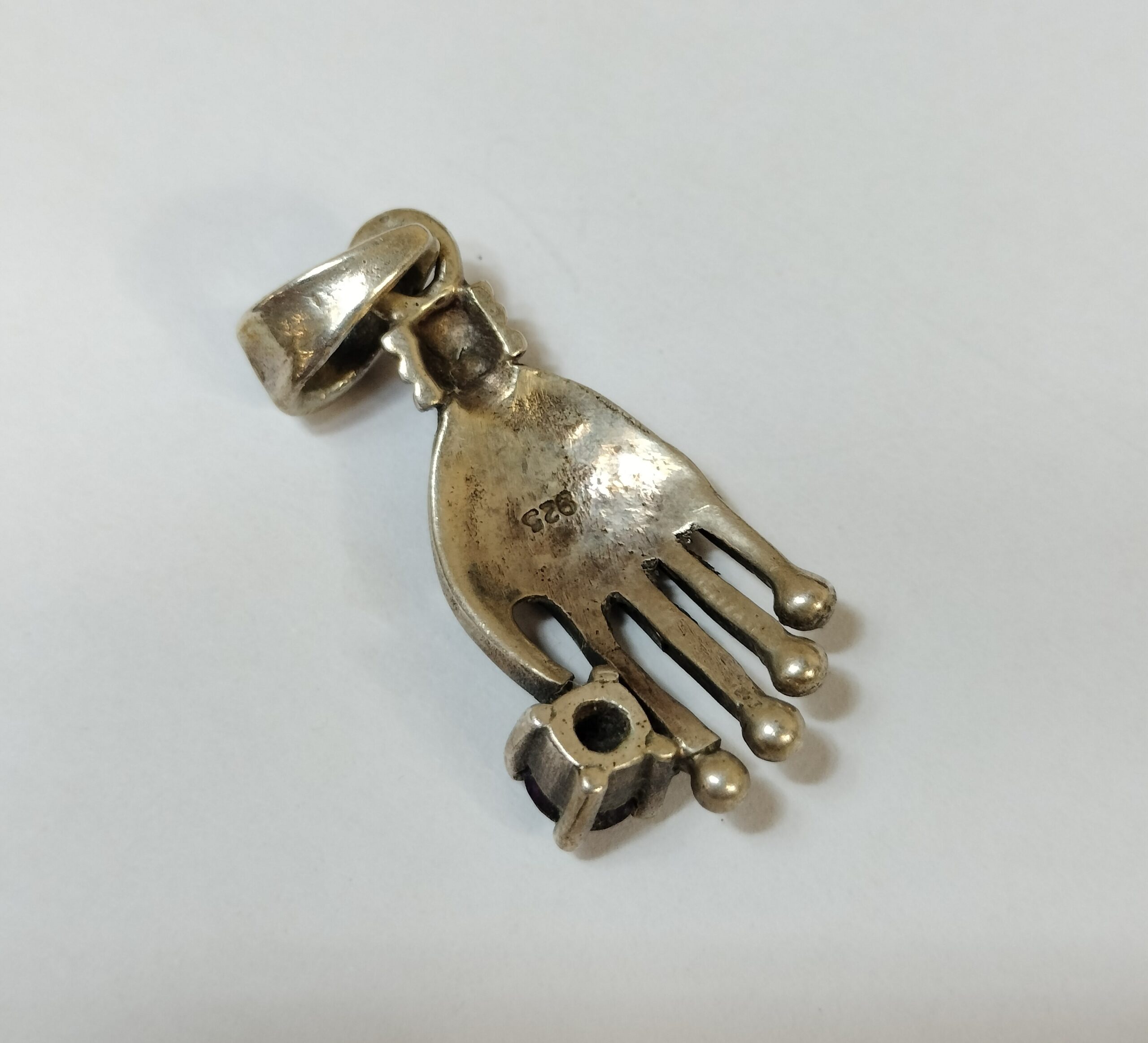 COLGANTE EN FORMA DE MANO. MARCA 925 EN LA PARTE POSTERIOR. INCRUSTACIÓN PROBABLEMENTE DE AMATISTA. 3,37 GRAMOS.