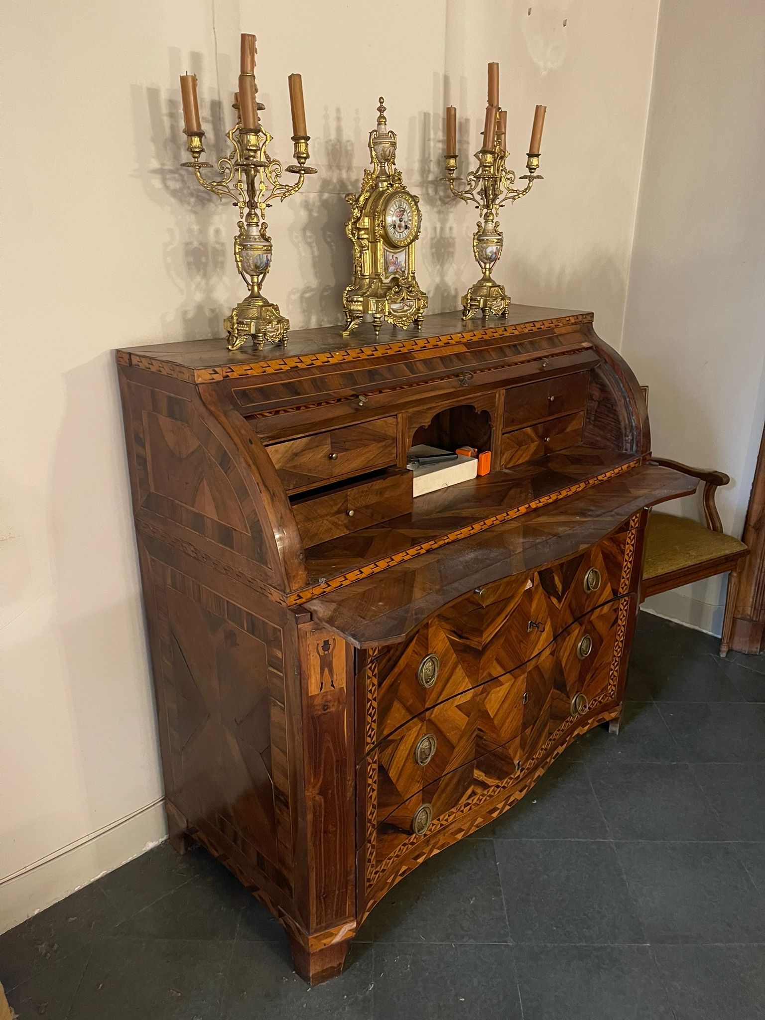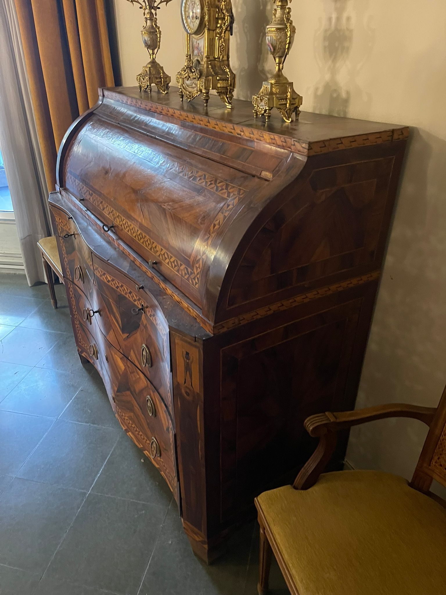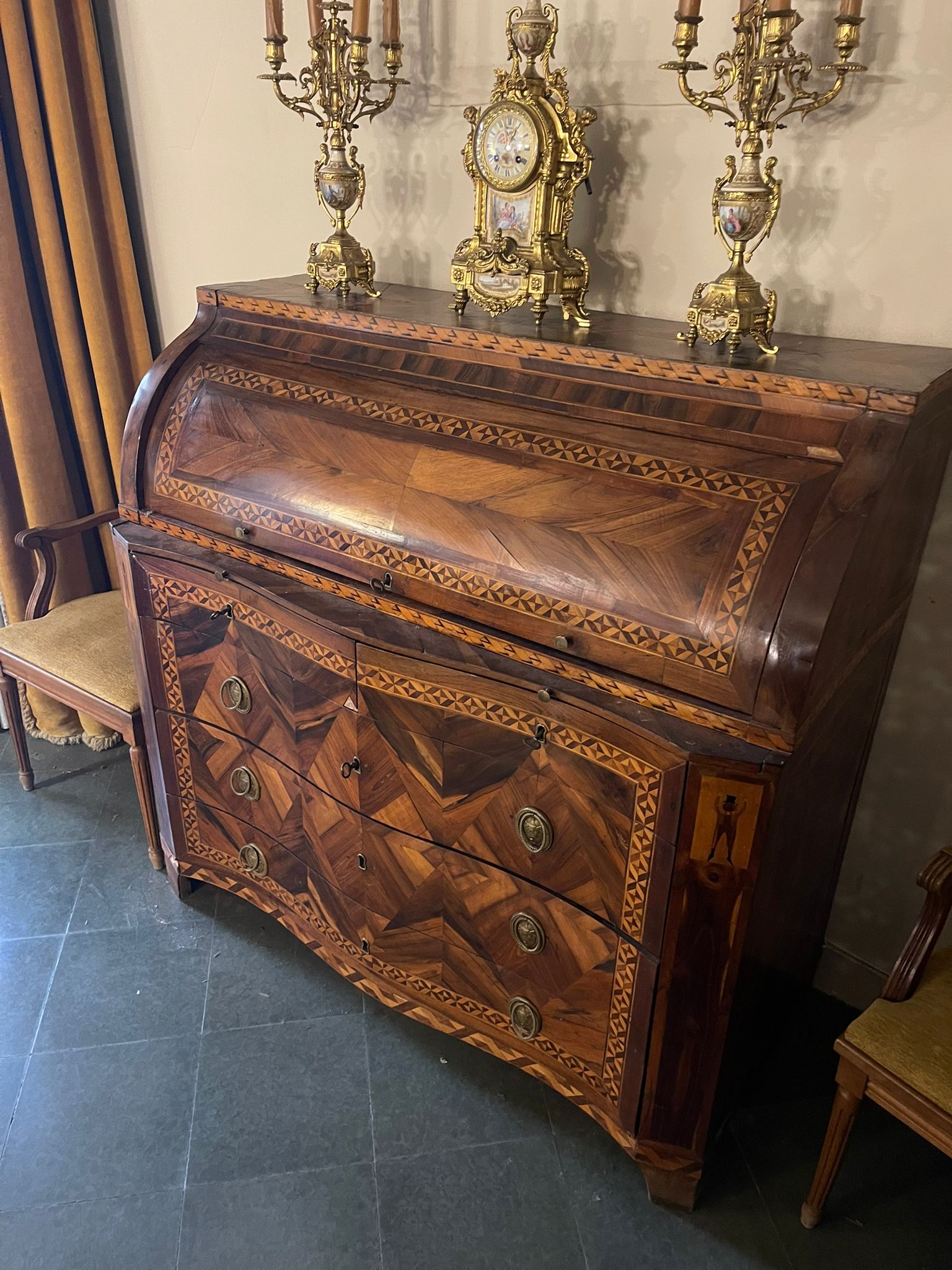 VER IMÁGENES PARA COMPROBAR EL ESTADO REAL.  LAS IMÁGENES FORMAN PARTE DE LA DESCRIPCIÓN.  LOS PRECIOS DE EXPEDICIÓN SÓN ORIENTATIVOS.  CONTACTE CON NOSOTROS PARA CALCULARLOS SEGÚN SU CASO.  ÚNICAMENTE ZONA UE.  ANTIGUO BUREAUX O ESCRITORIO DE ESTILO CARLOS IV.  MARQUETERÍAS NOBLES Y TARACEA DE BOJ.  CENEFAS GEOMÉTRICAS EN TONOS MARRONES OSCUROS Y CLAROS. FIGURAS HUMANAS EN LOS ÁNGULOS.  TIRADORES EN METAL, ORNAMENTADOS CON ÁNFORAS O JARRONES.  DESGASTES Y EROSIONES DEBIDO AL USO Y EL TIEMPO, VER IMÁGENES.