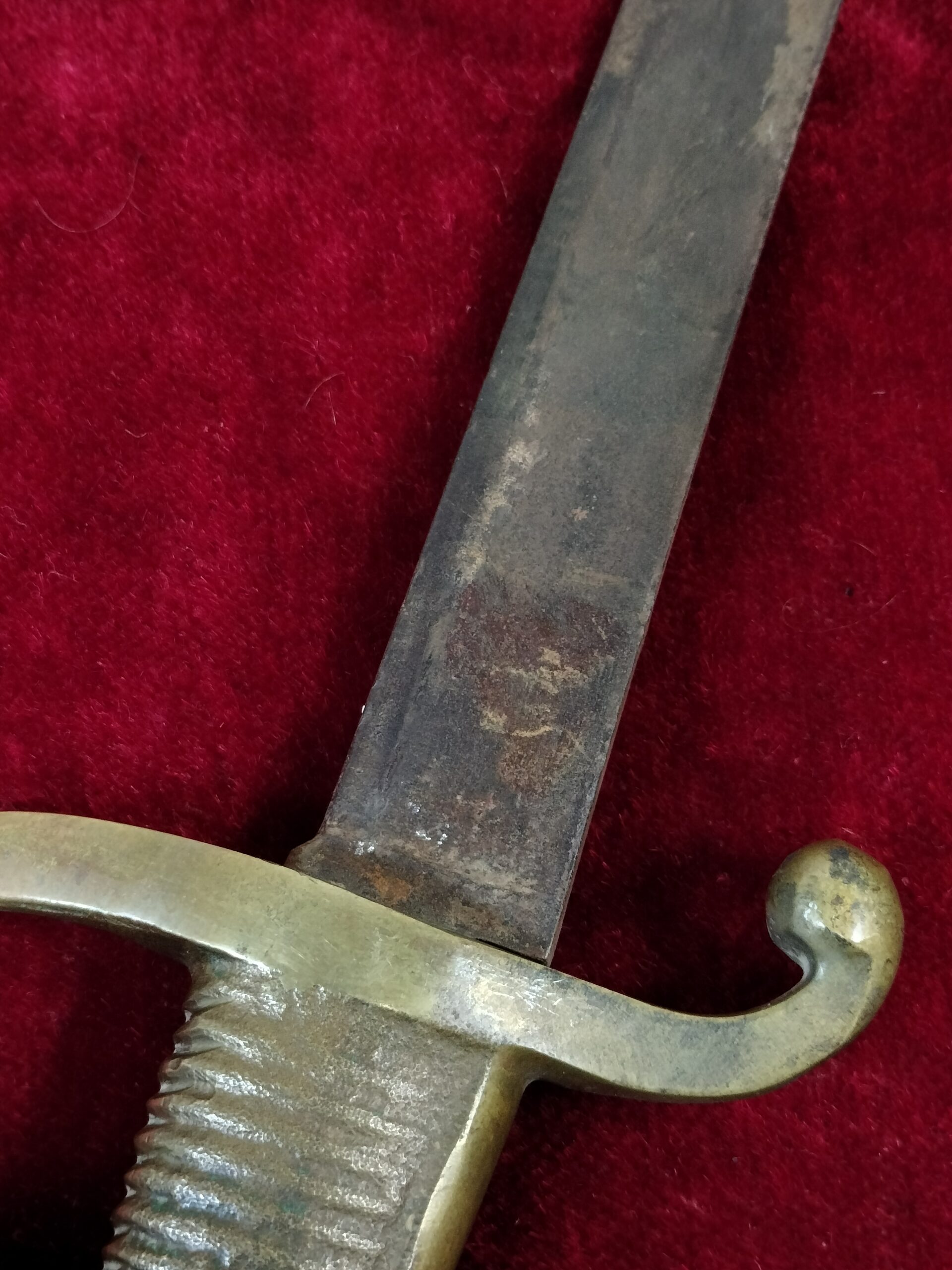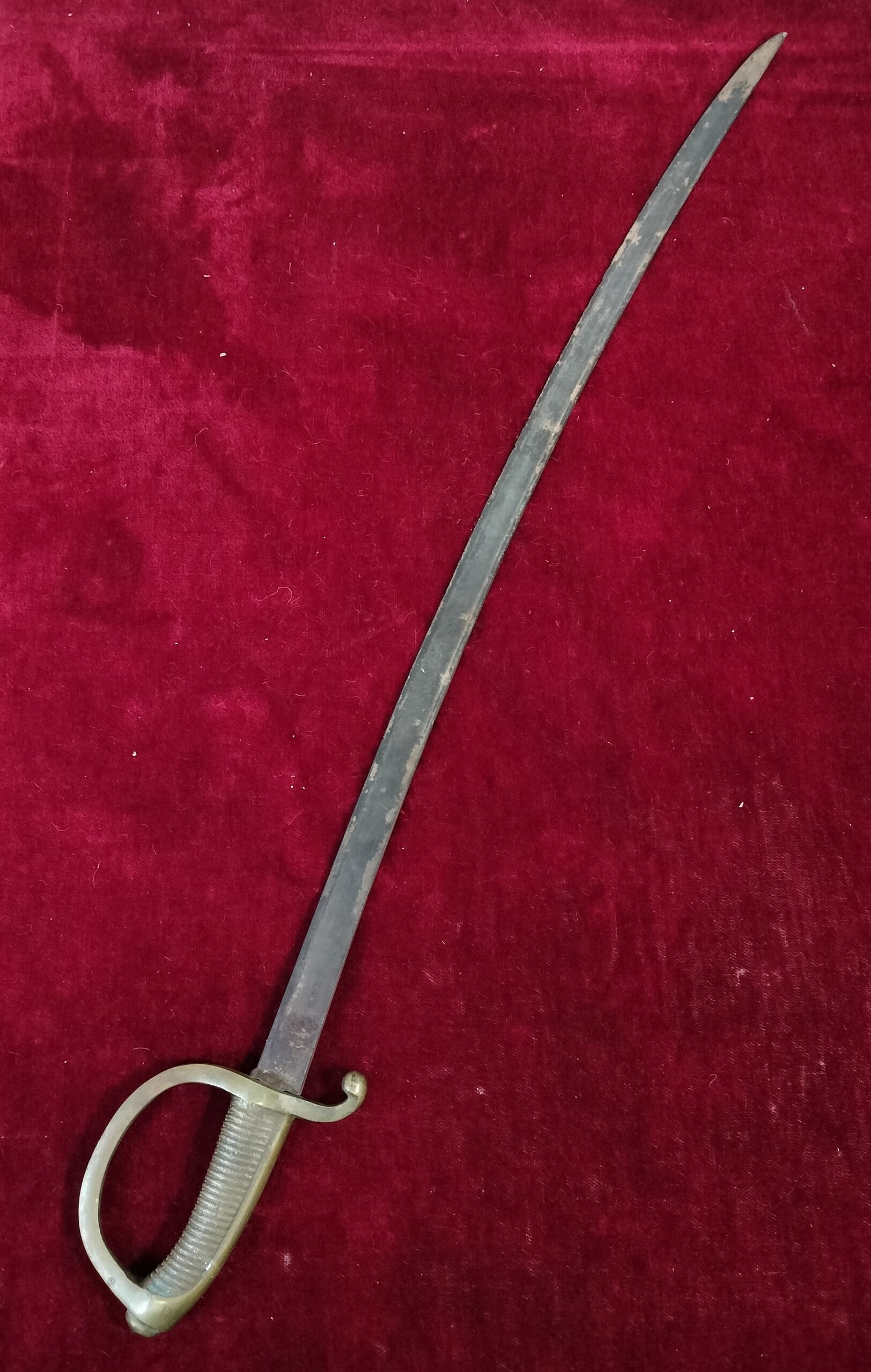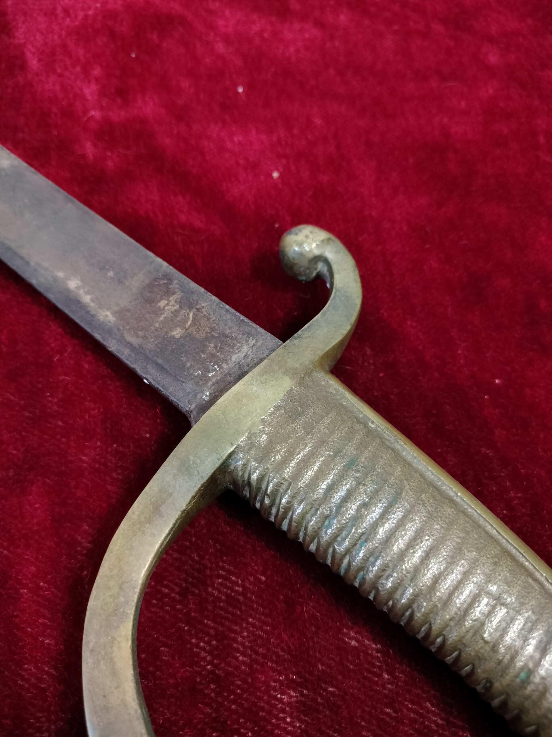 VER IMÁGENES PARA COMPROBAR EL ESTADO REAL.  LAS IMÁGENES FORMAN PARTE DE LA DESCRIPCIÓN. SABLE CURVO DE GALA PARA OFICIAL DE CABALLERÍA. ESPAÑA. SIGLO XIX.  USO CERIMONIAL.  SIN INSCRIPCIÓN NI ESGRAFIADO.  PÁTINA MUY DESGASTADA.  GUARDAMANO DE LATÓN O METAL CON PÁTINA DOADA.  METAL.  MEDIDAS:  LARGO HOJA: 73,5 CM. ANCHO HOJA: 2,5 CM.  GUARDAMANO: 13 X 8,5 CM.
