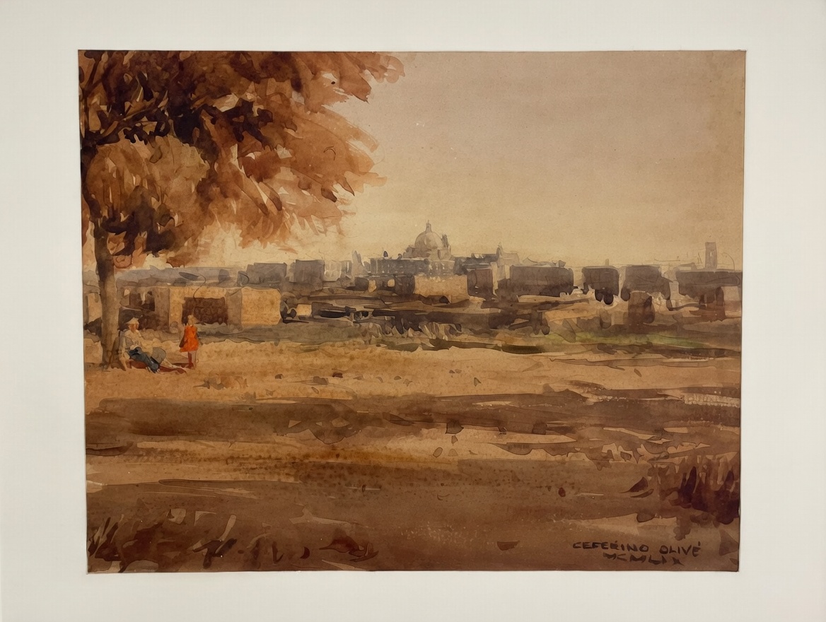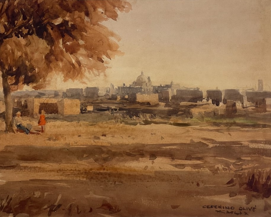 CEFERINO OLIVÉ. VISTA DE CIUDAD. ACUARELA SOBRE PAPEL. ESPAÑA. SIGLO XX.