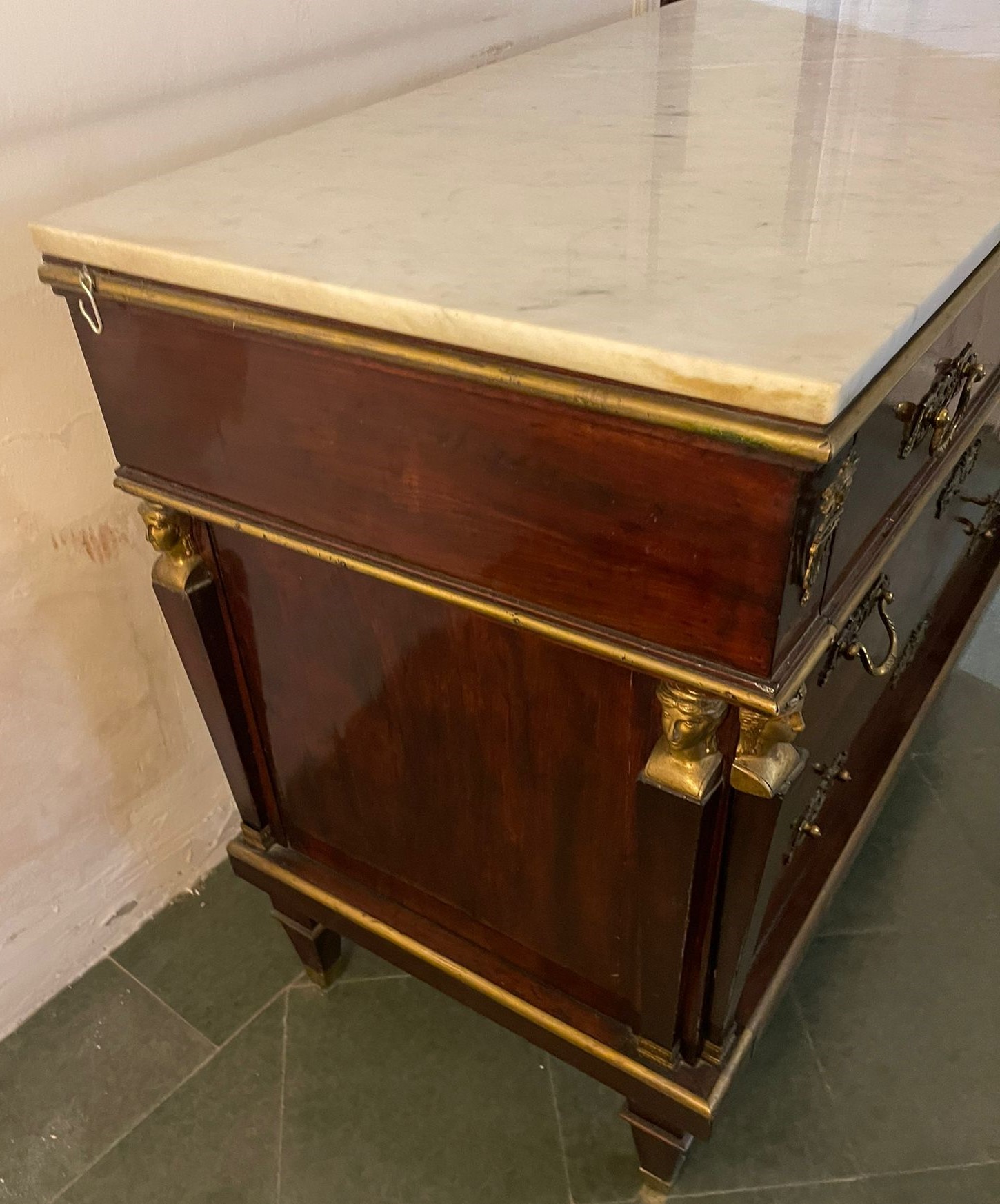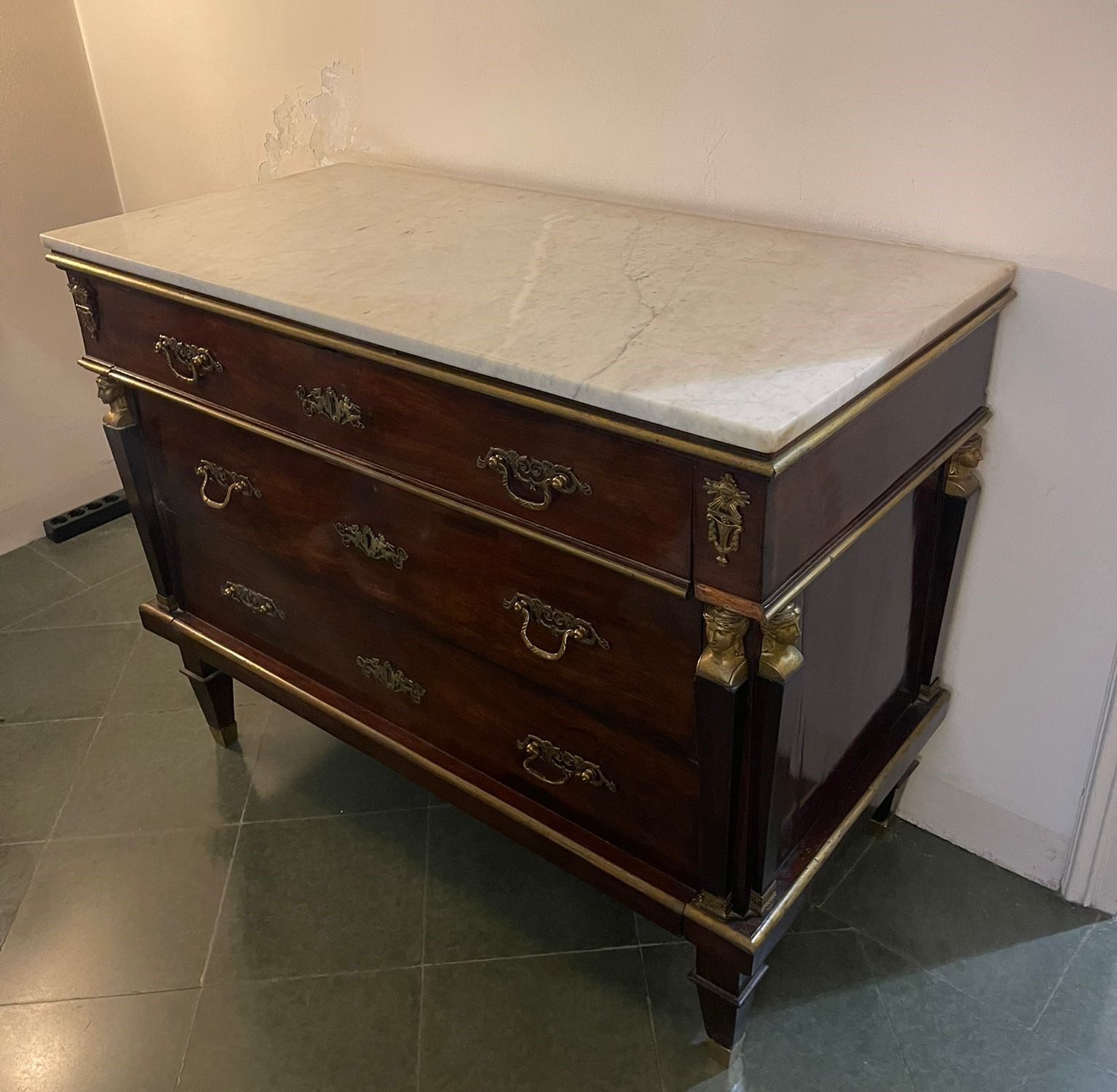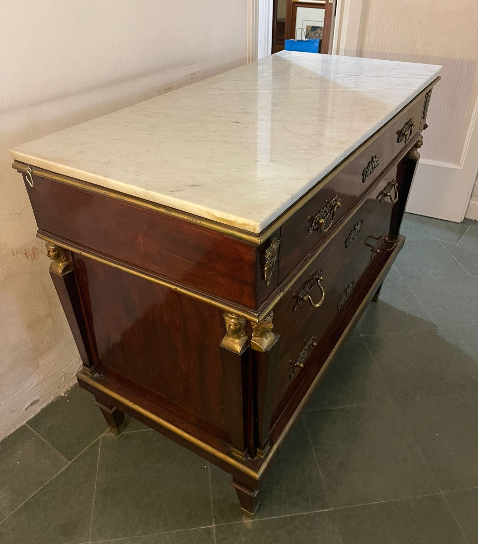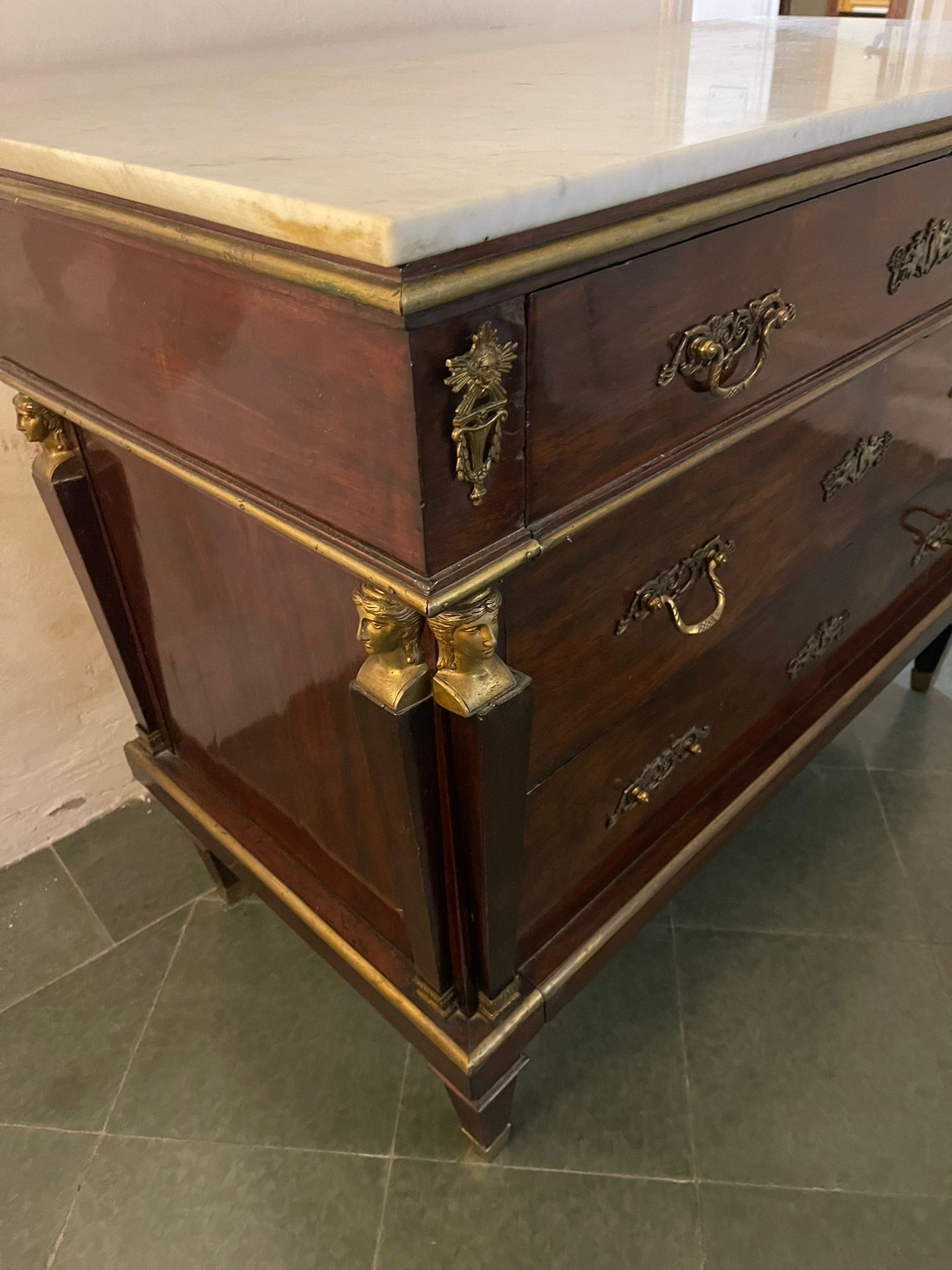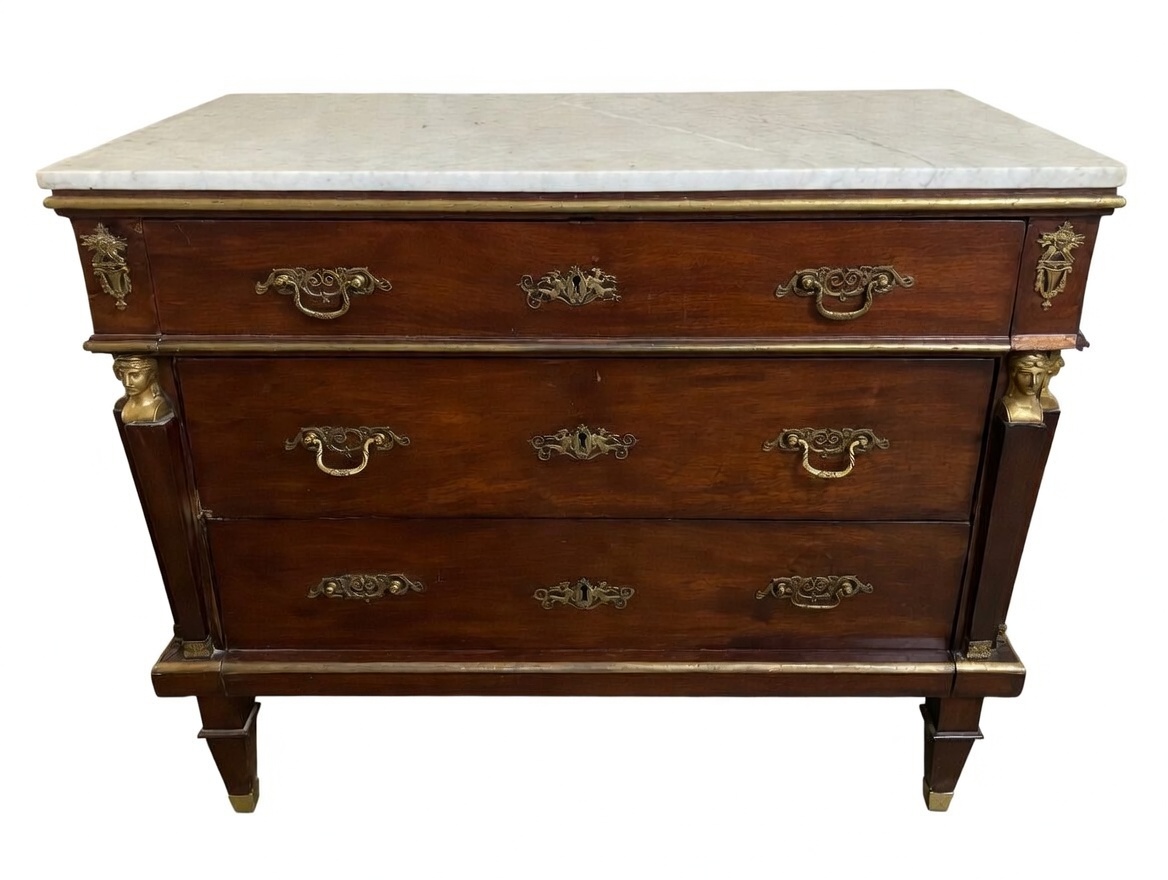 VER IMÁGENES PARA COMPROBAR EL ESTADO REAL.  LAS IMÁGENES FORMAN PARTE DE LA DESCRIPCIÓN.  LOS PRECIOS DE EXPEDICIÓN SÓN ORIENTATIVOS.  CONTACTE CON NOSOTROS PARA CALCULARLOS SEGÚN SU CASO.  ÚNICAMENTE ZONA UE.  ANTIGUA CÓMODA DE INSPIRACIÓN FRANCESA. FRANCIA O ESPAÑA. SIGLOS XVIII-XIX.  MADERA DE CAOBA Y APLIQUES EN LATÓN DORADO.  BARNIZADA.  ESTILO IMPERIO, DECORADO CON BUSTOS SOBRE COLUMNAS EN LOS ÁNGULOS Y TIRADORES CON ROCAILLE.  REPISA EN MÁRMOL VETEADO.  TRES CAJONERAS. SE APRECIAN LIGEROS RESTOS DE ÓXIDO EN LOS APLIQUES DE LATÓN. BUEN ESTADO GENERAL, LIGEROS DESGASTES DEBIDO AL TIEMPO.  115 X 55 X 90 CM