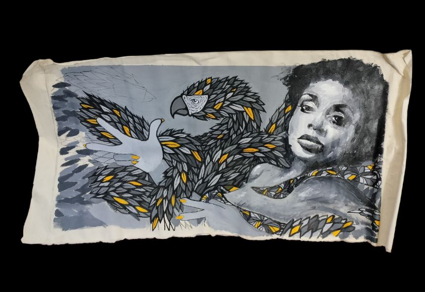 VER IMÁGENES PARA COMPROBAR EL ESTADO REAL. LAS IMÁGENES FORMAN PARTE DE LA DESCRIPCIÓN. MUJER Y AVE O DRAGÓN CON PLUMAS. SIN FIRMA. PINTURA ACRÍLICA SOBRE LIENZO. ENROLLADO, SIN MARCO. PRESENTA NOTABLES PLIEGUES, LIGEROS DESGASTES DEBIDO AL TIEMPO. 153 X 81 CM