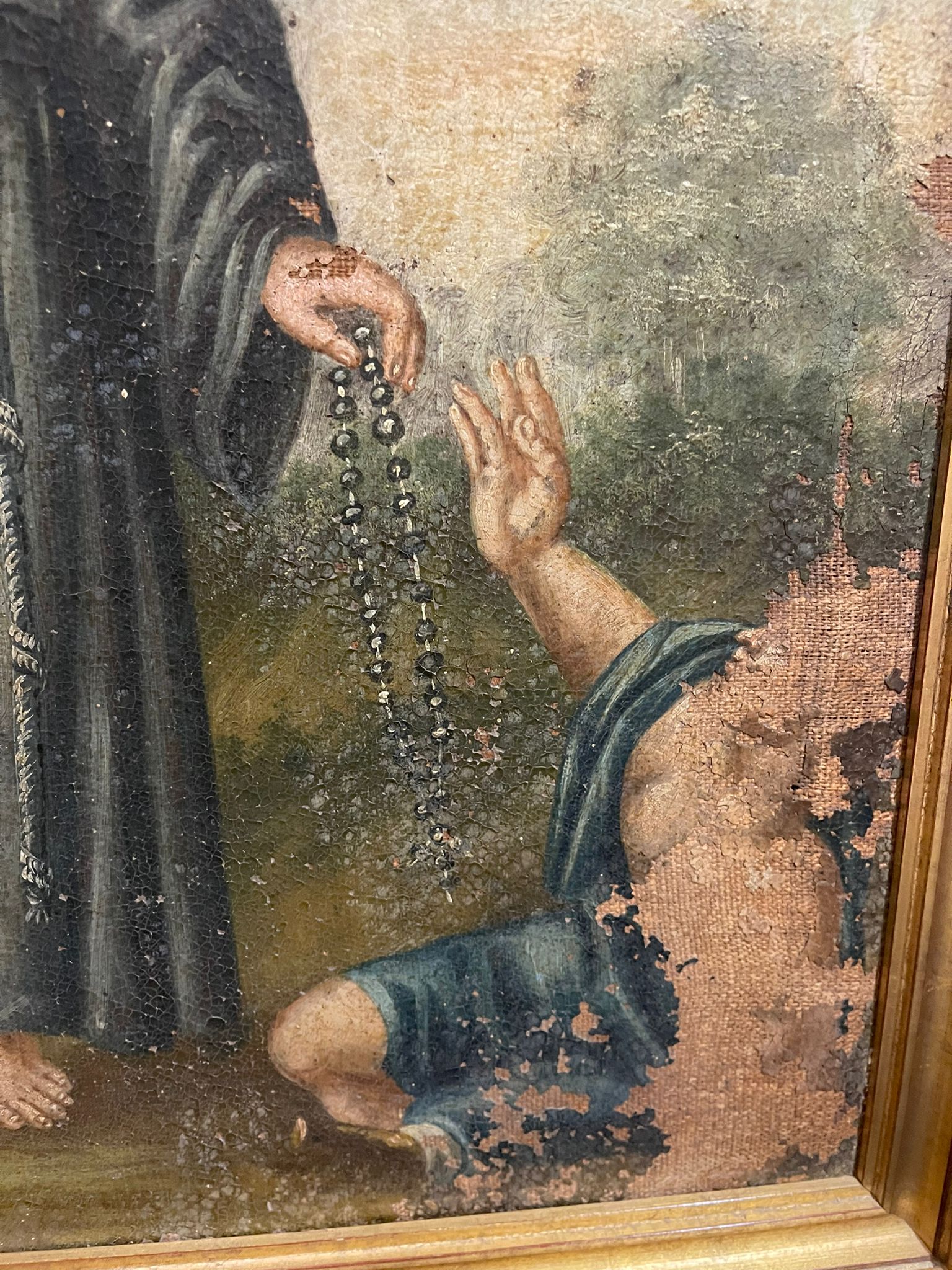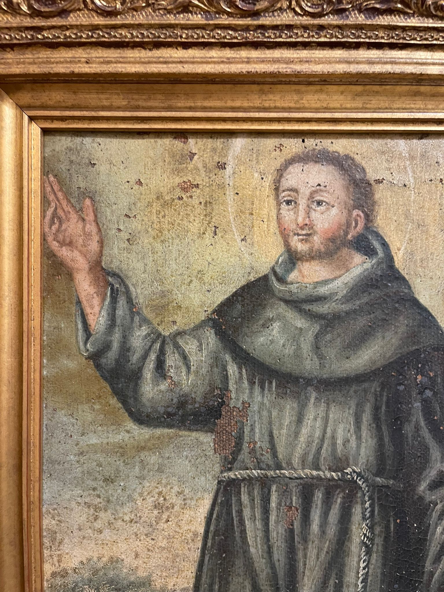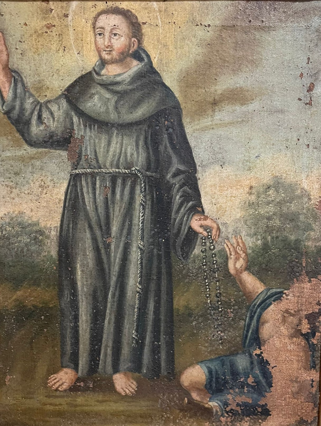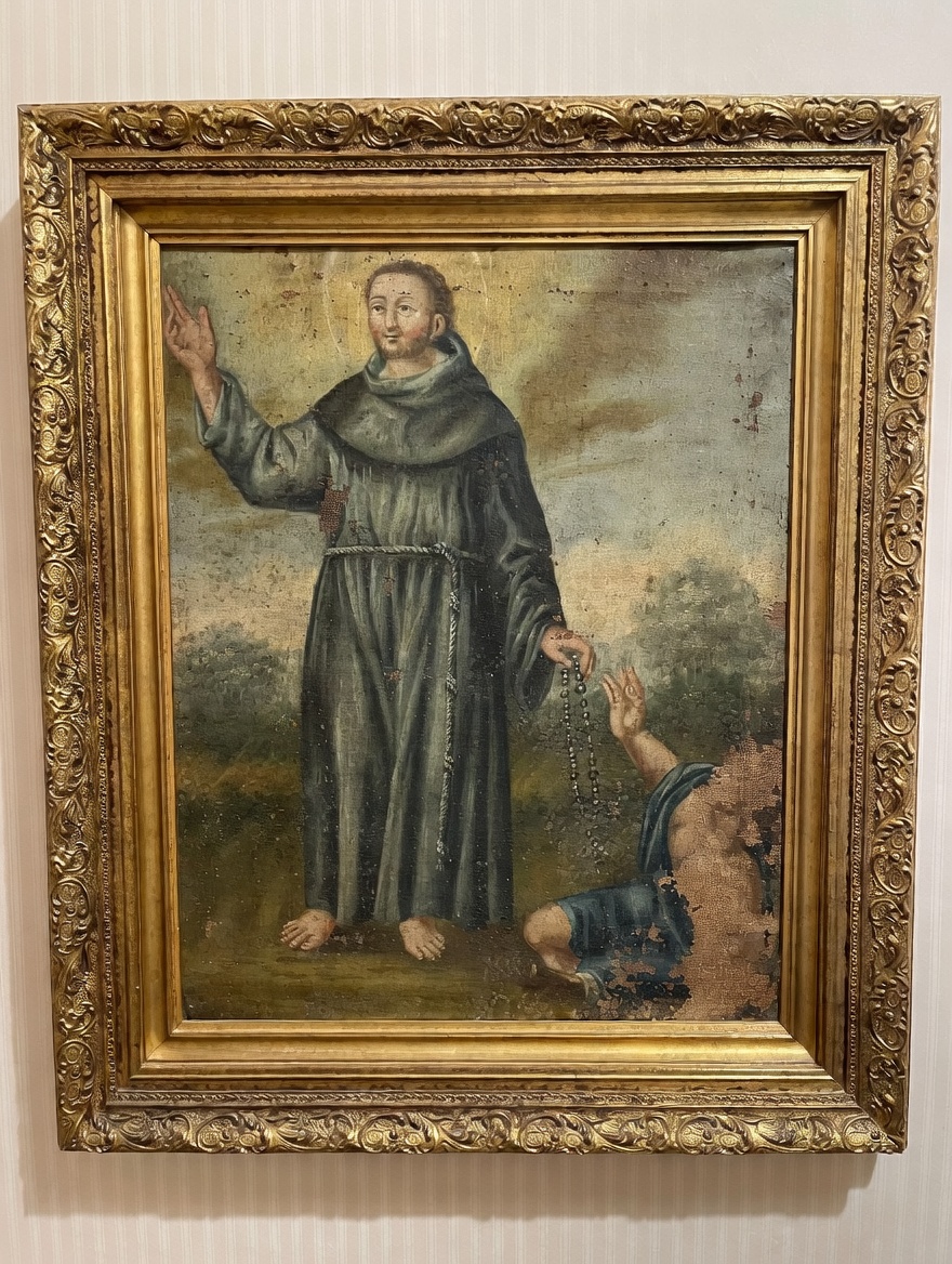 VER IMÁGENES PARA COMPROBAR EL ESTADO REAL. LAS IMÁGENES FORMAN PARTE DE LA DESCRIPCIÓN. SAN ANTONIO O SANTO CON HÁBITO NEGRO Y ROSARIO. FRAGMENTO DE PINTURA, SEGURAMENTE PROCEDE DE UN LIENZO MÁS GRANDE. MARCO EN MADERA, SIN VIDRIO PROTECTOR. SIN FIRMA NI MARCA DE AUTOR. BARROCO POPULAR. PRESENTA PÉRDIDAS DE PINTURA Y DESGASTES, BARNIZ ENVEJECIDO Y RESTOS DE SUCIEDAD. SE RECOMIENDA UNA LIMPIEZA PROFESIONAL.