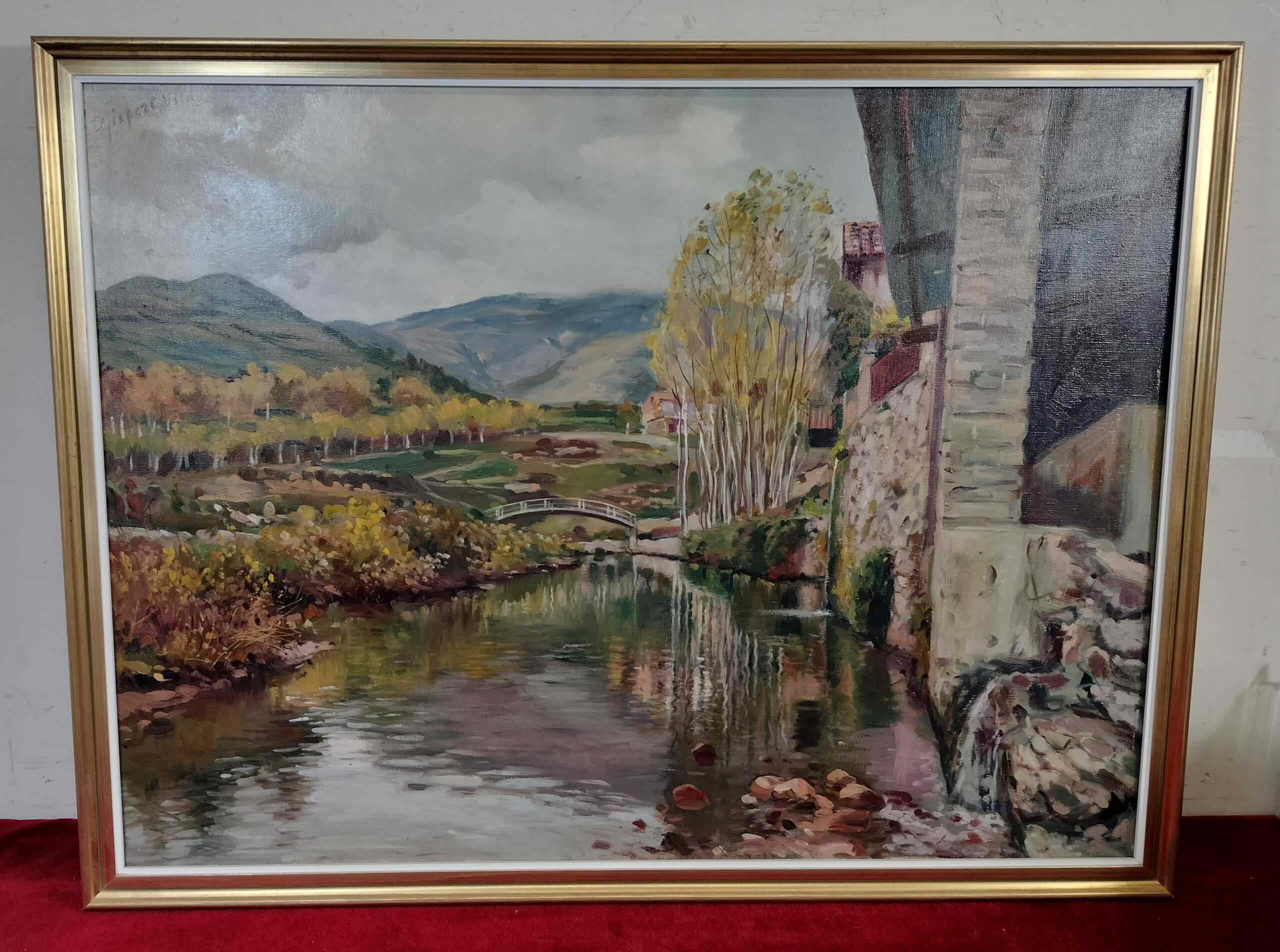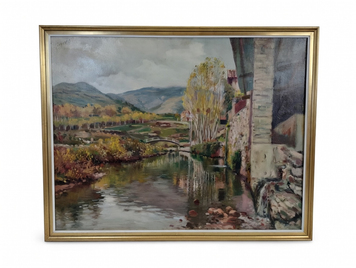 GISPERT VILA. VISTA DE RIO EN SANT JOAN DE LES ABADESSES. ÓLEO SOBRE LIENZO. ESPAÑA. XX