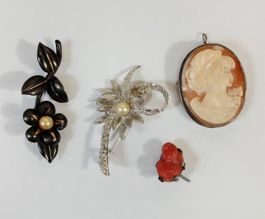 VER IMÁGENES PARA COMPROBAR EL ESTADO REAL.  LAS IMÁGENES FORMAN PARTE DE LA DESCRIPCIÓN.  LOTE DE BROCHES Y UN PENDIENTE.  EL LOTE INCLUYE:  – BROCHE EN PLATA, CON DETALLES EN DORADO. 5,5 CM LARGO APROX. 6 GR.  – BROCHE EN PLATA Y CRISTALES, CON MOTIVOS VEGETALES. 5,5 LARGO APROX. 8 GR. – CAMAFEO CON ROSTRO TALLADO EN CONCHA. 3 X 3,5 CM. 7 GR.  – PENDIENTE SOBRE FONDO ROJO, CON ROSTRO TALLADO EN CONCHA. 1,2 X 1,5 CM. 3 GR.  LIGEROS DESGASTES, VER IMÁGENES.