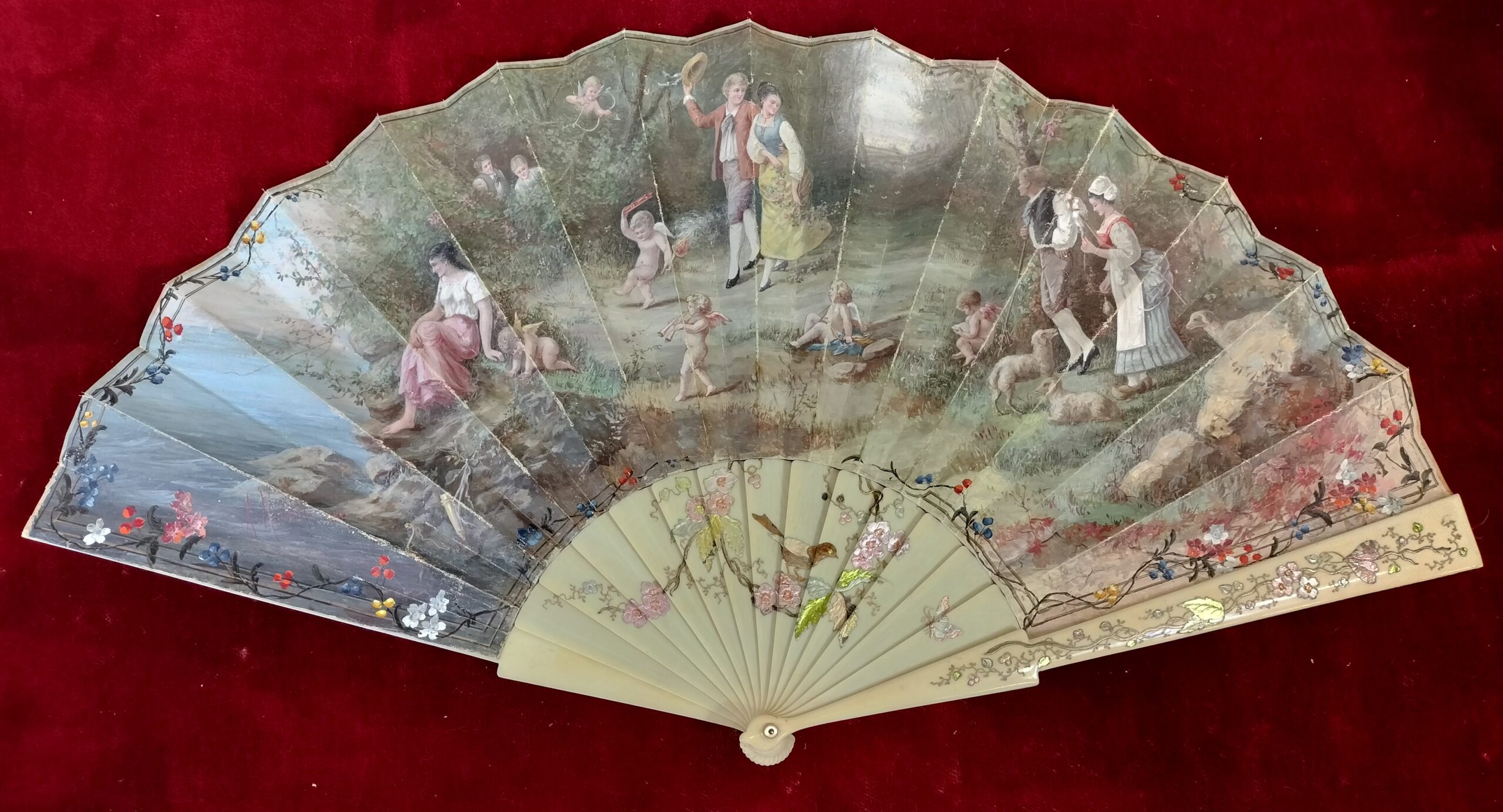 ANTIGUO ABANICO PERICON CON ESCENAS CAMPESTRES. PAPEL PERGAMINO PINTADO A MANO. ESPAÑA. XIX.
