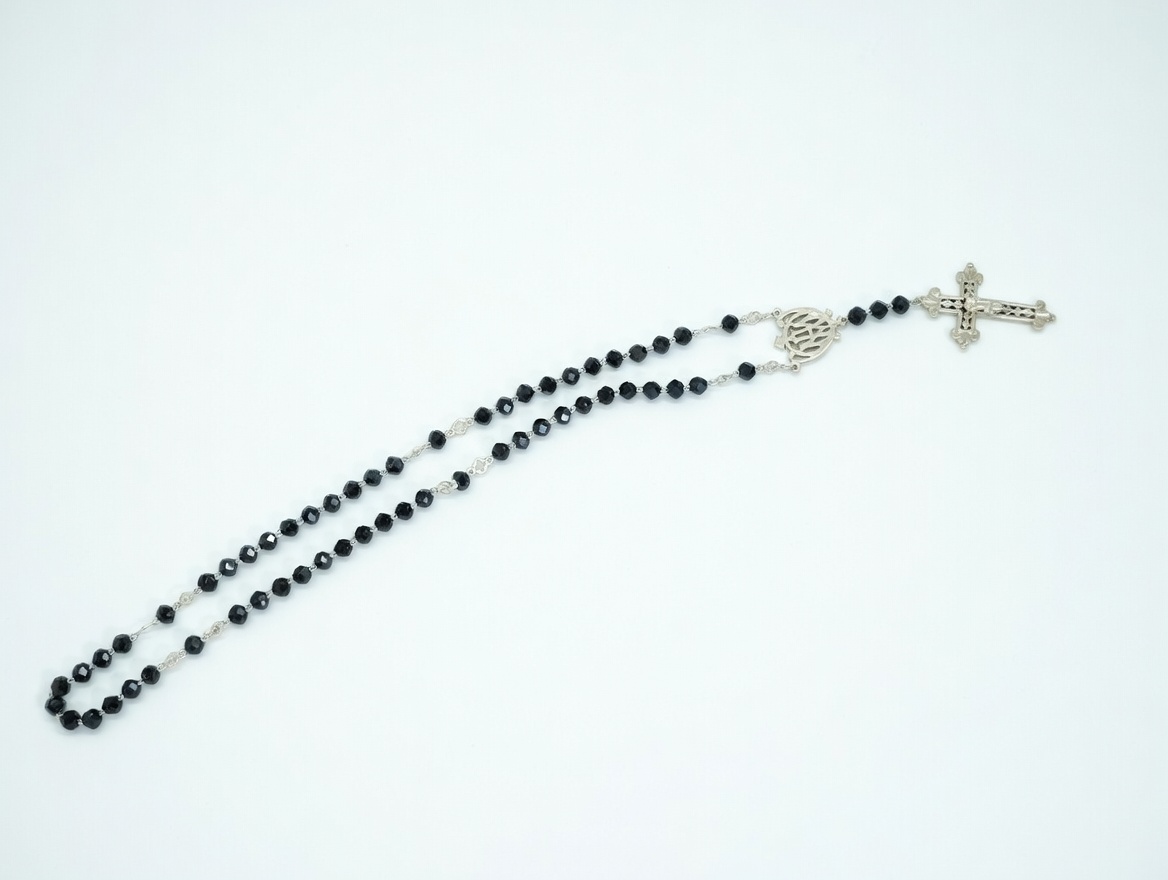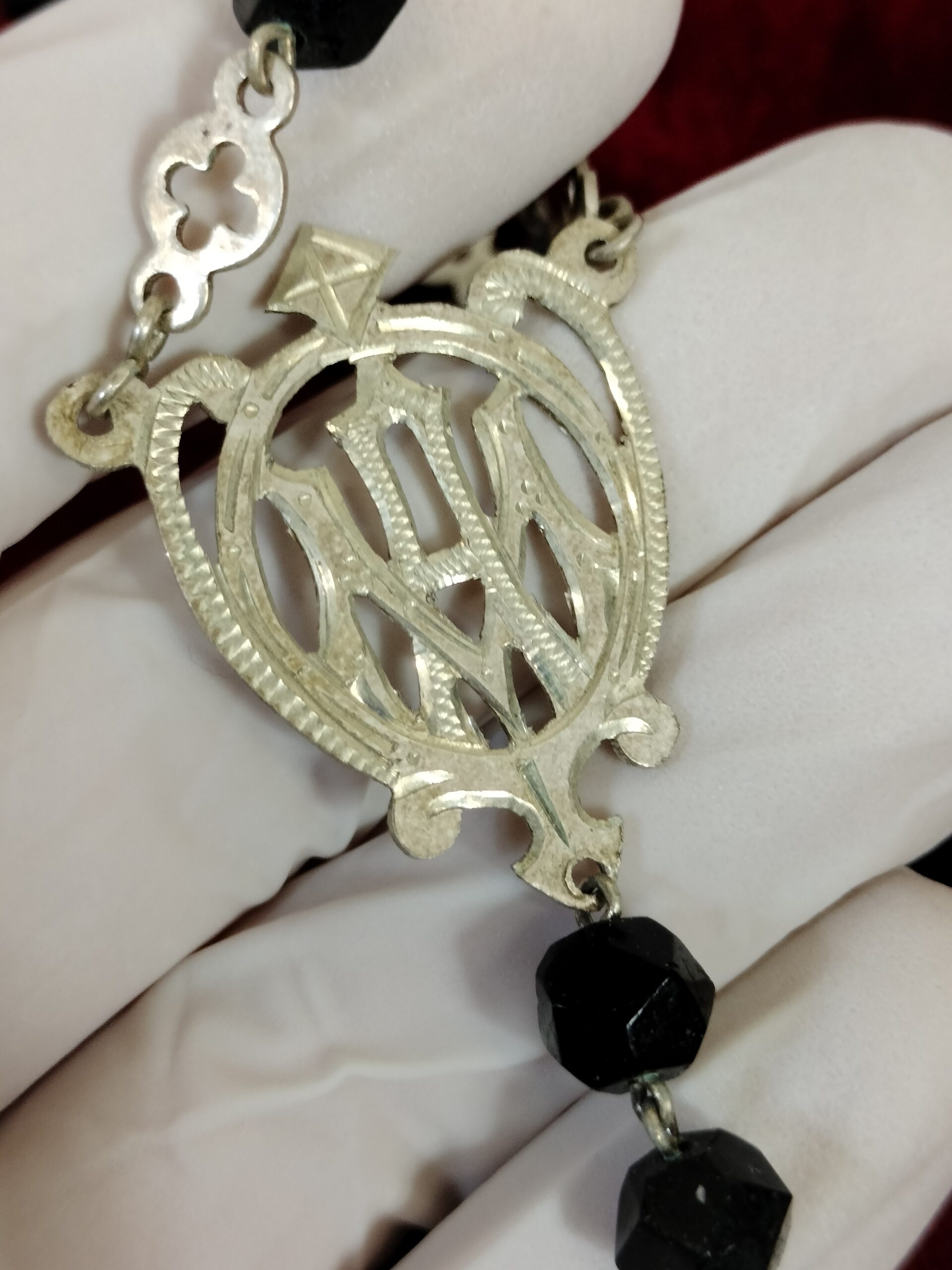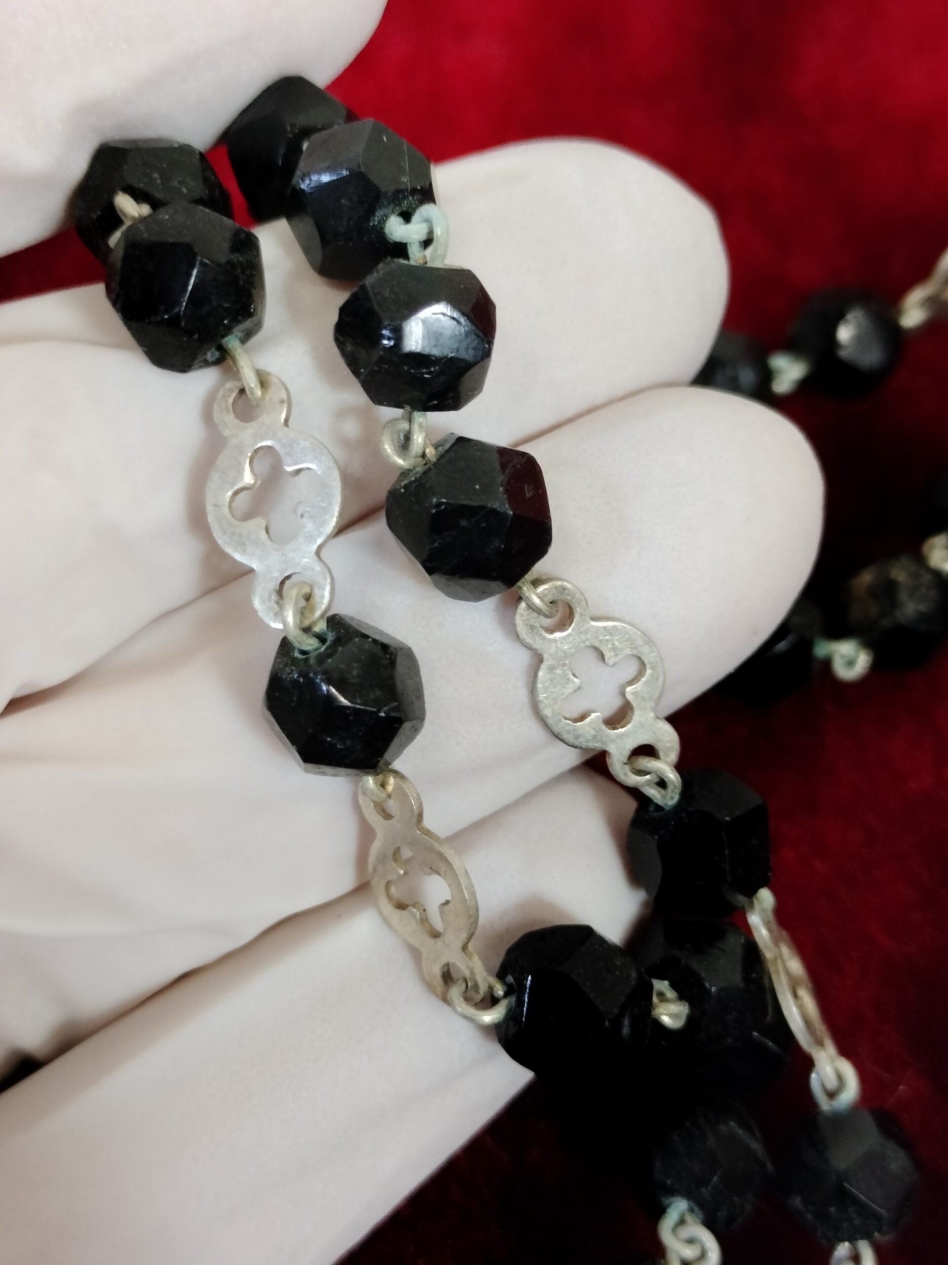 ANTIGUO ROSARIO CON CRUCIFIJO. PLATA Y CUENTAS DE AZABACHE. ESPAÑA. SIGLOS XIX-XX