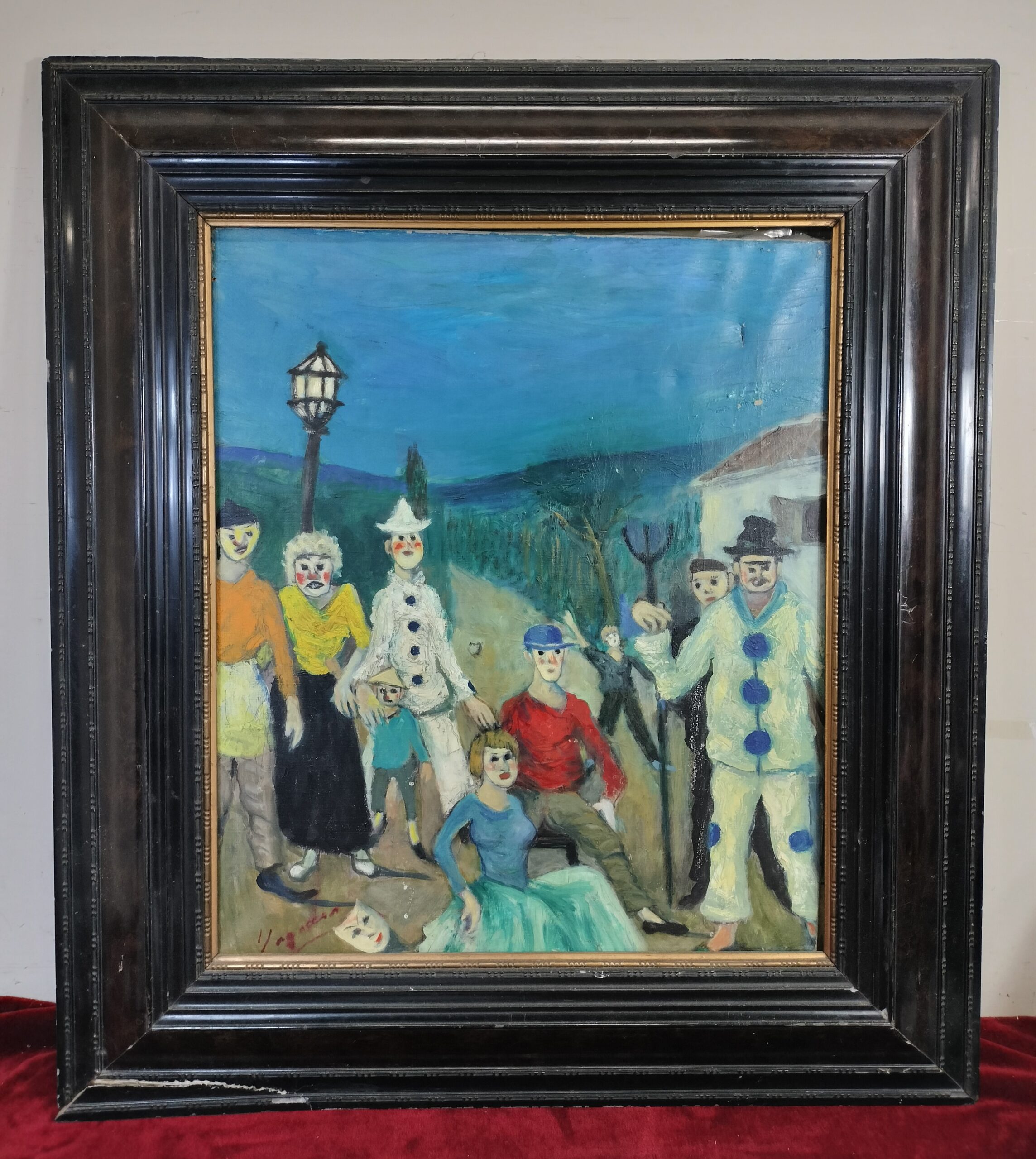 VER IMÁGENES PARA COMPROBAR EL ESTADO REAL. LAS IMÁGENES FORMAN PARTE DE LA DESCRIPCIÓN. CARNAVAL EN LA ALDEA. FIRMADO EN LA ESQUINA INFERIOR IZQUIERDA: YAGO CÉSAR. ÓLEO SOBRE LIENZO. MARCO DE MADERA, CON LIGERAS EROSIONES, SIN VIDRIO PROTECTOR. ROTURA DEL LIENZO EN LA ESQUINA SUPERIOR DERECHA. LIGERO CRAQUELADO Y PEQUEÑAS PÉRDIDAS DE PINTURA. EL LIENZO SE ENCUENTRA NOTABLEMENTE DESENCAJADO DEL MARCO. Yago César (Madrid, 1890 o 1893 – Barcelona, 1975), conocido también por el seudónimo literario Fray Galán, fue pintor, escultor, grabador, escritor y crítico de arte. Desde joven fue discípulo del profesor de dibujo Francesc d’A. Galí y se inscribió en la academia Baixas de Barcelona, donde desarrolló su formación artística. Su pareja, Eulogia Porto de Salvador, también se dedicaba a la pintura. Hijo de César de Salvador de Pagès (1862–1928) y Josefa de Solá i Prats de Guardiola (f. 1929), y hermano de Felipe de Salvador de Solà, Yago César ejerció como crítico de arte en publicaciones como La Esfera y El Noticiero Universal. Como escritor, utilizó el seudónimo Fray Galán y publicó cuentos, novelas, poesía, comedias y dramas, siempre en castellano. Entre sus obras destacan De la primera cosecha (1906), Fatal regreso (drama romántico, Barcelona, 1910), las novelas El misterio de un robo y La muerta viva, el drama Laura (premiado, 1912) y la novela La trigueña bruta (Barcelona, 1913). MEDIDAS: MARCO: 82 X 92,5 CM PINTURA: 52,5 X 62,6 CM.