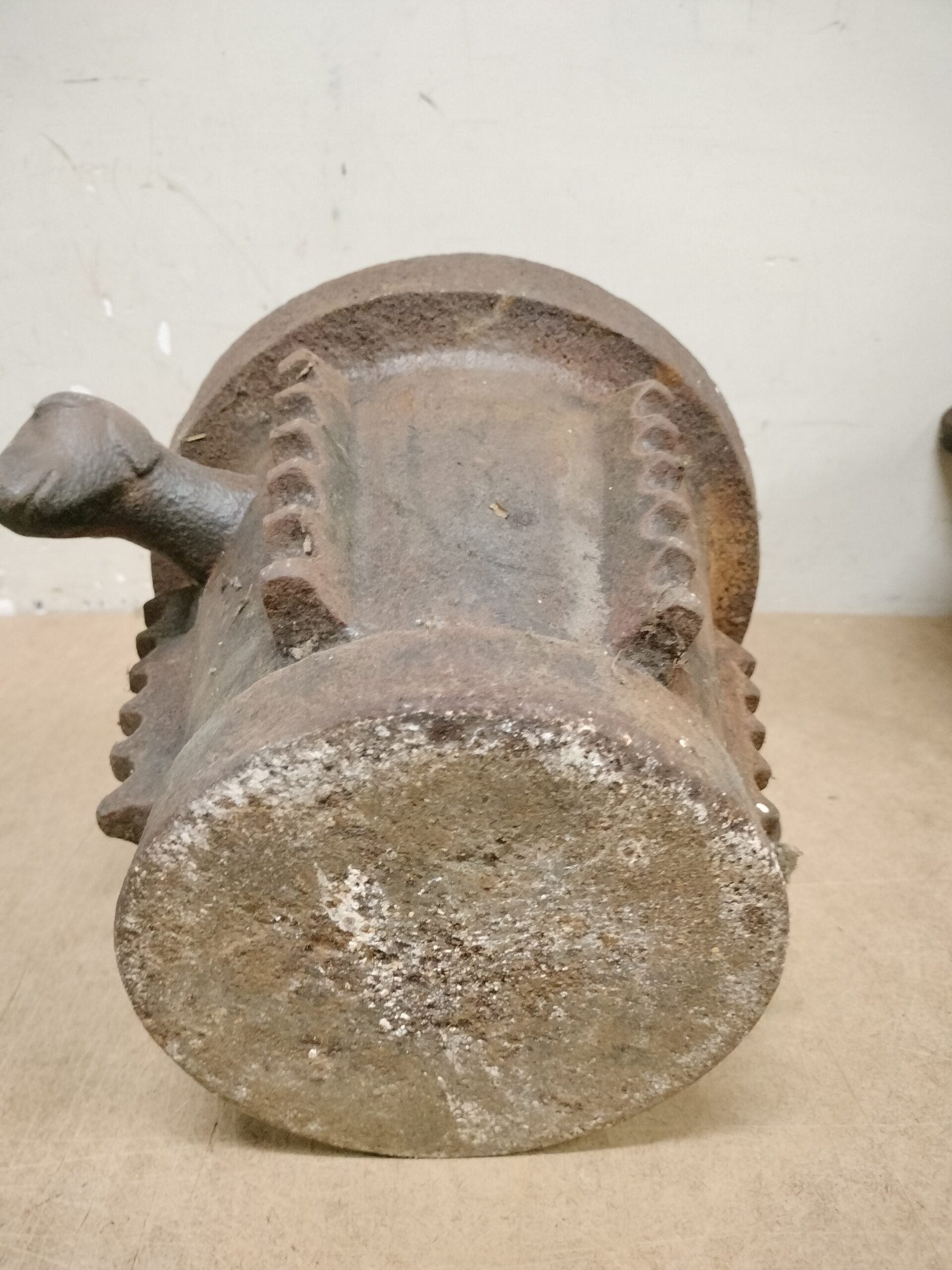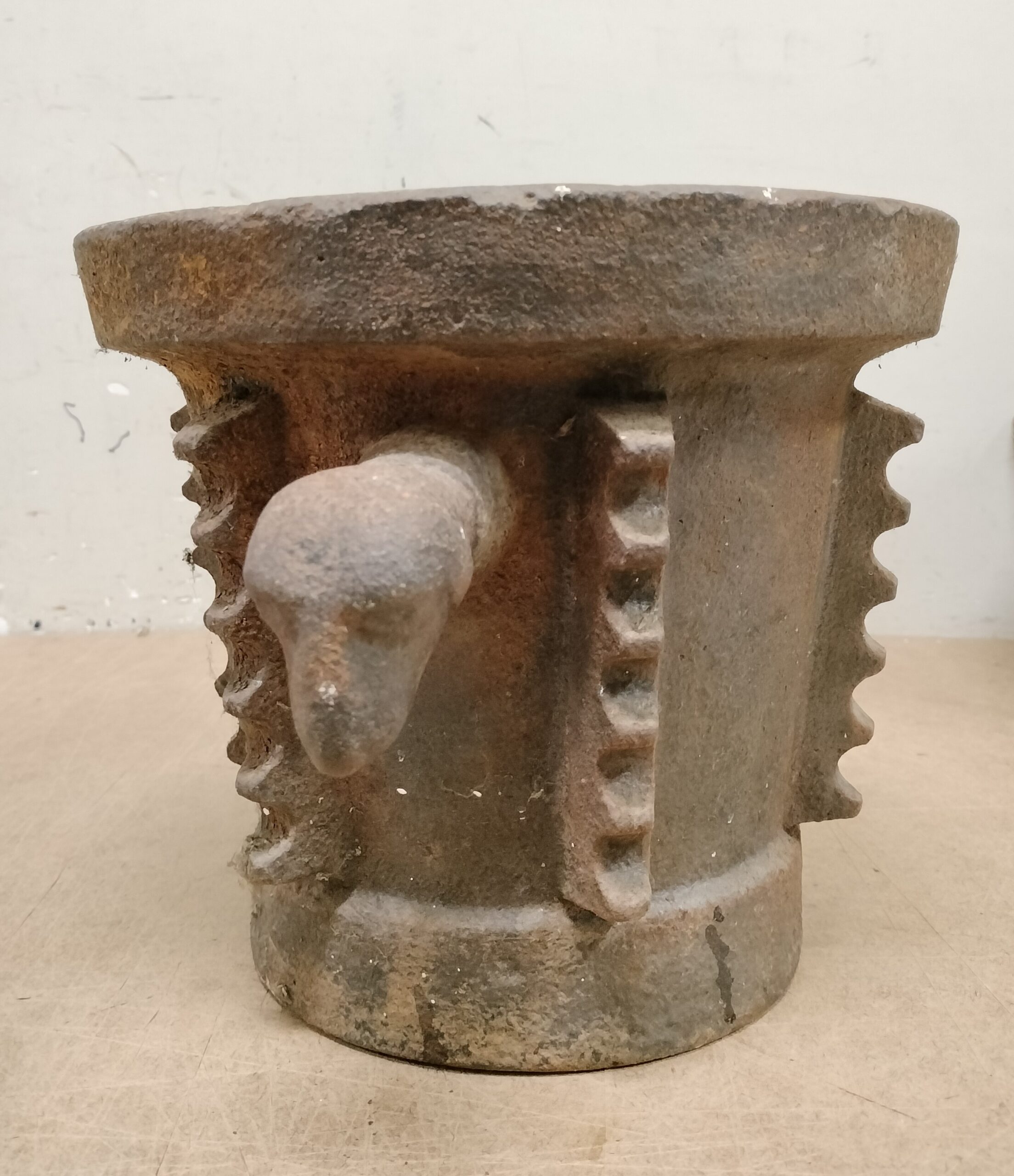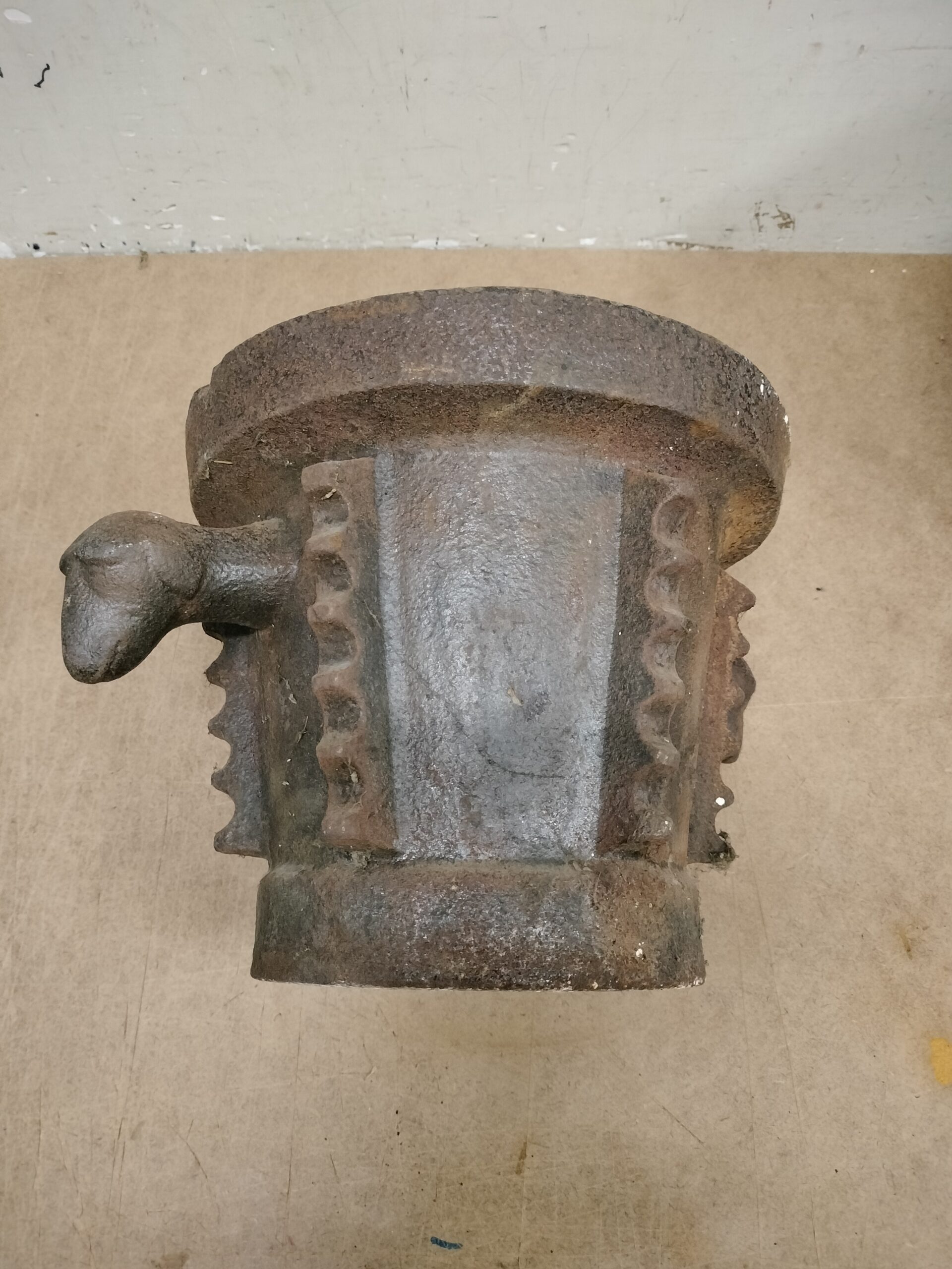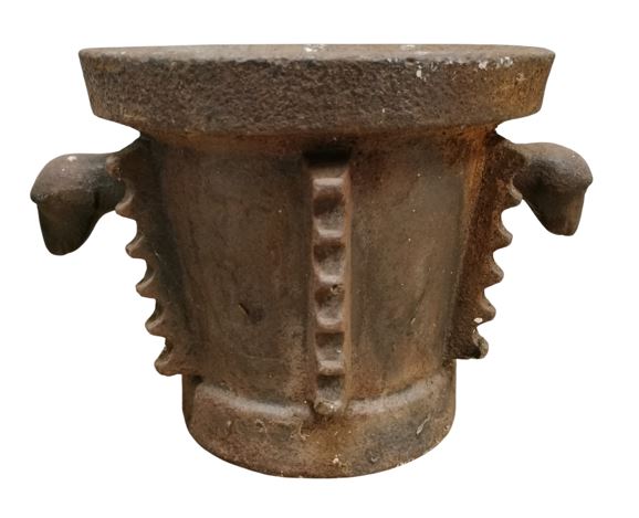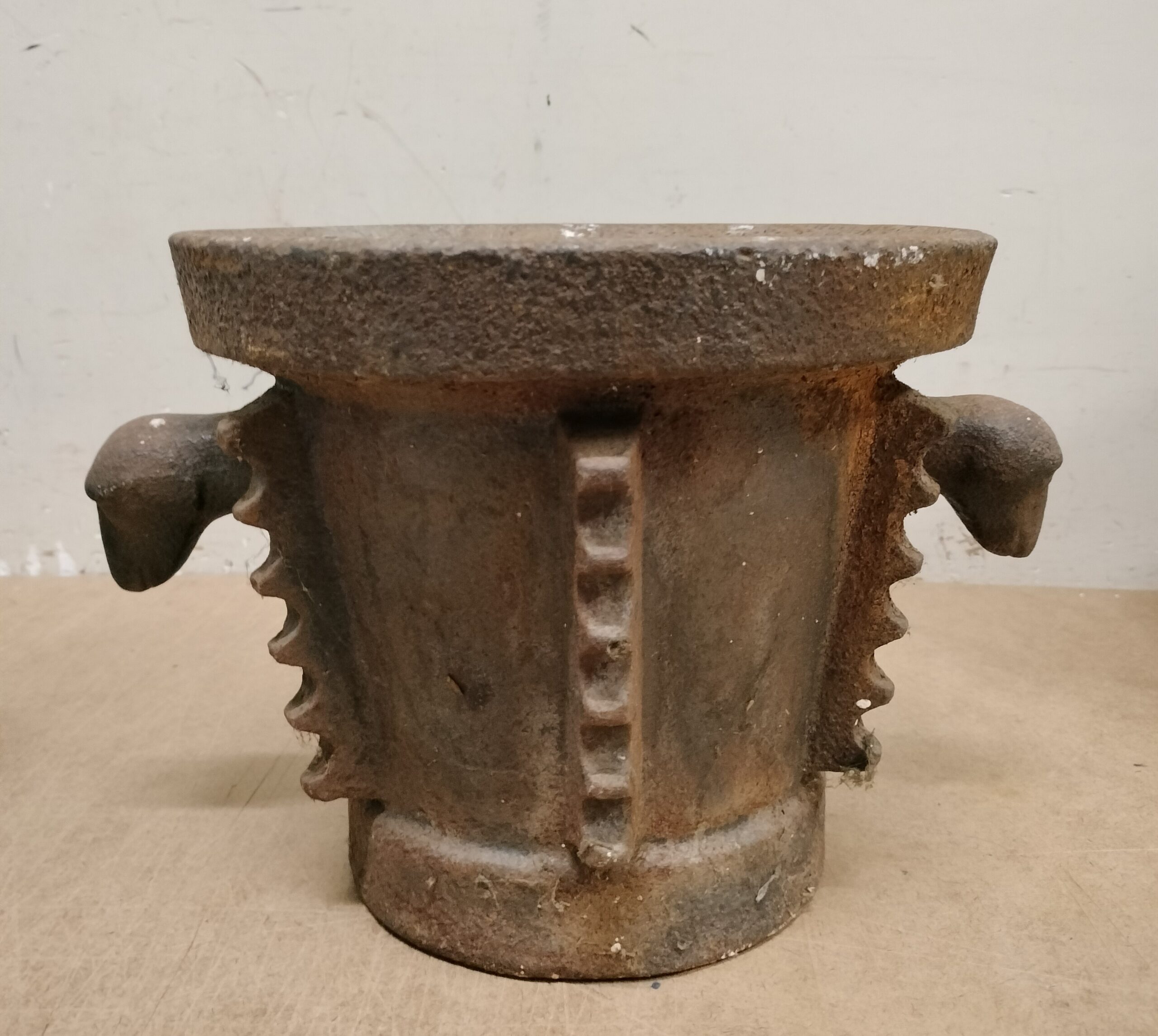 VER IMÁGENES PARA COMPROBAR EL ESTADO REAL. LAS IMÁGENES FORMAN PARTE DE LA DESCRIPCIÓN. ANTIGUO MORTERO CON COSTILLAS DE HIERRO. ASAS REMATADES EN CANES. SIN MARCA DE AUTOR O DE FUNDICIÓN. SIGUIENDO MODELOS RENACENTISTAS. PRESENTA DESGASTES Y EROSIONES DEBIDO AL TIEMPO. LIGEROS RESTOS DE ÓXIDO. MEDIDAS: 22,5 CM ALTO. BASE: 18 X 18 CM. BOCA: 27 X 27 CM.