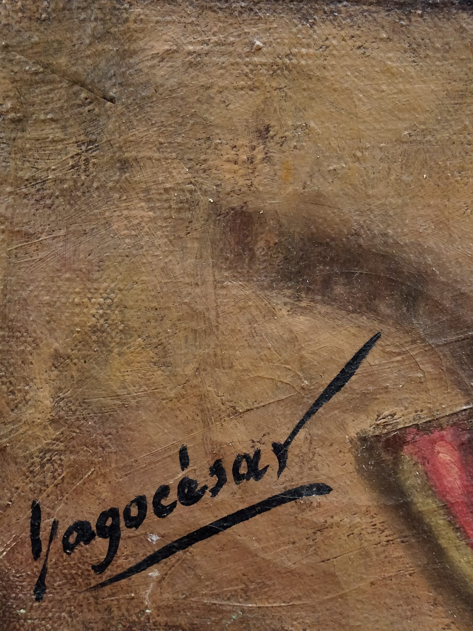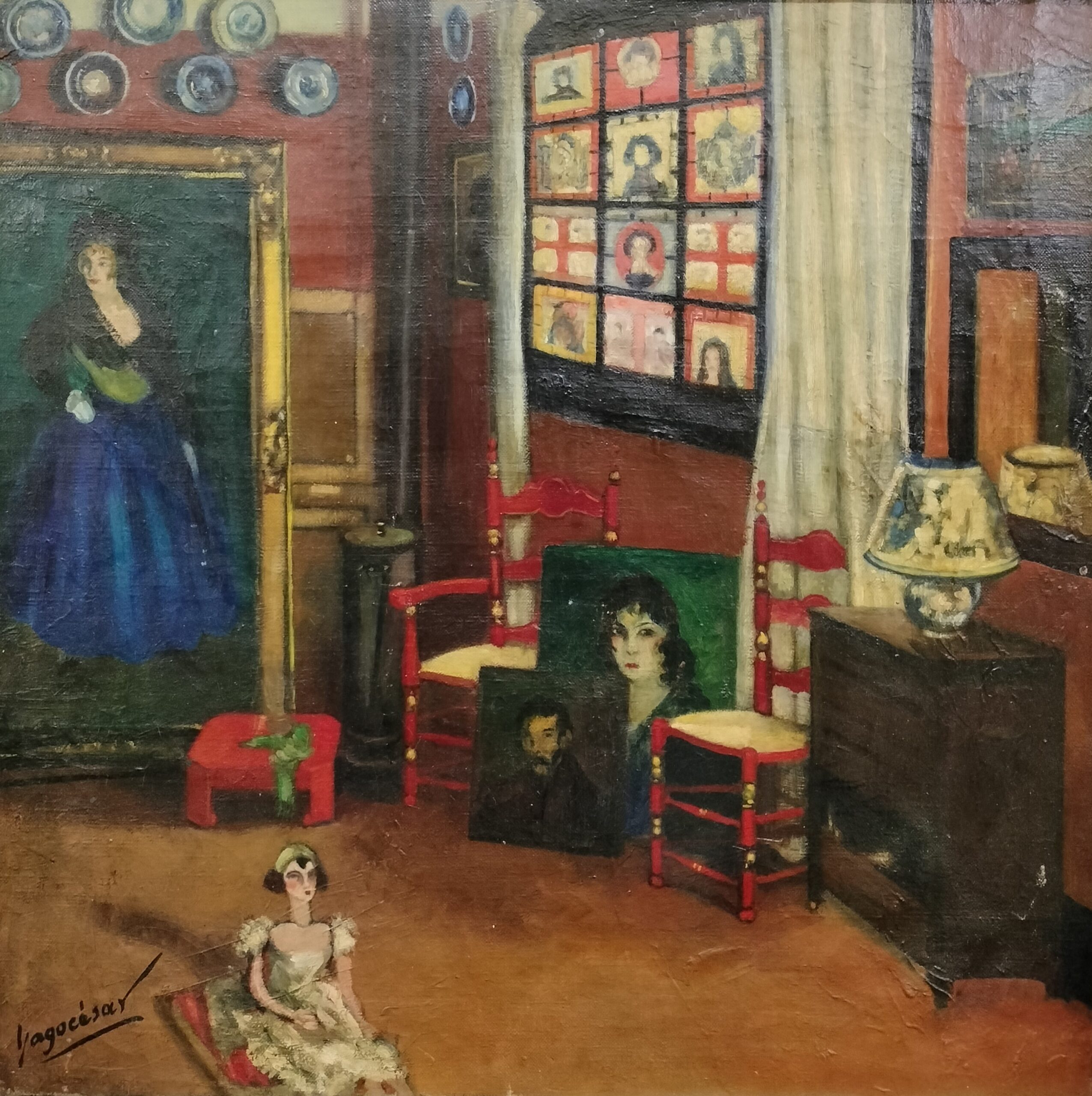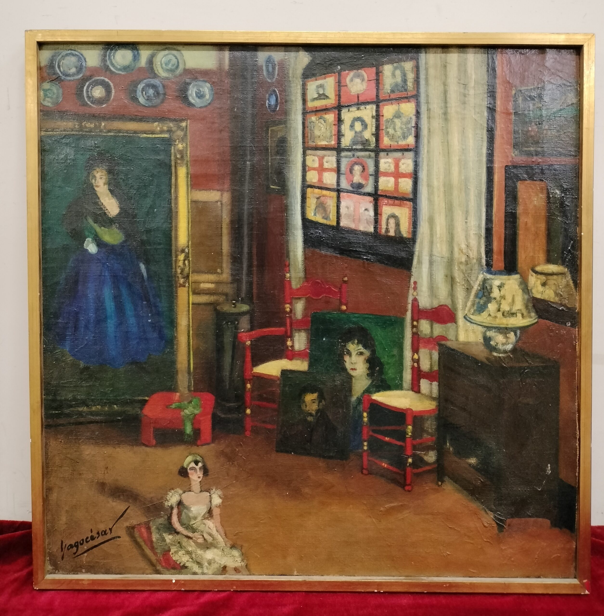 VER IMÁGENES PARA COMPROBAR EL ESTADO REAL. LAS IMÁGENES FORMAN PARTE DE LA DESCRIPCIÓN. UN RINCÓN DE MI ESTUDIO. FIRMADO EN LA ESQUINA INFERIOR IZQUIERDA: YAGOCÉSAR. ÓLEO SOBRE LIENZO. MARCO DE MADERA, SIN VIDRIO PROTECTOR. LIGEROS RESTOS DE SUCIEDAD, BORDES LIGERAMENTE SEPARADOS DEL MARCO. VER IMÁGENES. Yago César (Madrid, 1890 o 1893 – Barcelona, 1975), conocido también por el seudónimo literario Fray Galán, fue pintor, escultor, grabador, escritor y crítico de arte. Desde joven fue discípulo del profesor de dibujo Francesc d’A. Galí y se inscribió en la academia Baixas de Barcelona, donde desarrolló su formación artística. Su pareja, Eulogia Porto de Salvador, también se dedicaba a la pintura. Hijo de César de Salvador de Pagès (1862–1928) y Josefa de Solá i Prats de Guardiola (f. 1929), y hermano de Felipe de Salvador de Solà, Yago César ejerció como crítico de arte en publicaciones como La Esfera y El Noticiero Universal. Como escritor, utilizó el seudónimo Fray Galán y publicó cuentos, novelas, poesía, comedias y dramas, siempre en castellano. Entre sus obras destacan De la primera cosecha (1906), Fatal regreso (drama romántico, Barcelona, 1910), las novelas El misterio de un robo y La muerta viva, el drama Laura (premiado, 1912) y la novela La trigueña bruta (Barcelona, 1913). MEDIDAS: MARCO: 83,8 X 83,2 CM. PINTURA: 79,5 X 79,5 CM.