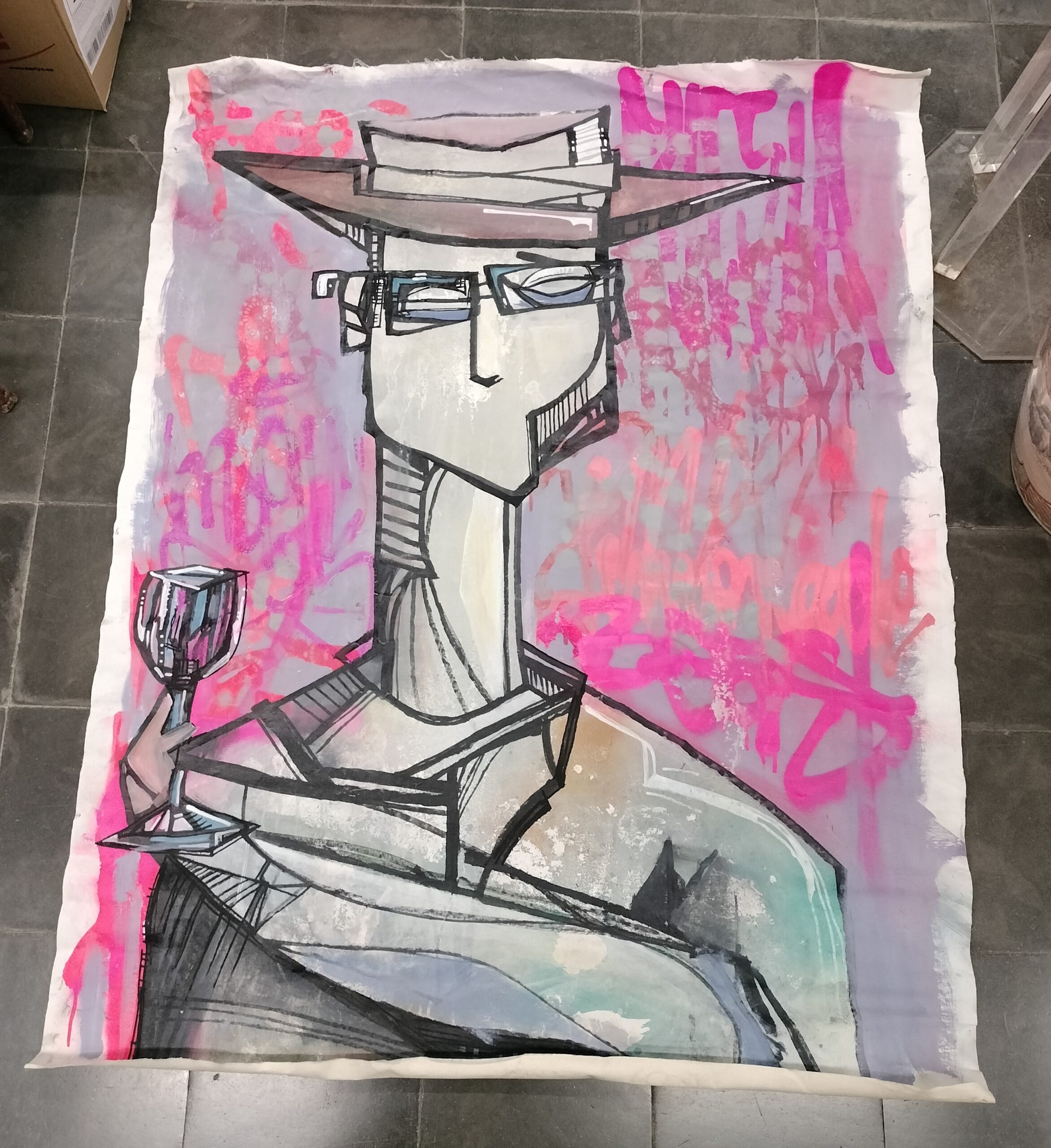 VER IMÁGENES PARA COMPROBAR EL ESTADO REAL. LAS IMÁGENES FORMAN PARTE DE LA DESCRIPCIÓN. HOMBRE CON SOMBRERO Y COPA. SIN FIRMA. LIENZO CON DESGASTES EN LOS BORDES, SIN ENMARCAR. ENROLLADO. PINTURA ACRÍLICA Y ESPRAI SOBRE LIENZO. MEDIDAS: 130 X 102 CM.