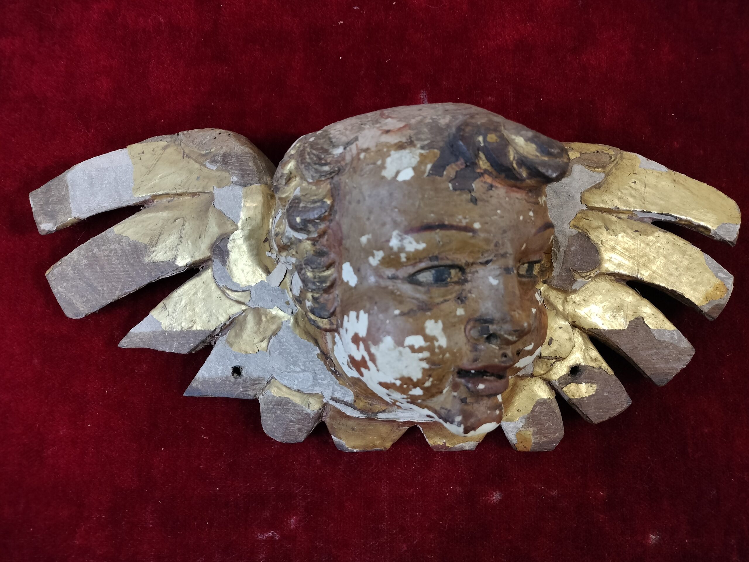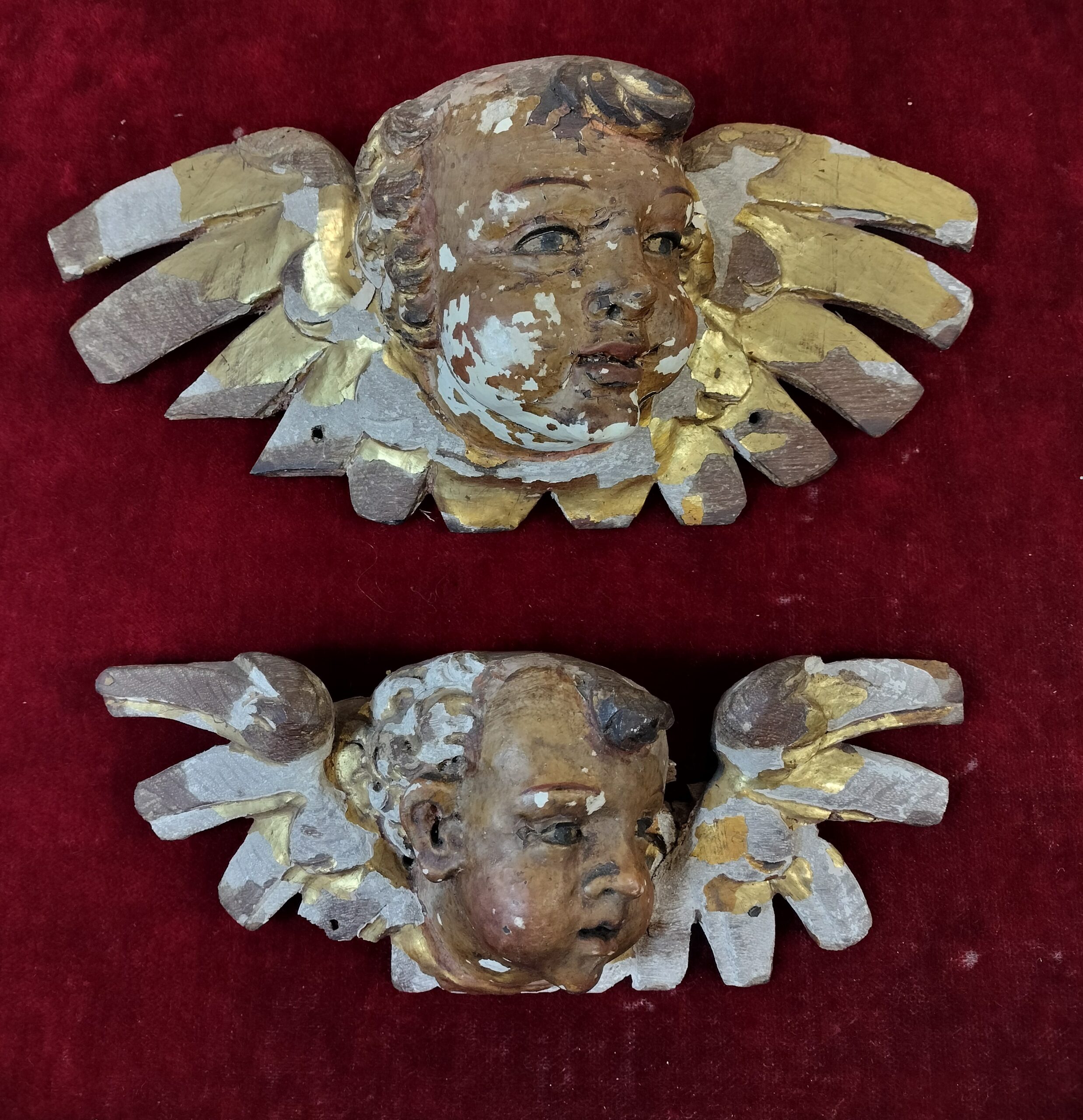 VER IMÁGENES PARA COMPROBAR EL ESTADO REAL. LAS IMÁGENES FORMAN PARTE DE LA DESCRIPCIÓN. PAREJA DE CABEZAS DE QUERUBÍNES ALADOS. SIN FIRMA NI MARCA DE AUTOR. ESTILO BARROCO. ALAS ESTOFADAS EN ORO. PRESENTAN NOTABLES DESGASTES Y PÉRDIDAS DE PÁTINA. LA PINTURA ES MUY FRÁGIL Y SE RESQUEBRAJA FÁCILMENTE. SE RECOMIENDA RESTAURACIÓN. ROTURA EN LA ALA DEL QUERUBÍN PEQUEÑO. MEDIDAS APROXIMADAS: GRANDE: 32,5 CM ANCHO X 13,5 CM LARGO X 8,5 CM ALTO. PEQUEÑO: 27 CM ANCHO X 10 CM LARGO X 5 CM ALTO.