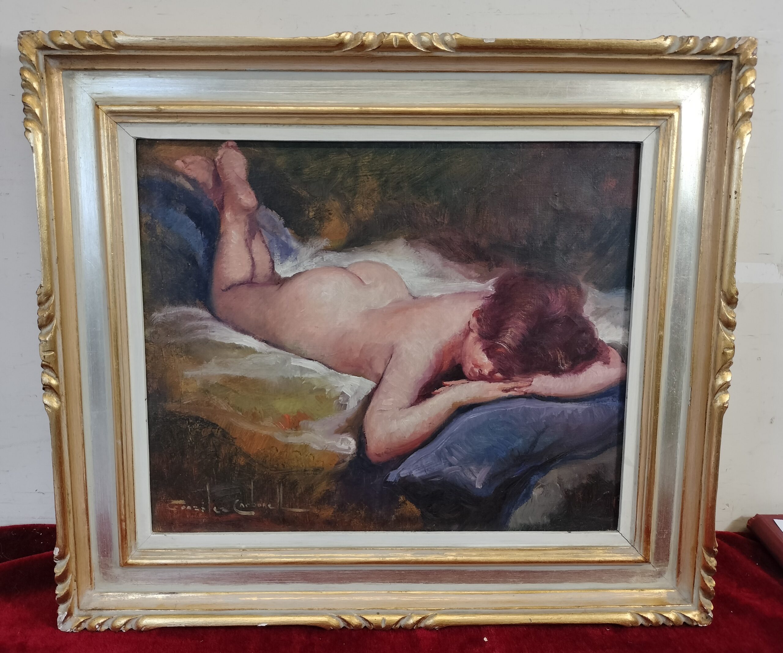 VER IMÁGENES PARA COMPROBAR EL ESTADO REAL.  LAS IMÁGENES FORMAN PARTE DE LA DESCRIPCIÓN.  DESNUDO ACOSTADO.  FIRMADO EN LA ESQUINA INFERIOR IZQUIERDA: GONZÁLEZ CARBONELL.  MARCO EN MADERA POLICROMADA, CON LIGEROS DESGASTES Y PEQUEÑAS ROTURAS.  SIN VIDRIO PROTECTOR.  NO PODEMOS GARANTIZAR SU AUTORÍA NI DISPONEMOS DE CERTIFICADO DE AUTENTICIDAD. PODRÍA TRATARSE DE UNA OBRA DE ROSENDO GONZÁLEZ CARBONELL.  MEDIDAS:  MARCO: 61,5 X 53,5 X 5 CM.  LIENZO: 44,5 X 36 CM. ROSENDO GONZÁLEZ CARBONELL (1910-1984) ROSENDO GONZÁLEZ CARBONELL ES UN PINTOR CATALÁN DE RETRATOS CON PREDILECCIÓN POR LOS COLORES FUERTES. FUE APRENDIZ DE BUENAVENTURA PUIG PERUCHO, QUE TAMBIÉN DESTACA POR EL FUERTE COLORIDO DE SUS OBRAS. ENTRE SUS TEMAS PREDOMINANTES ESTÁN LA FIGURA FEMENINA, CON INCLUSIÓN DE LA MUJER GITANA, Y LA DESNUDEZ. SU TÉCNICA DE PINTURA INCLUYE EL CLAROSCURO, LAS LUCES Y EL COLOR. PARTICIPÓ EN LAS EXPOSICIONES NACIONALES DE BELLAS ARTES DE BARCELONA, EN EL AÑO 1942 Y EN EL AÑO 1944.