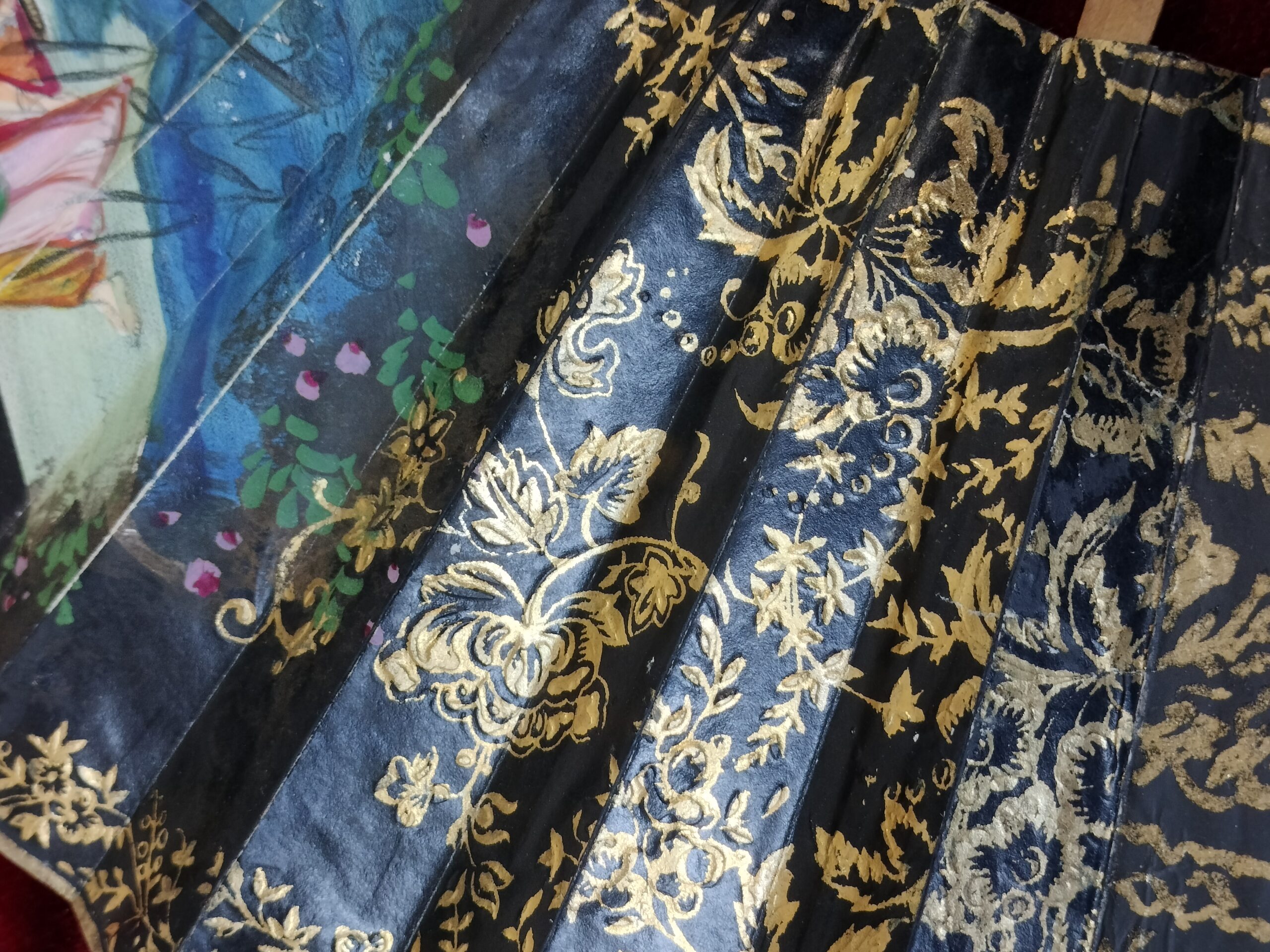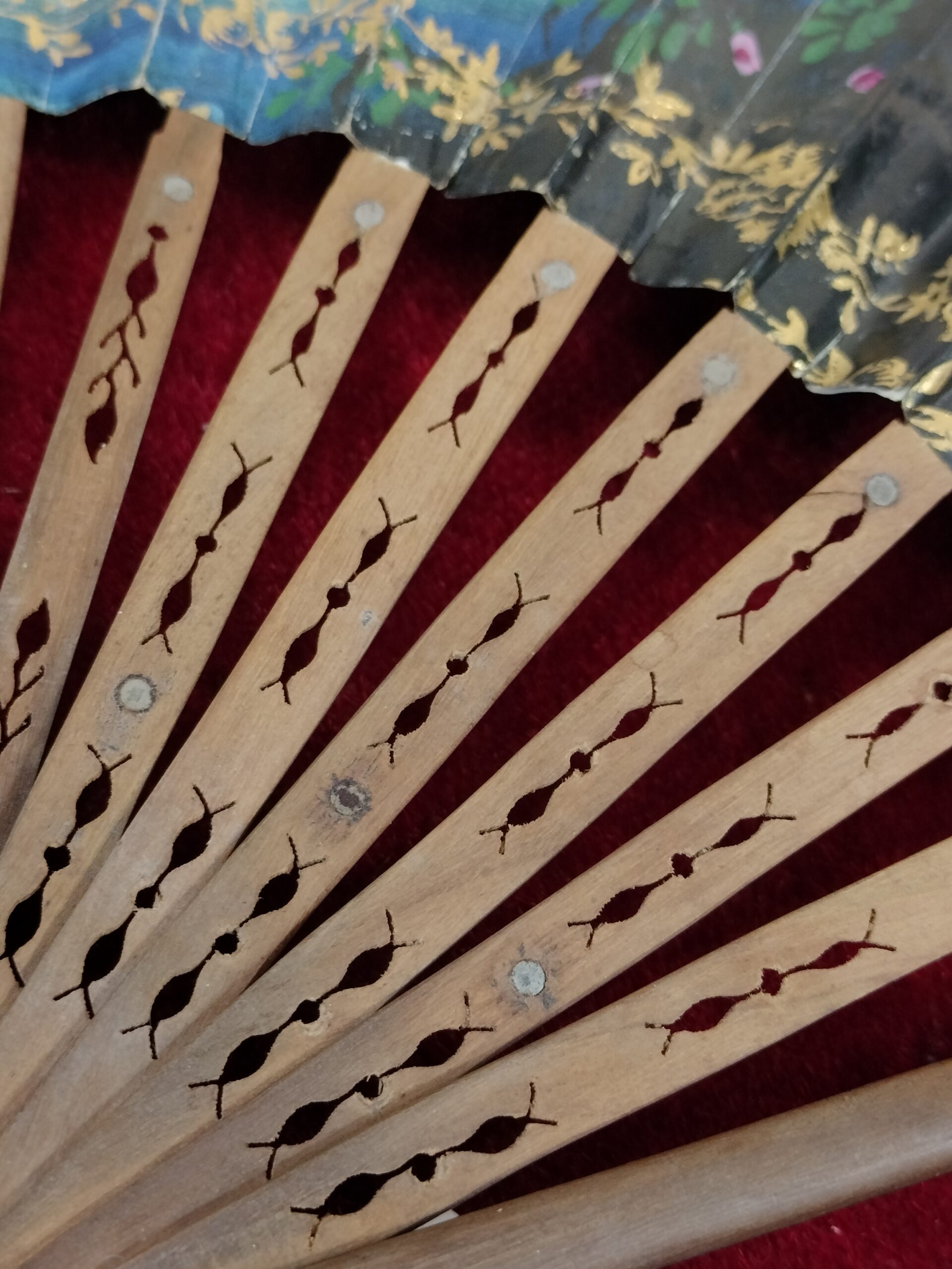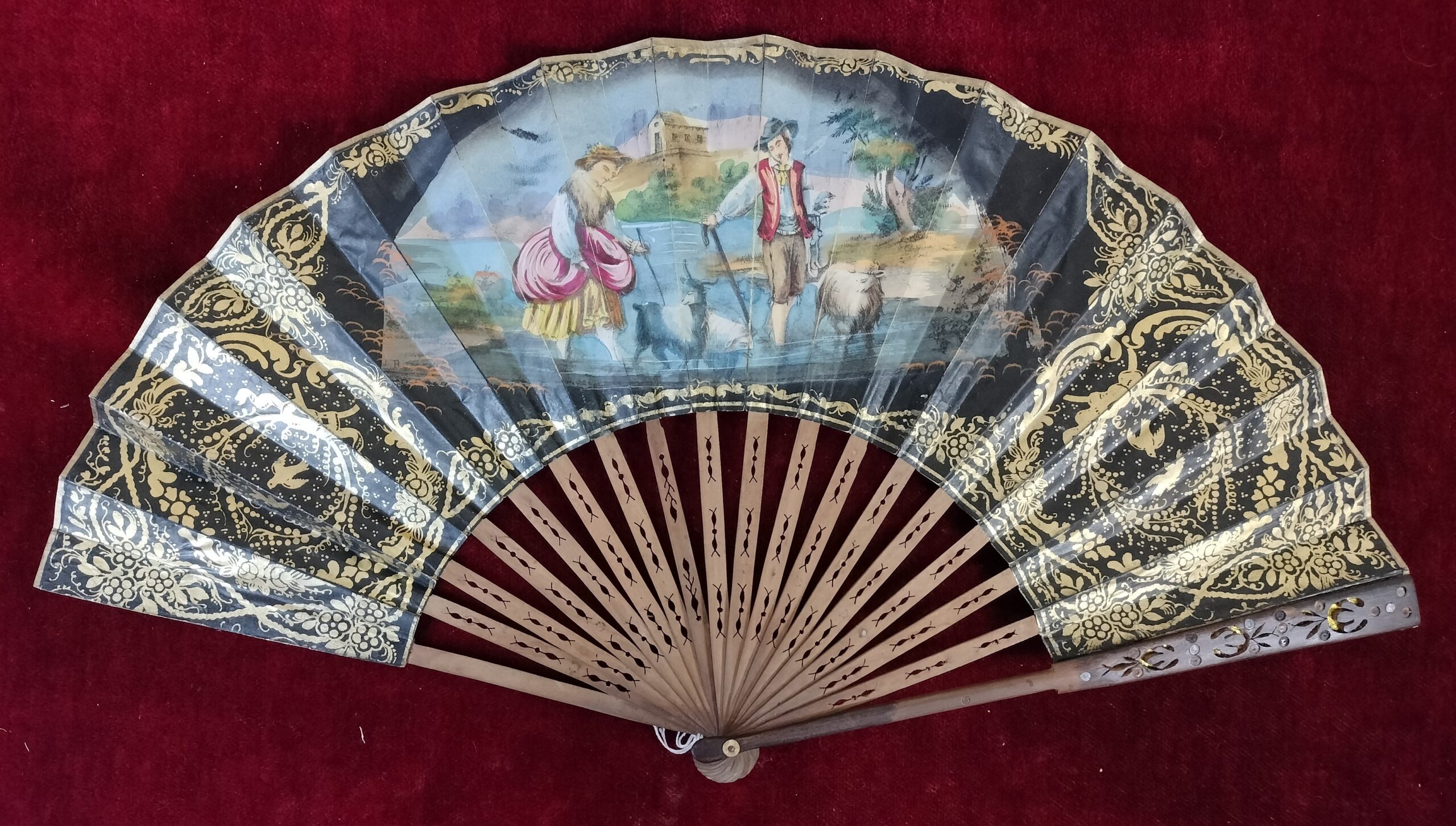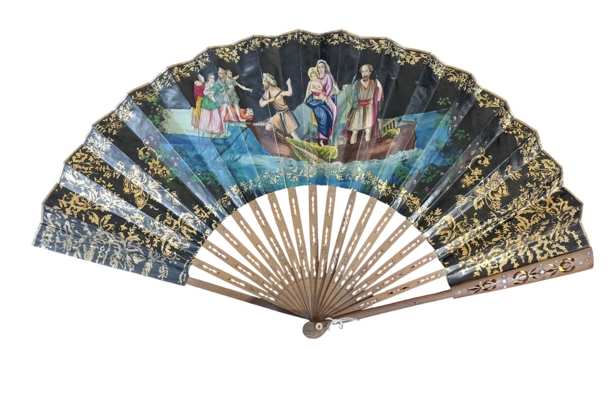 ANTIGUO ABANICO ISABELINO. VARILLAJE DE MADERA Y PAPEL PINTADO A MANO. ESPAÑA. SIGLO XIX.