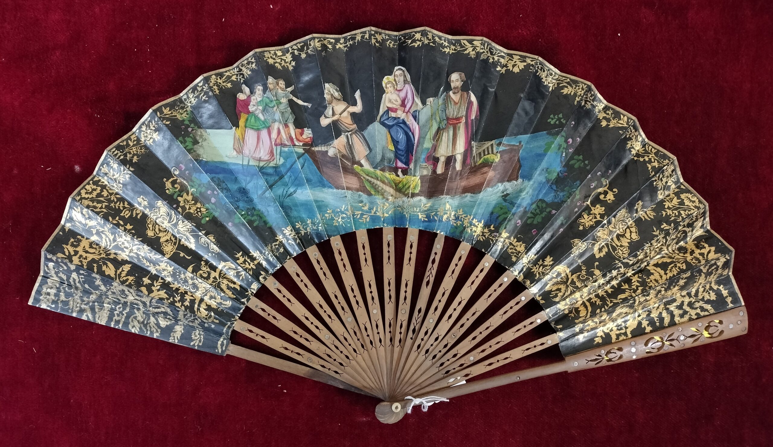 VER IMÁGENES PARA COMPROBAR EL ESTADO REAL. LAS IMÁGENES FORMAN PARTE DE LA DESCRIPCIÓN. ANTIGUO ABANICO ISABELINO. VARILLAJE DE MADERA Y PAPEL PINTADO A MANO. DECORADO CON ESCENAS RELIGIOSAS (LA VIRGEN, EL NIÑO Y SAN JOSÉ) Y ESCENAS BUCÓLICAS (PASTORES CON CABRAS). MOTIVOS FLORALES EN DORADO EN LOS EXTREMOS. BUEN ESTADO GENERAL, LIGEROS DESGASTES DEL PAPEL DEBIDO AL TIEMPO. MEDIDAS: 50,5 ANCHO (DESPLEGADO). 27 CM LARGO.