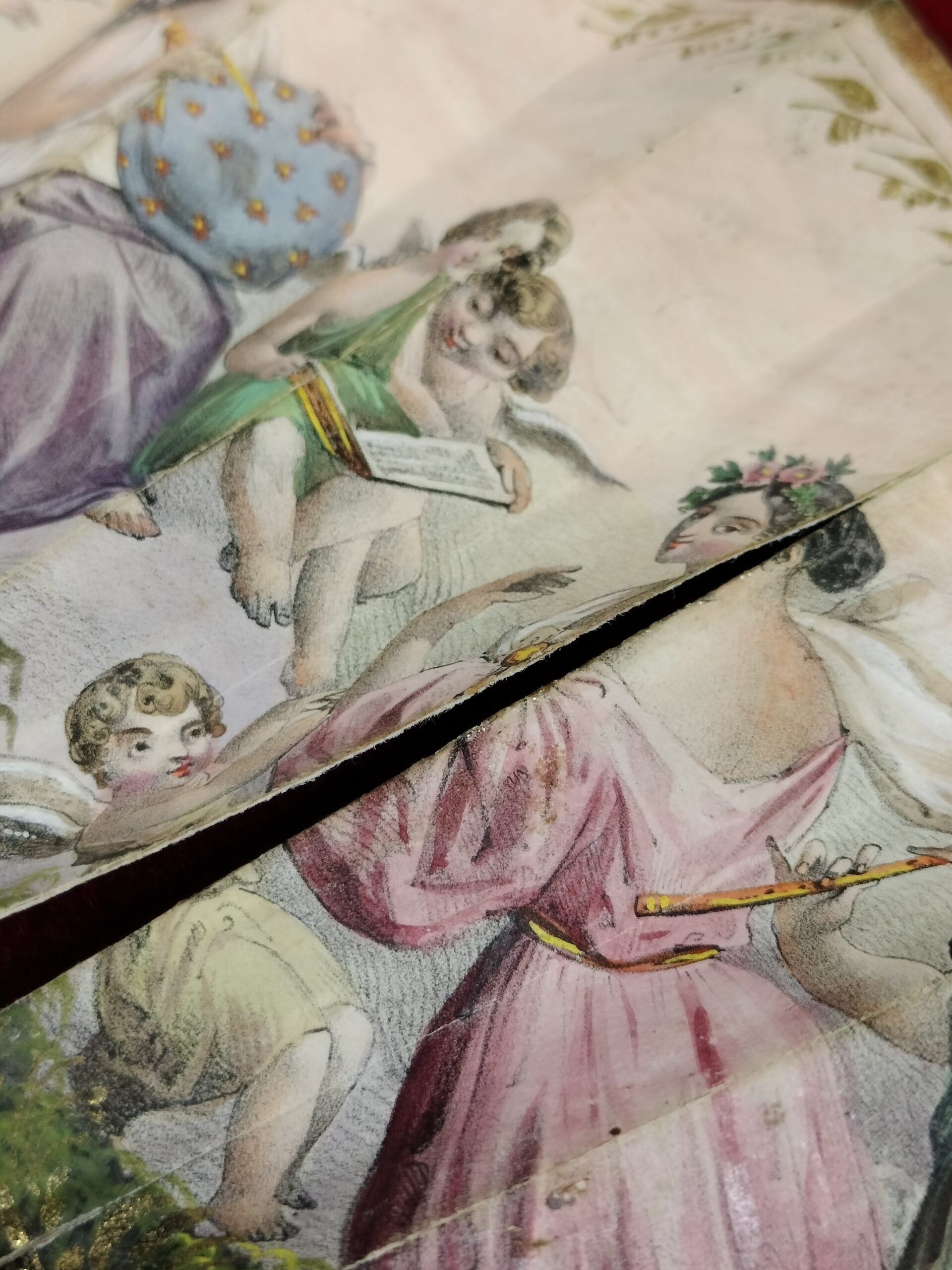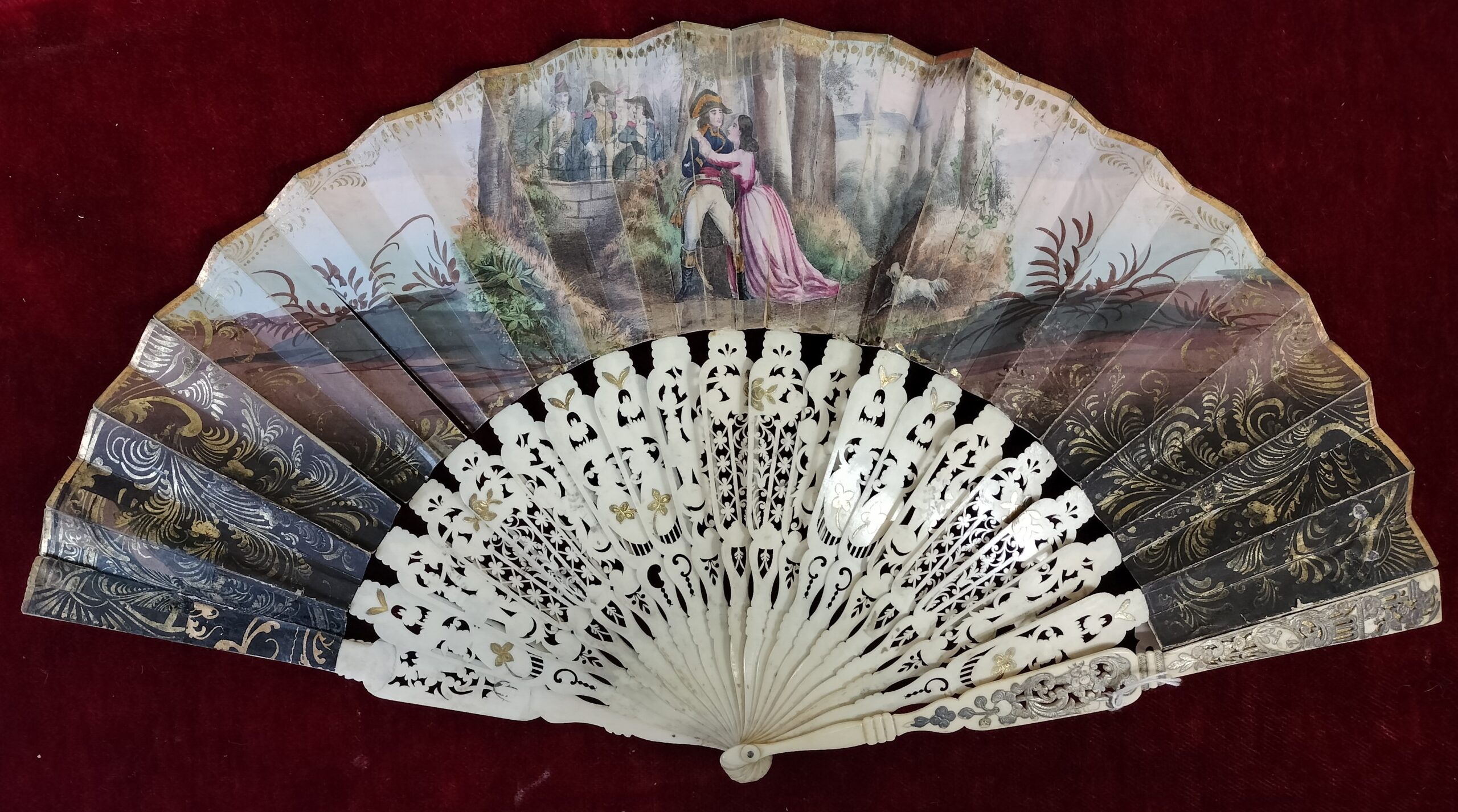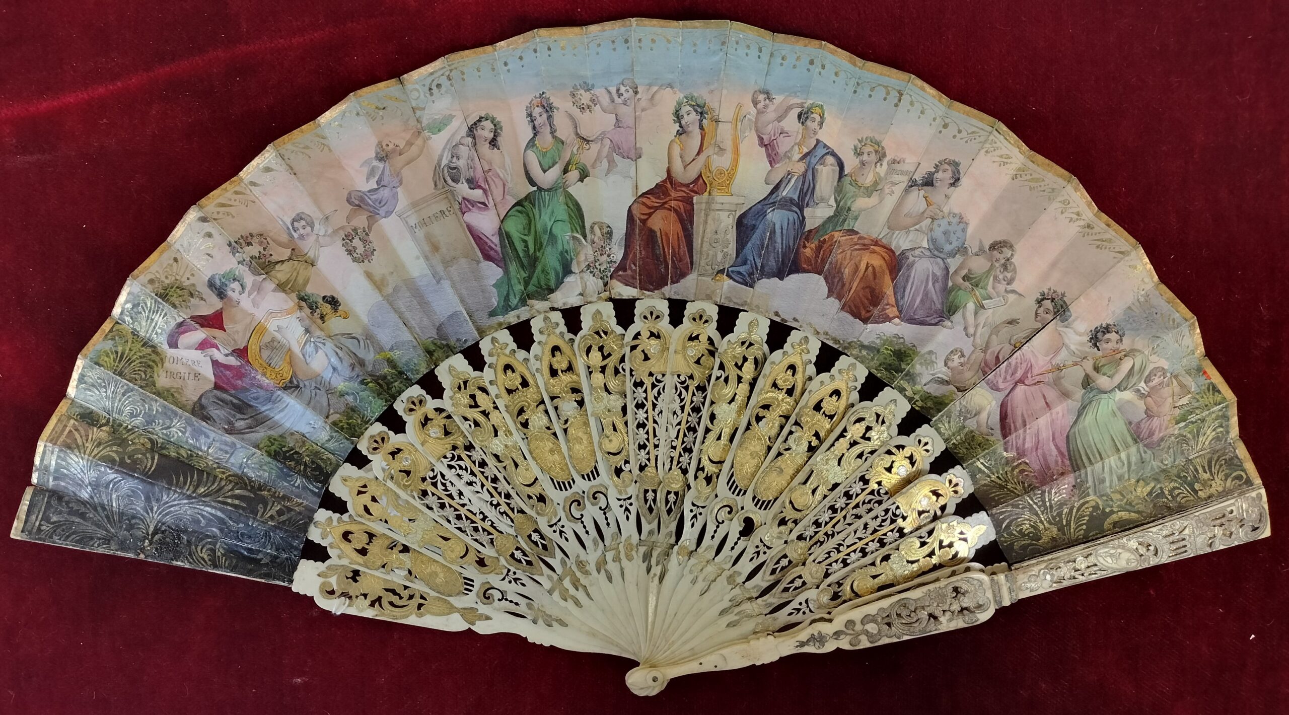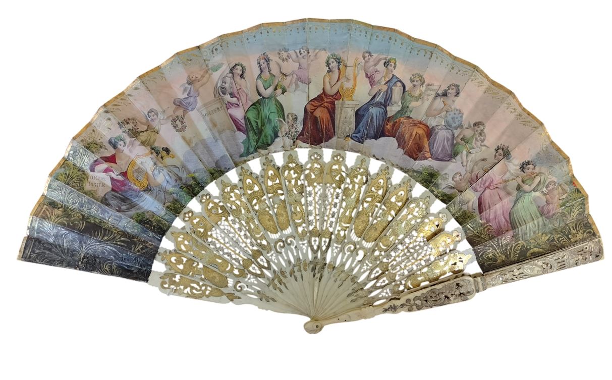 VER IMÁGENES PARA COMPROBAR EL ESTADO REAL.  LAS IMÁGENES FORMAN PARTE DE LA DESCRIPCIÓN.  ANTIGUO ABANICO ISABELINO.  VARILLAJE DE HUESO POLICROMADO – DORADOS Y PLATEADOS – Y PAPEL PINTADO A MANO.  SIN FIRMA NI MARCA DE AUTOR APARENTE.  DECORADO CON ESCENAS.  – ANVERSO: ESCENA DE CARÁCTER MITOLÓGICO, CON LAS FIGURAS DE LAS MUSAS GRIEGAS.  – REVERSO: ESCENA CORTESANA. MUJER CON GENERAL DE ÉPOCA NAPOLEÓNICA.  BUEN ESTADO GENERAL, LIGEROS DESGASTES. ROTURA EN EL PAPEL.  50,5 CM ANCHO (DESPLEGADO). 26,5 CM LARGO.