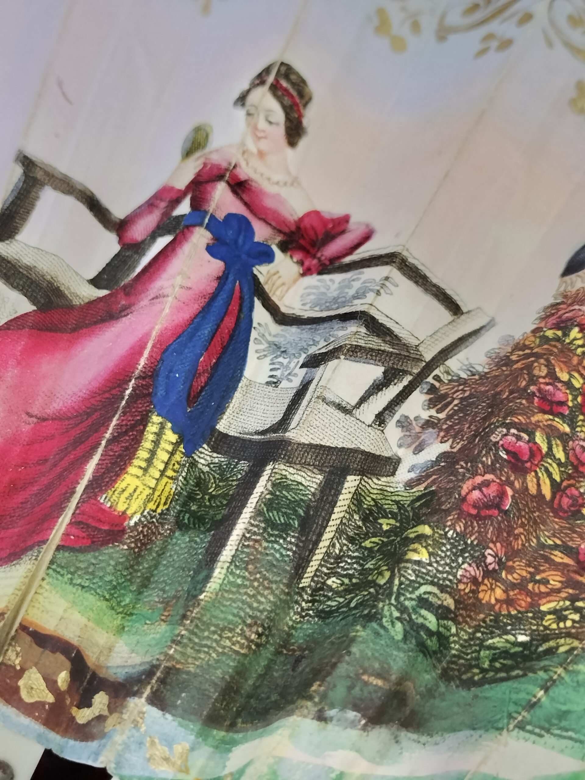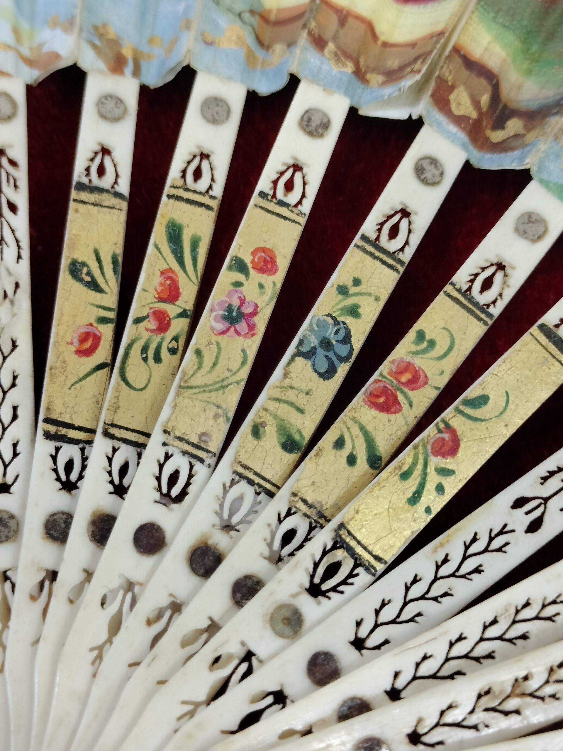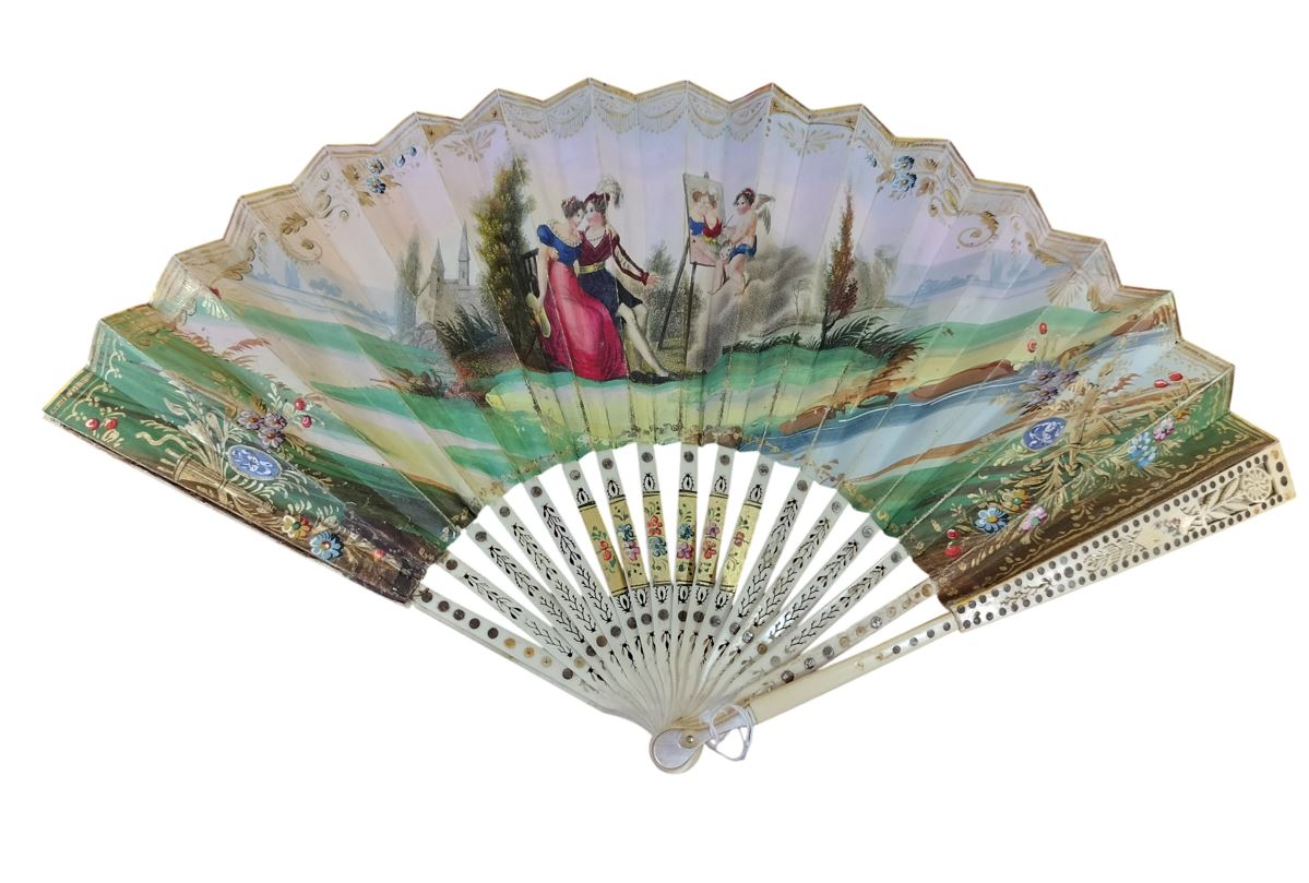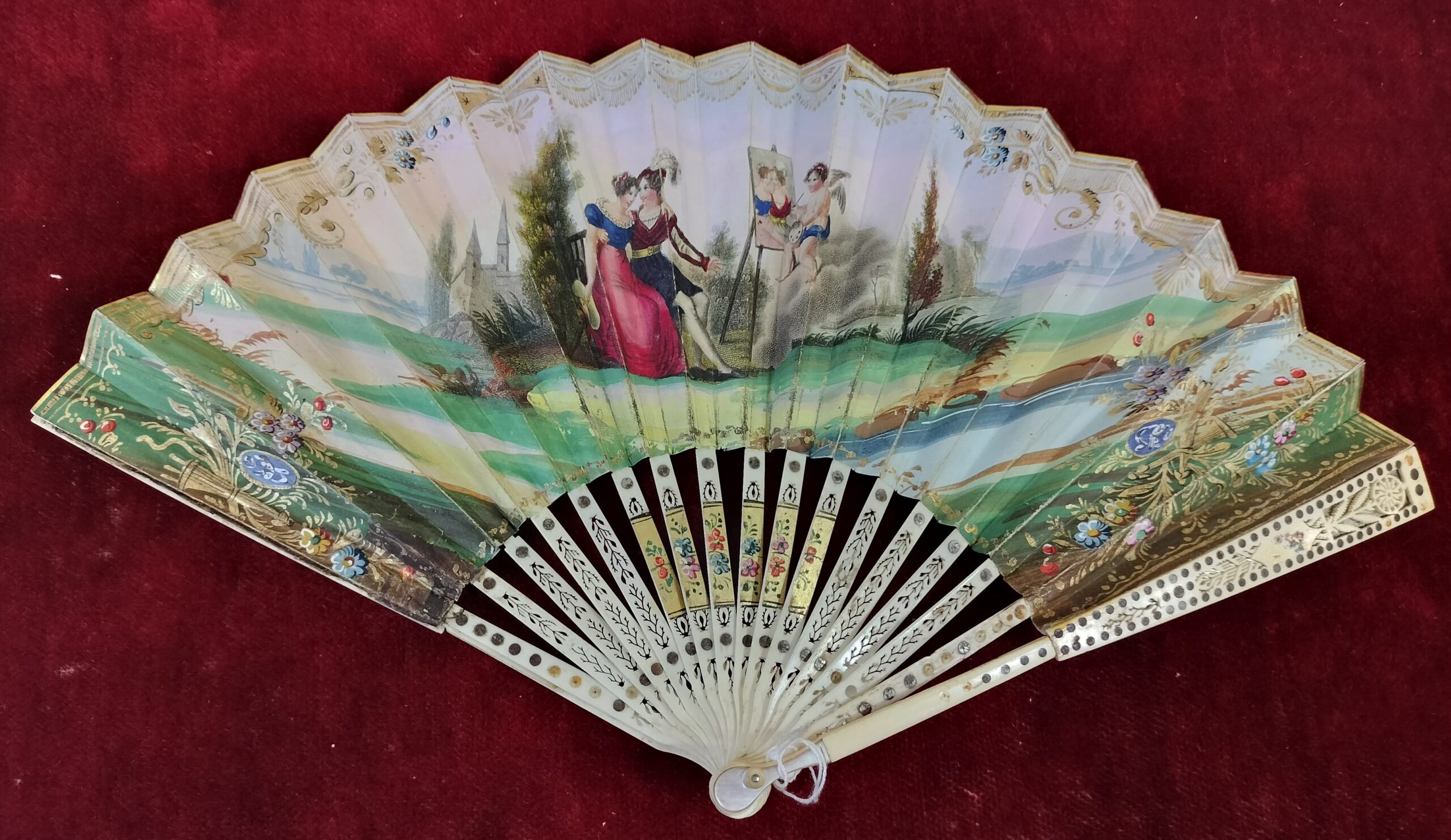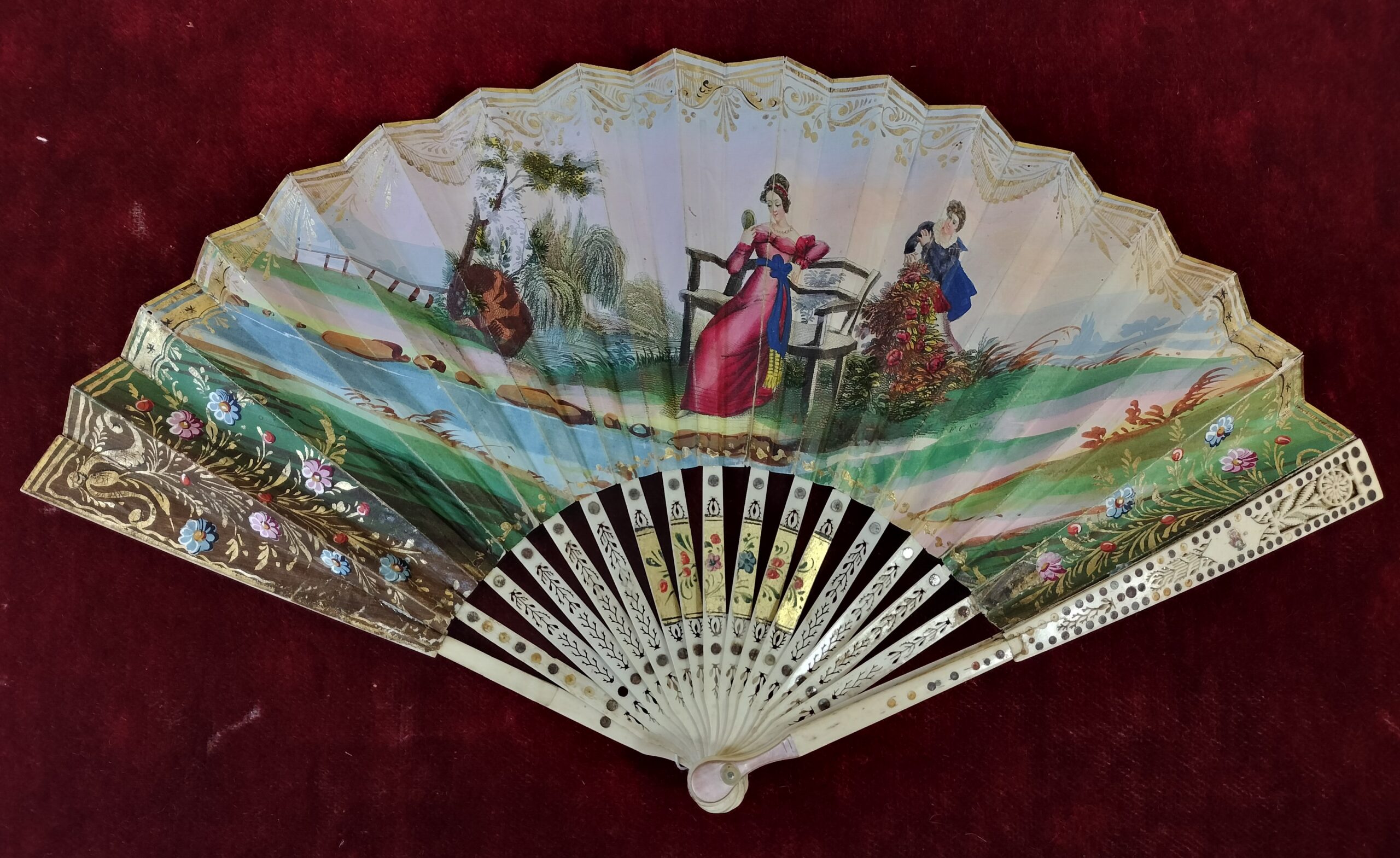 PEQUEÑO ABANICO ISABELINO CON ESCENAS BUCÓLICAS. HUESO Y PAPEL PINTADO A MANO. ESPAÑA. XIX.