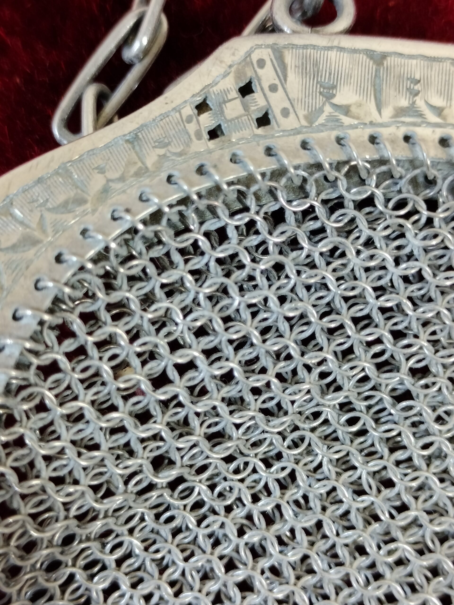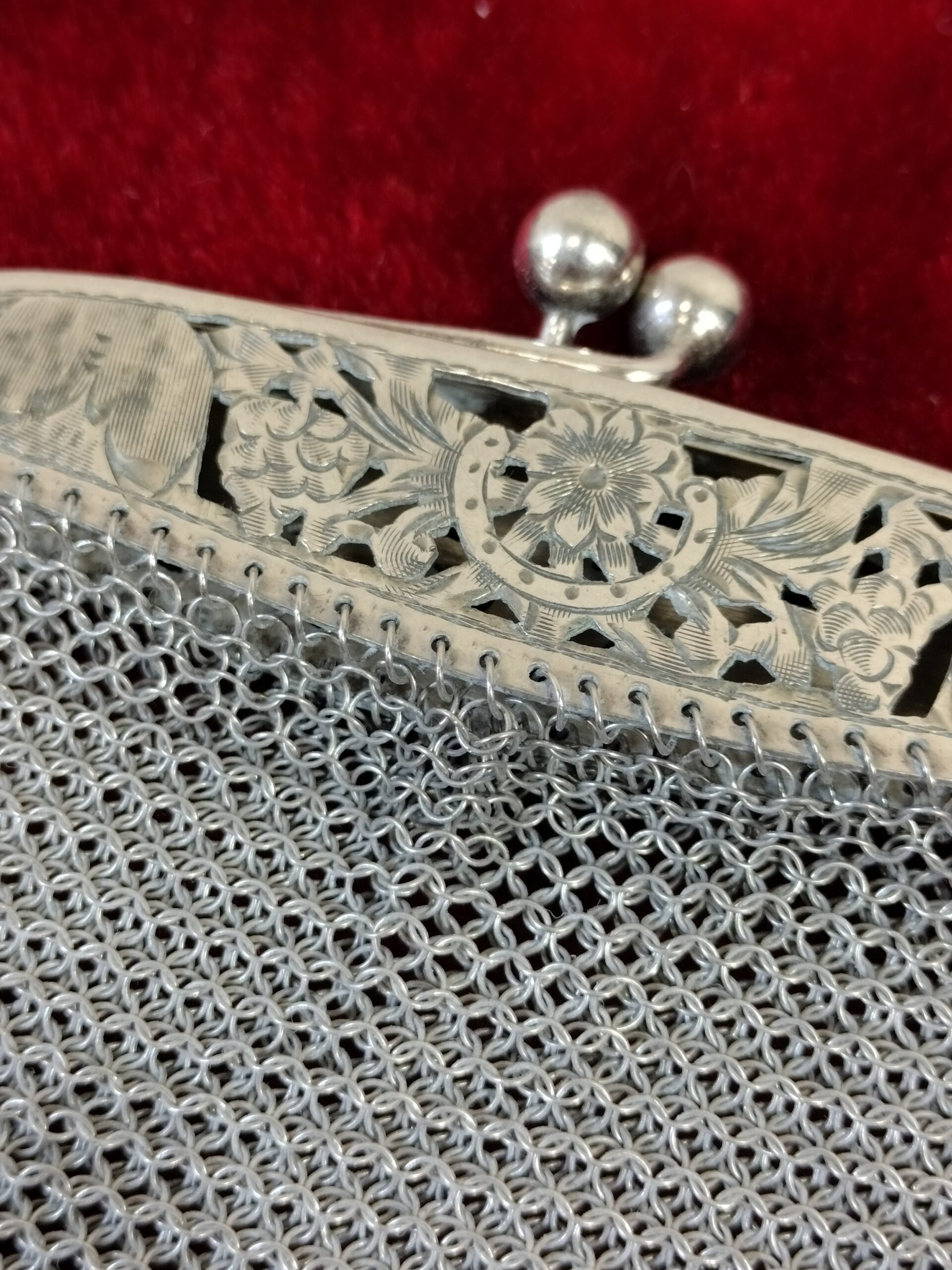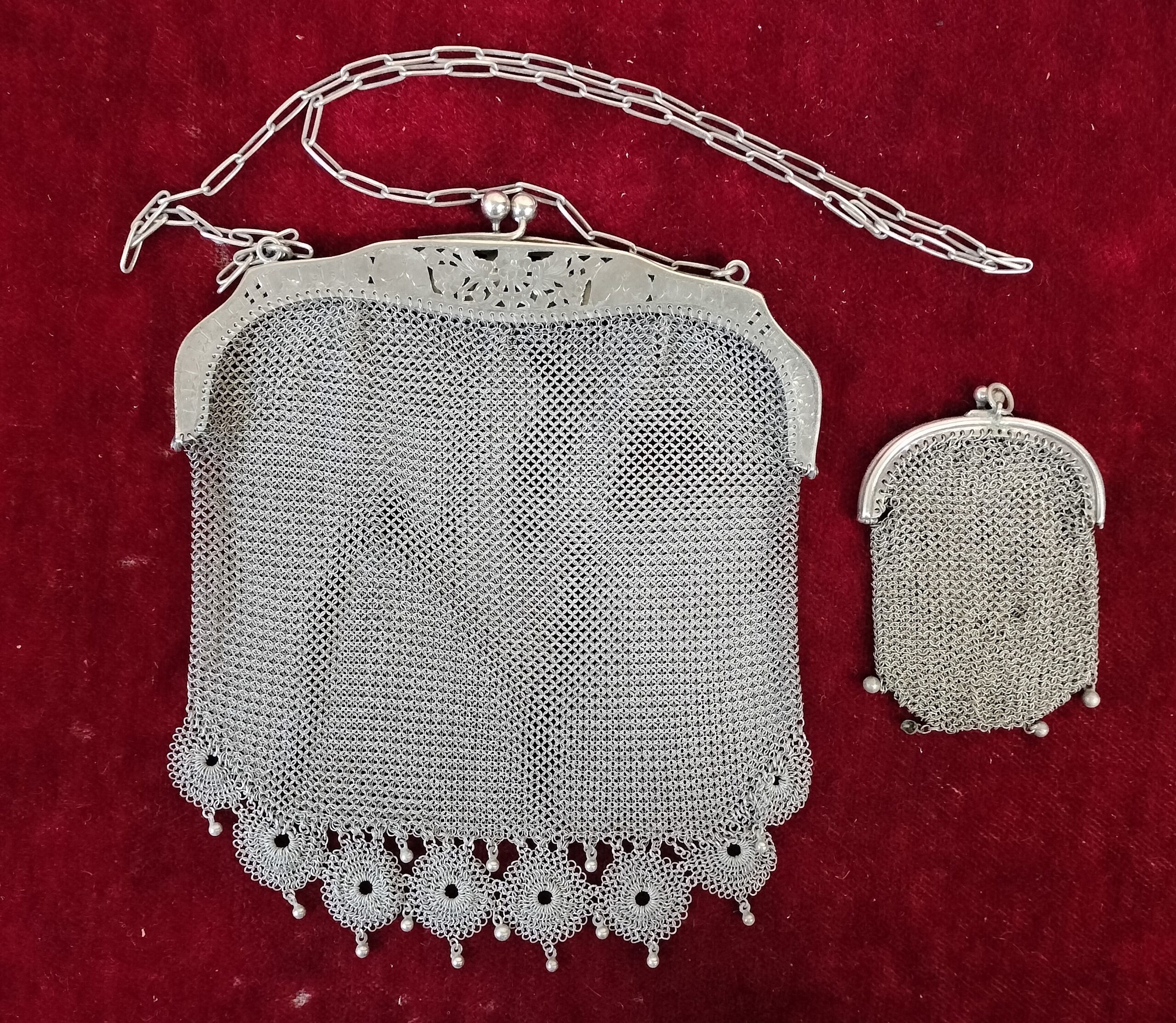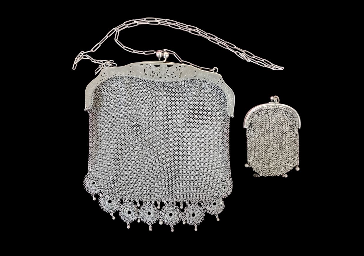 BOLSO Y MONEDERO DE MALLA DE PLATA. CALADA CON MOTIVOS VEGETALES. ESPAÑA. SIGLO XX.