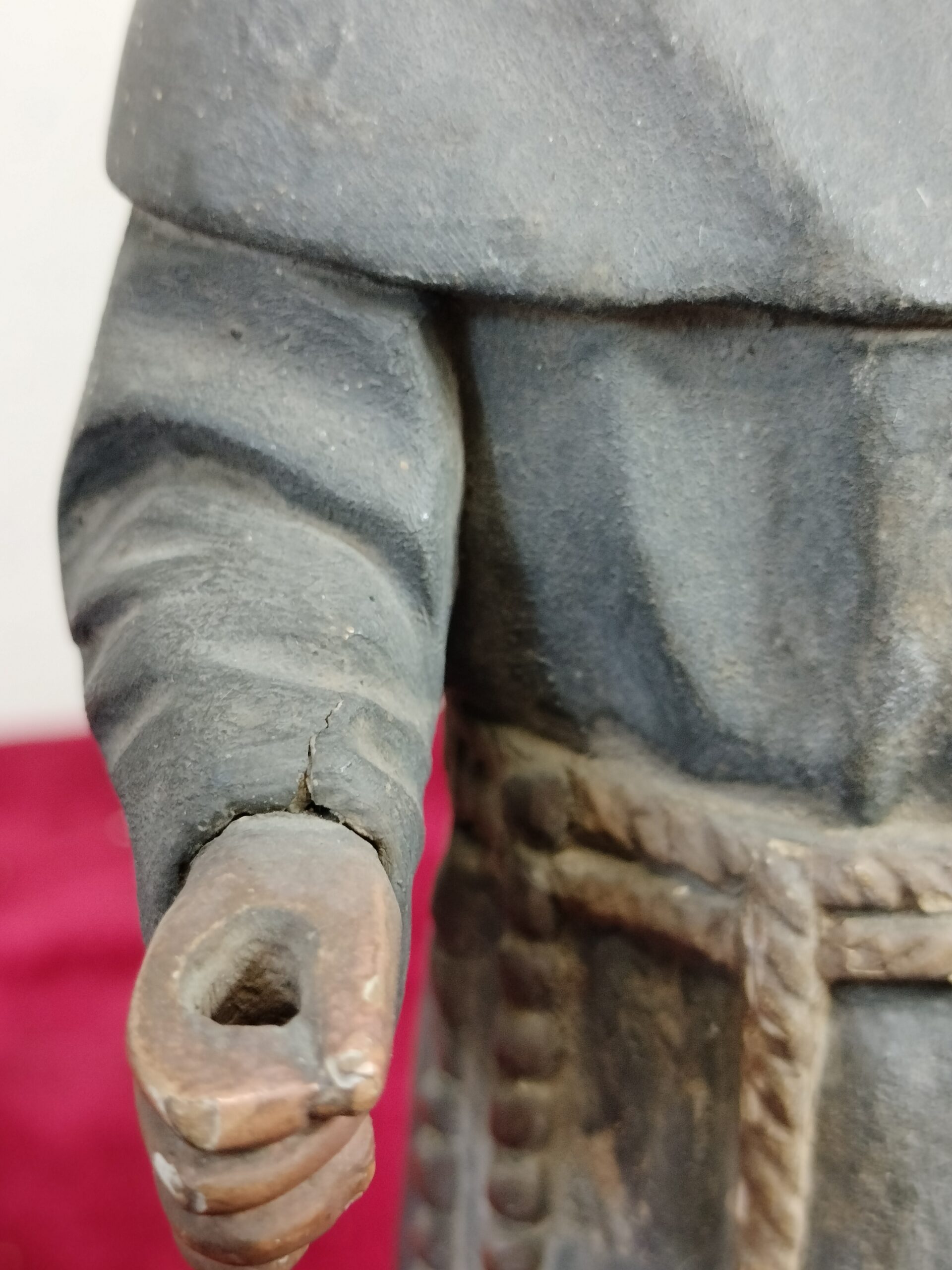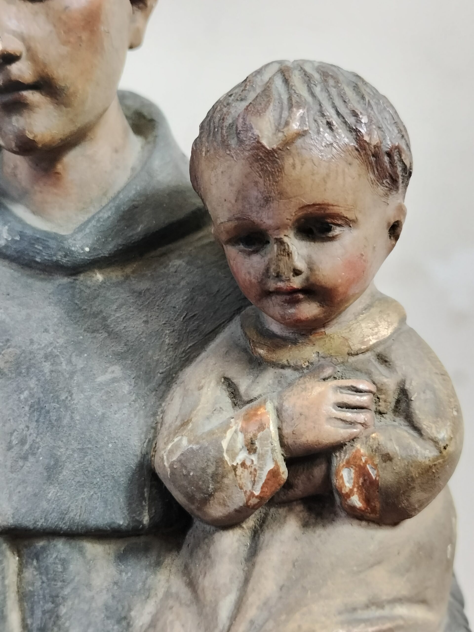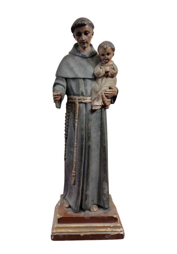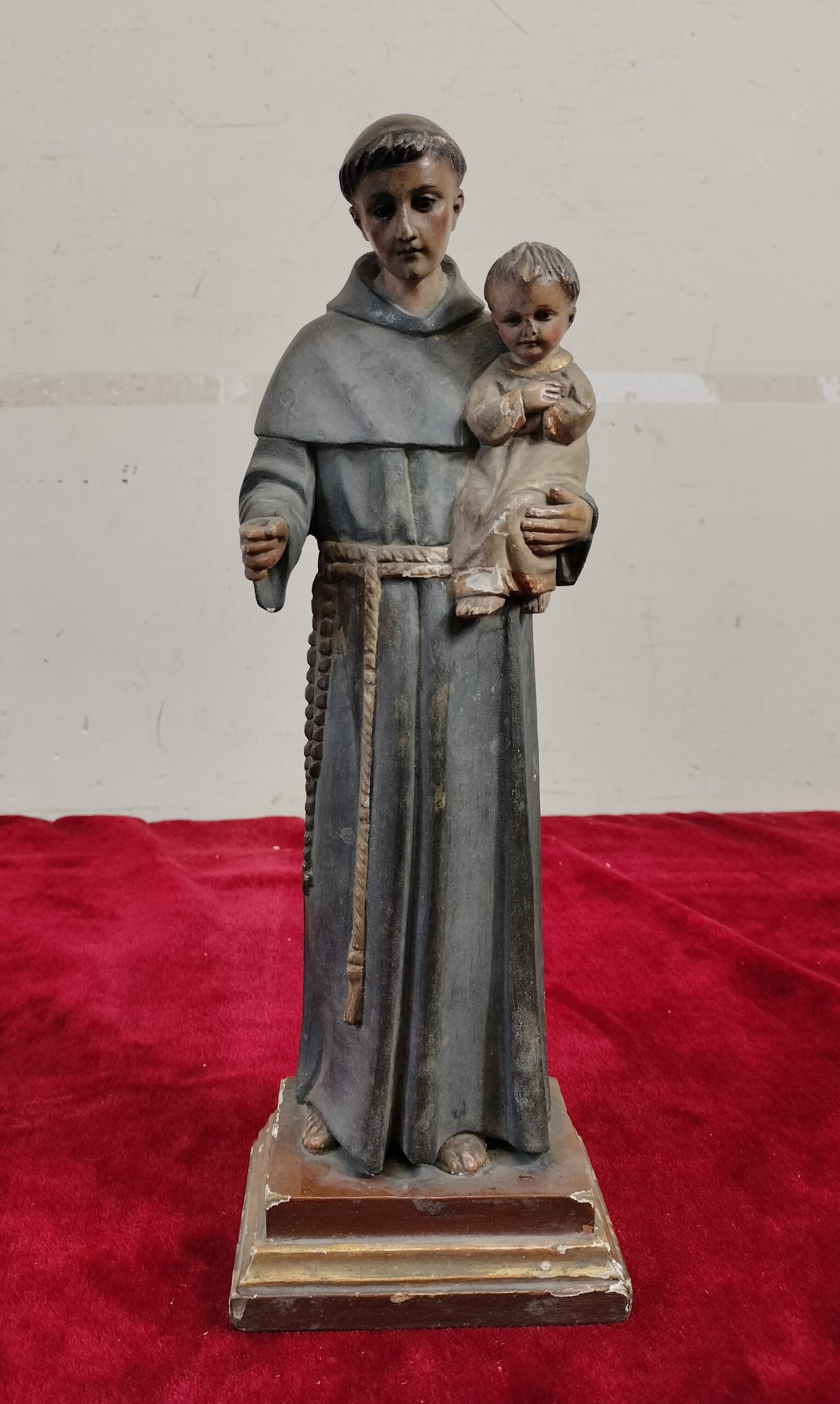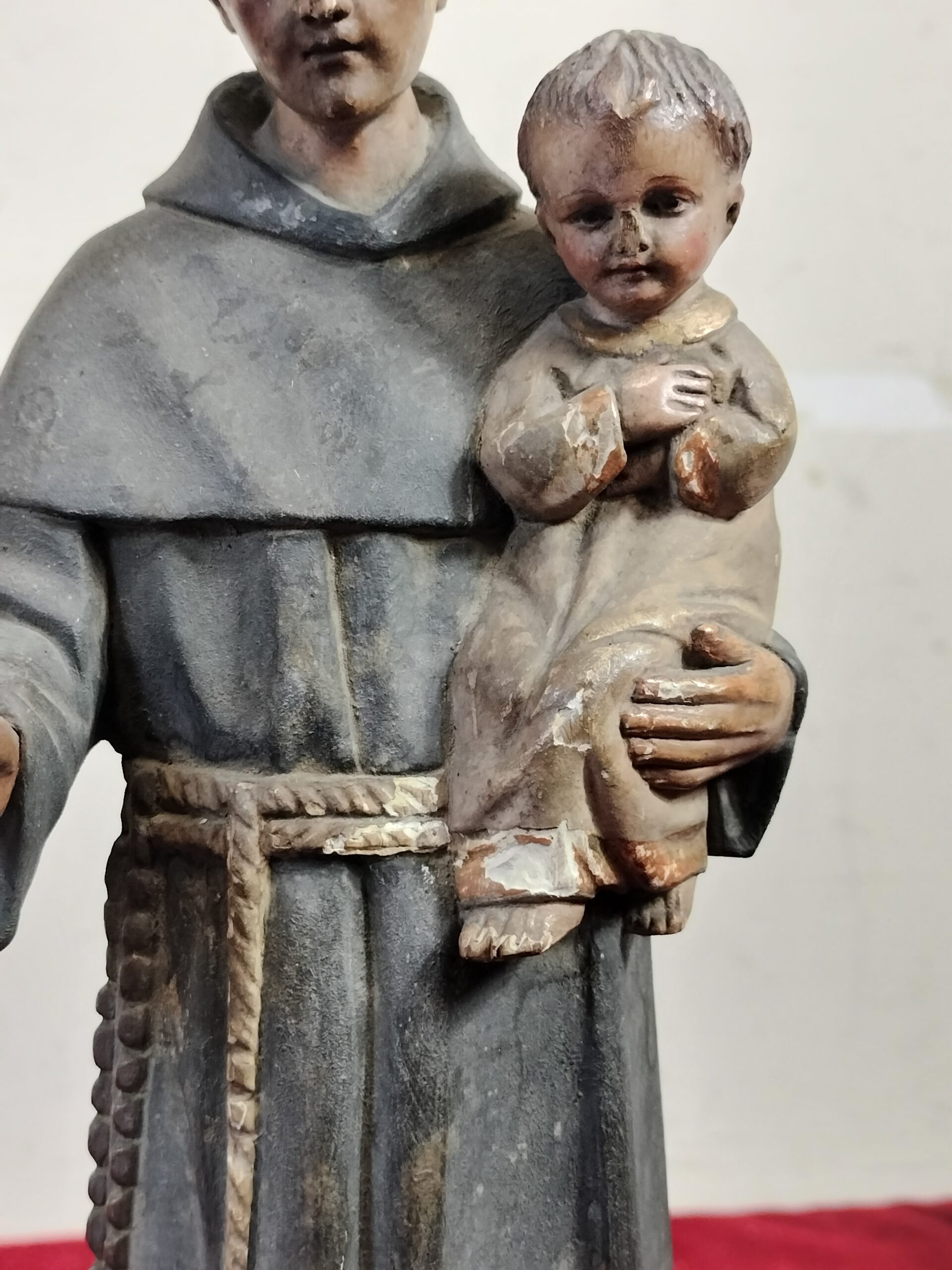VER IMÁGENES PARA COMPROBAR EL ESTADO REAL. LAS IMÁGENES FORMAN PARTE DE LA DESCRIPCIÓN. SAN ANTONIO DE PÁDUA CON EL NIÑO. SIN FIRMA NI MARCA DE AUTOR. TALLA EN MADERA POLICROMADA. SIN PALMA NI NIMBOS. PRESENTA NOTABLES DESGASTES Y PÉRDIDAS DE PÁTINA. FRACUTRA EN LA MANO DE SAN ANTONIO DE PÁDUA Y EN LA NARIZ DEL NIÑO JESÚS. RESTOS DE SUCIEDAD. MEDIDAS: 34,5 CM ALTO. BASE: 11,5 ANCHO X 8 LARGO.